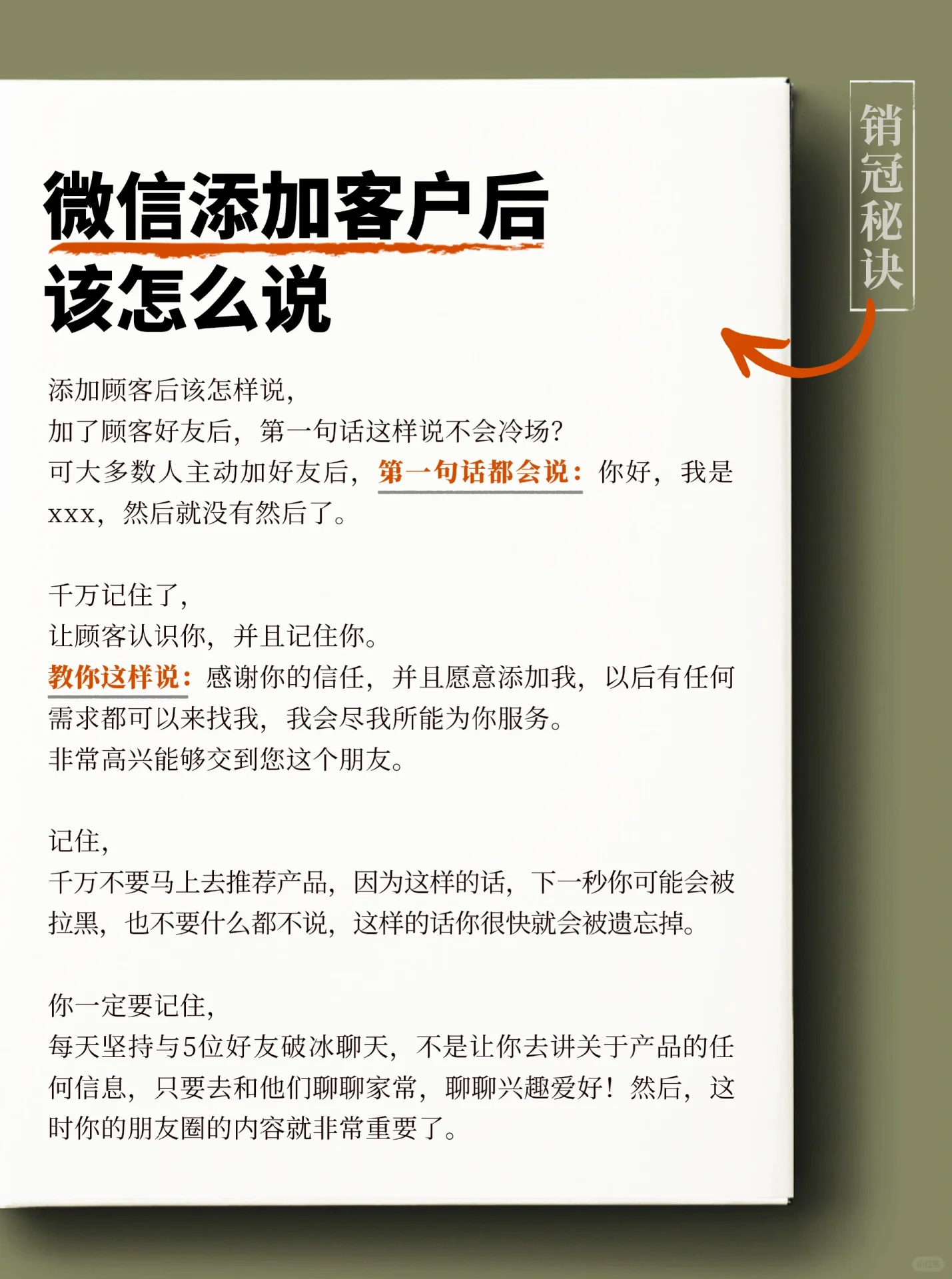 ? 添加了客户朋友后,第一句话怎么可能不会冷遇 ? 大多数人主动添加好友后,说的第一句话是:你好,我是xxx,然后就没有了。 记住,如果你想让客户了解你并记住你,它必须经过设计。 让我告诉你:谢谢你的信任和加入我的意愿。如果你将来有任何需要,你可以来找我,我会尽我所能为你服务。我很高兴能和你成为朋友。 ? 记住,不要立即推荐产品,因为在这种情况下,你可能会在下一秒被列入黑名单,也不要什么都不说,因为你很快就会被遗忘。 ? 坚持每天与5个朋友破冰聊天,不要求你分享任何关于产品的信息,只需与他们聊一聊日常生活、兴趣和爱好!然后,你的社交圈的内容变得非常重要。