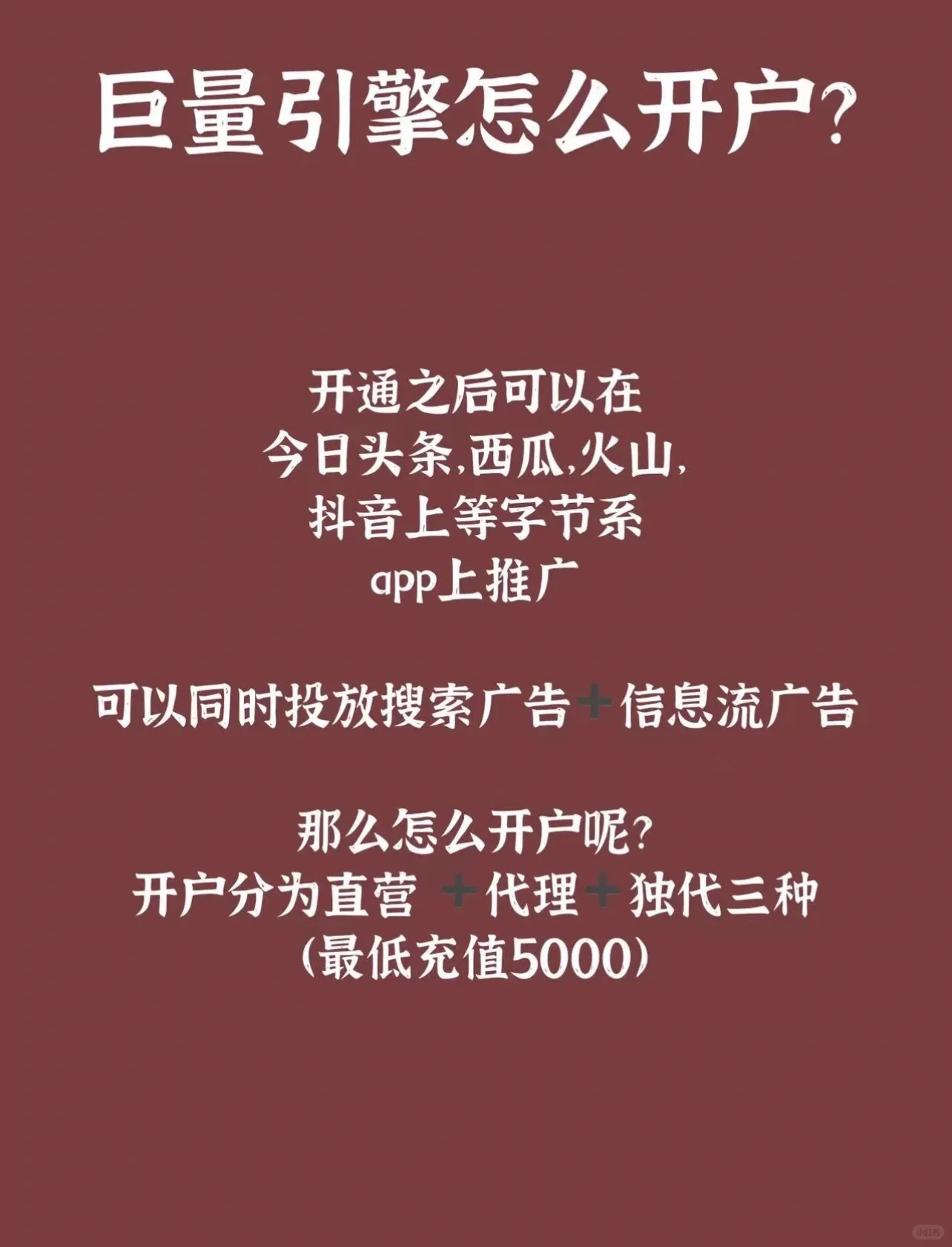 如何为一个巨大的引擎开户开户有三种类型 直销+代理+独家代理 最低充值额为5000元$ 上线后可以上线的平台有:今日吧+西瓜+抖音 +火山等 激活一个巨大的发动机需要什么材料优先响应拥有营业执照、公司账户和公司身份信息的粉丝