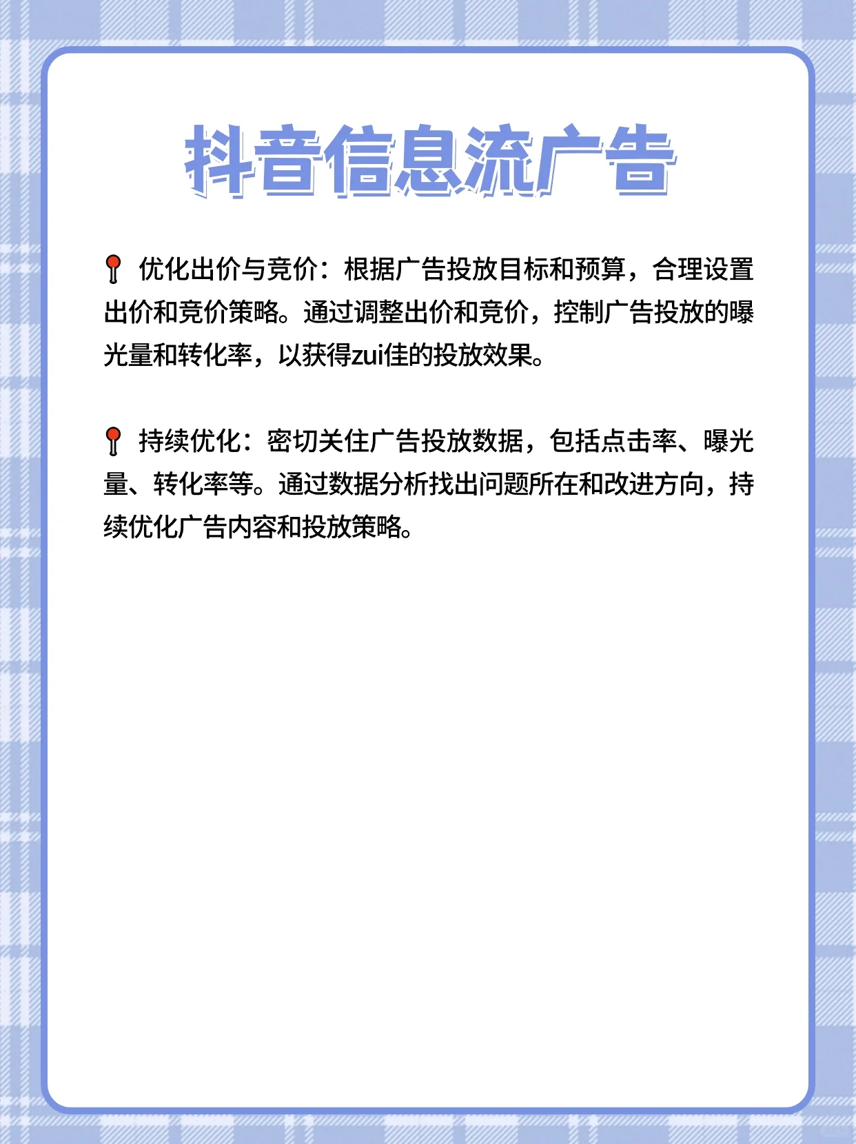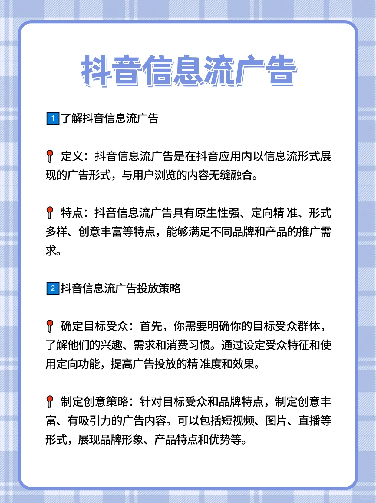 大家好!今天,我想和大家分享一下如何在抖音上投放信息流广告。作为一款热门短视频应用,抖音拥有数亿活跃用户。通过抖音信息流广告,你可以向大量潜在客户展示你的品牌或产品,提高品牌知名度、用户留存率和销售额。接下来,让我们进入抖音信息流广告的实践课程! 一️⃣ 了解抖音信息流广告 ? 定义:抖音信息流广告是在抖音应用内以信息流的形式呈现的广告形式,与用户浏览的内容无缝融合。 ? 特点:抖音信息流广告具有原创性强、定位准确、形式多样、创意丰富的特点,能够满足不同品牌、不同产品的推广需求。 二️⃣ 抖音信息流广告策略 ? 确定目标受众:首先,你需要确定你的目标受众,了解他们的兴趣、需求和消费习惯。通过设置受众特征和使用有针对性的功能,可以提高广告投放的准确性和有效性。 ? 制定创意策略:根据目标受众和品牌特征,开发富有创意和吸引力的广告内容。这可以包括短视频、图片、直播和其他形式来展示品牌形象、产品特征和优势。 ? 优化招投标:根据广告目标和预算,制定合理的招投标策略。通过调整出价和竞价,控制广告投放的曝光率和转化率,达到最佳投放效果。 ? 持续优化:密切监控广告投放数据,包括点击率、曝光率、转化率等。通过数据分析找出问题和改进方向,持续优化广告内容和投放策略。