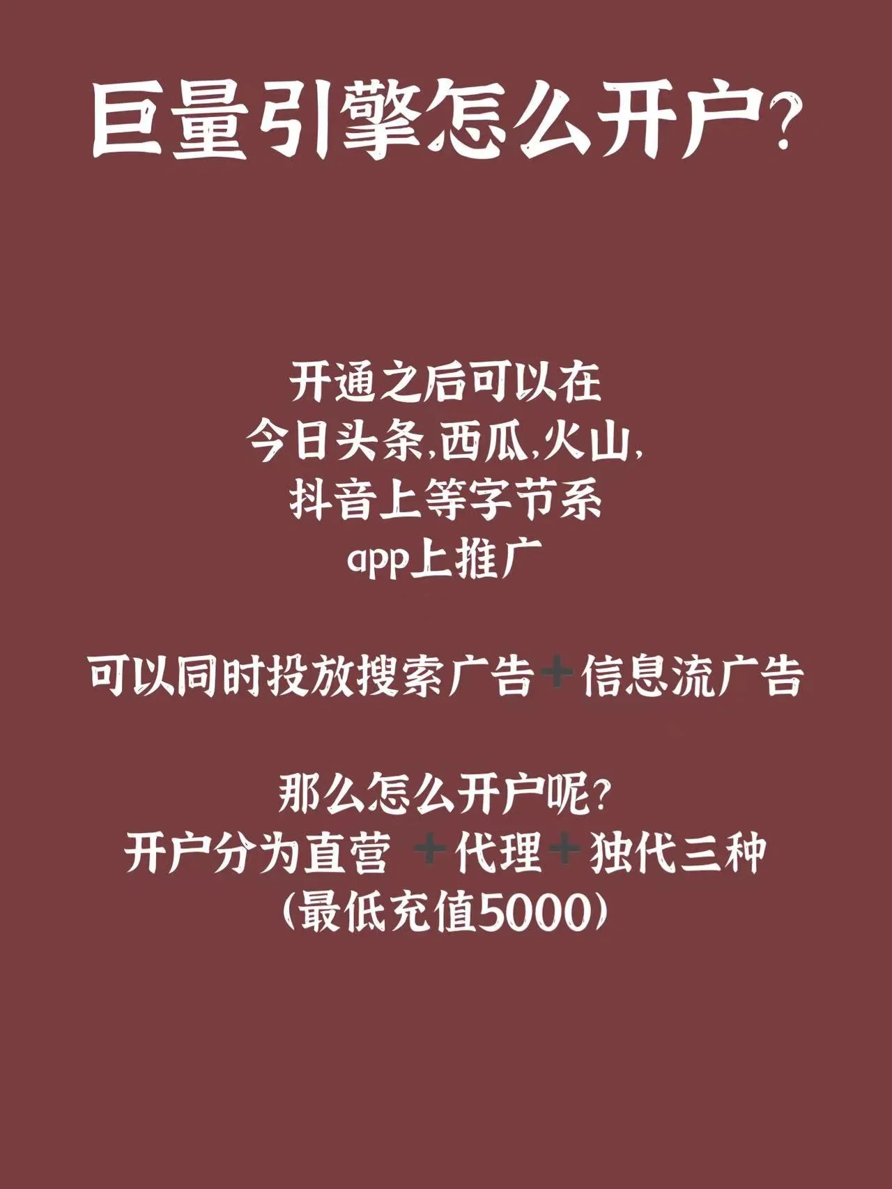 如何为一个巨大的引擎开户 开户有三种类型 直销+代理+独家代理 最低充值5000元 [稻草牵引R] 开通后可以上线的平台有:今日头条+西瓜+抖音+火山等 [失望的R]激活一个巨大的发动机需要什么材料 营业执照+企业账号+企业身份信息 如果你有任何问题,可以在评论区留言 优先回复粉丝