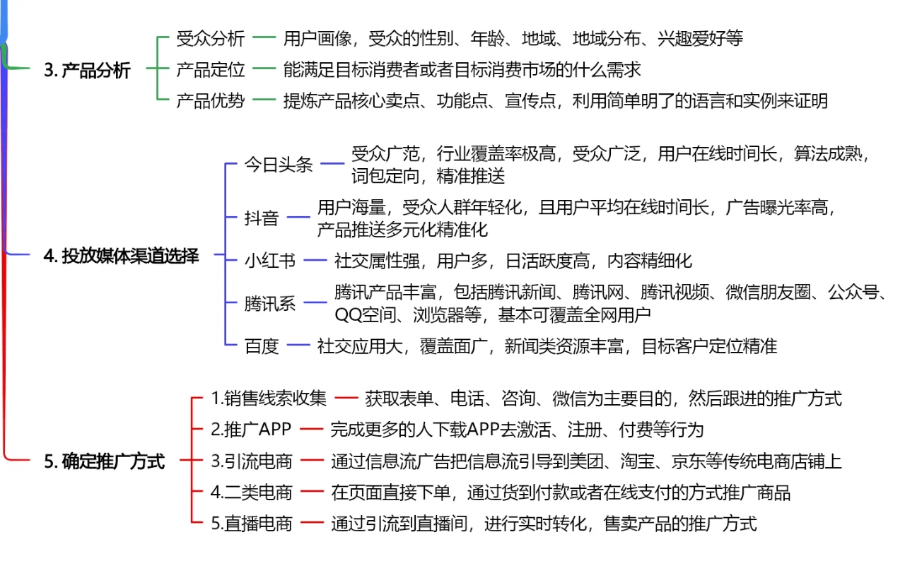 1、 什么是信息流广告 信息流广告,也称为原生广告,与正常社交媒体内容一样穿插内容流 2、 初步研究 通过收集用户标签和产品定位,建立用户档案,并根据不同类型的行为用户选择不同的受众导向,制定相应的广告策略 研究方向: 1.广告渠道及推广策略 2.平台推广预算及费用 3.转换目标是什么 4.你是否投资于应用程序下载、表格或支付 5.宣传材料类型:图片、视频 6.素材内容:口述、情景剧、动画效果、产品使用演示等 7.有线索的后续转化路径和用户管理策略 3、 产品分析 1.受众分析:用户简介、受众性别、年龄、地区、地域分布、兴趣爱好等 2.产品定位:目标消费者或目标消费市场能够满足哪些需求 3.产品优势:提取产品的核心卖点、功能点和促销点,并用简单明了的语言和例子加以证明 4、 广告媒体渠道选择 1.今日头条 受众广、行业覆盖率极高、受众广、用户在线时间长、算法成熟、有针对性的文字包、精准的推送通知 2.抖音 庞大的用户群,年轻化的受众,平均在线时间长,高广告曝光率,多元化精准的产品推广 3.小红书 社交属性强,用户多,日活跃度高,内容精细 4.腾讯系列 腾讯的产品种类繁多,包括腾讯新闻、腾讯。com、腾讯视频、微信朋友圈、公众号、QQ空间、浏览器等,基本可以覆盖全网用户 5.百度 社交应用量大、覆盖面广、新闻资源丰富、目标客户定位精准 5、 确定推广方式 1.收集销售线索 主要目的是获取表格、电话、咨询和微信,然后跟进促销方法 2.推广APP 完成更多人下载应用程序以激活、注册、支付和其他行为 3.吸引电子商务 通过信息流广告引导信息流向美团、淘宝、京东等传统电商 4.二等电子商务 直接在页面上下单,并通过货到付款或在线支付推广产品 5.直播电商 通过吸引流量到直播间进行实时转换来销售产品的促销方法
