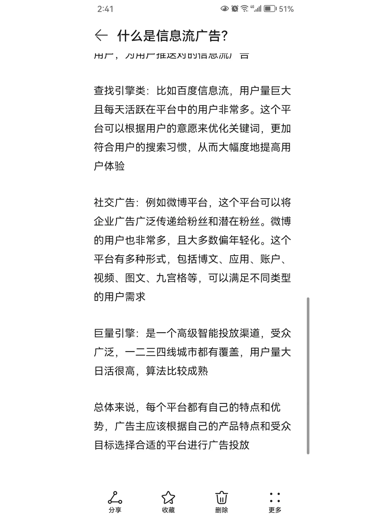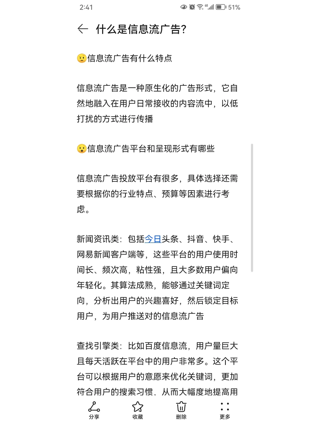 什么是信息流广告 信息流广告是一种特殊的广告形式,通常与内容混合,因此也称为原生广告。这类广告的特点是它看起来与普通内容非常相似。如果你不注意周围出现的“促销”或“广告”字样,你可能甚至不会注意到这是一个广告 信息流广告于2006年首次出现在社交媒体巨头脸书上,此后逐渐在全球流行。2011年,推特推出了一款商业信息流产品。2012年,信息流广告进入中国,微博、腾讯、今日头条成为最早采用这种广告形式的平台 信息流广告的特点是什么 信息流广告是一种原始的广告形式,它自然地融入用户日常生活中收到的内容流中,以低干扰的方式传播 [斜视R][斜视R]有哪些信息流广告平台和呈现形式 有很多信息流广告平台,具体的选择也需要根据你的行业特点、预算等因素来考虑。 新闻资讯:包括今日头条、抖音、快手、网易新闻客户端等,这些平台的用户使用时间长,频率高,粘性强,大部分用户更倾向于年轻化。它的算法是成熟的,可以通过关键词定位来分析用户的兴趣和偏好,然后针对用户为他们推送正确的信息流广告 搜索引擎类:例如,百度流量拥有庞大的用户数量,每天都有许多用户活跃在平台上。该平台可以根据用户喜好优化关键词,更符合他们的搜索习惯,大大提升了用户体验 社交广告:例如,在微博平台上,企业广告可以广泛传播给粉丝和潜在追随者。微博也有大量用户,而且大多数用户往往更年轻。该平台有多种形式,包括博客、应用程序、帐户、视频、图形和九格,可以满足不同类型用户的需求 海量引擎:覆盖一、二、三、四线城市,是一个受众广泛的先进智能广告渠道。用户基数大,日活跃度高,算法相对成熟 [金土豆R][金土豆R][金土豆R]总体而言,每个平台都有自己的特点和优势,广告商应该根据自己的产品特点和受众目标选择合适的平台进行广告投放