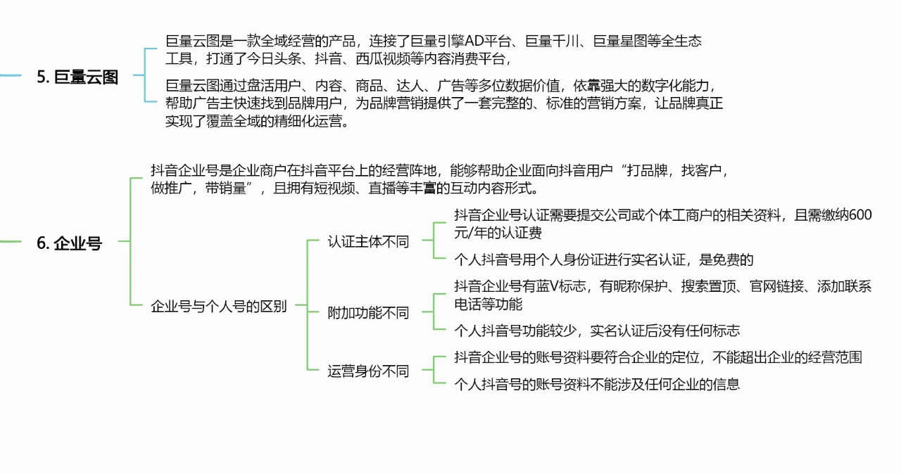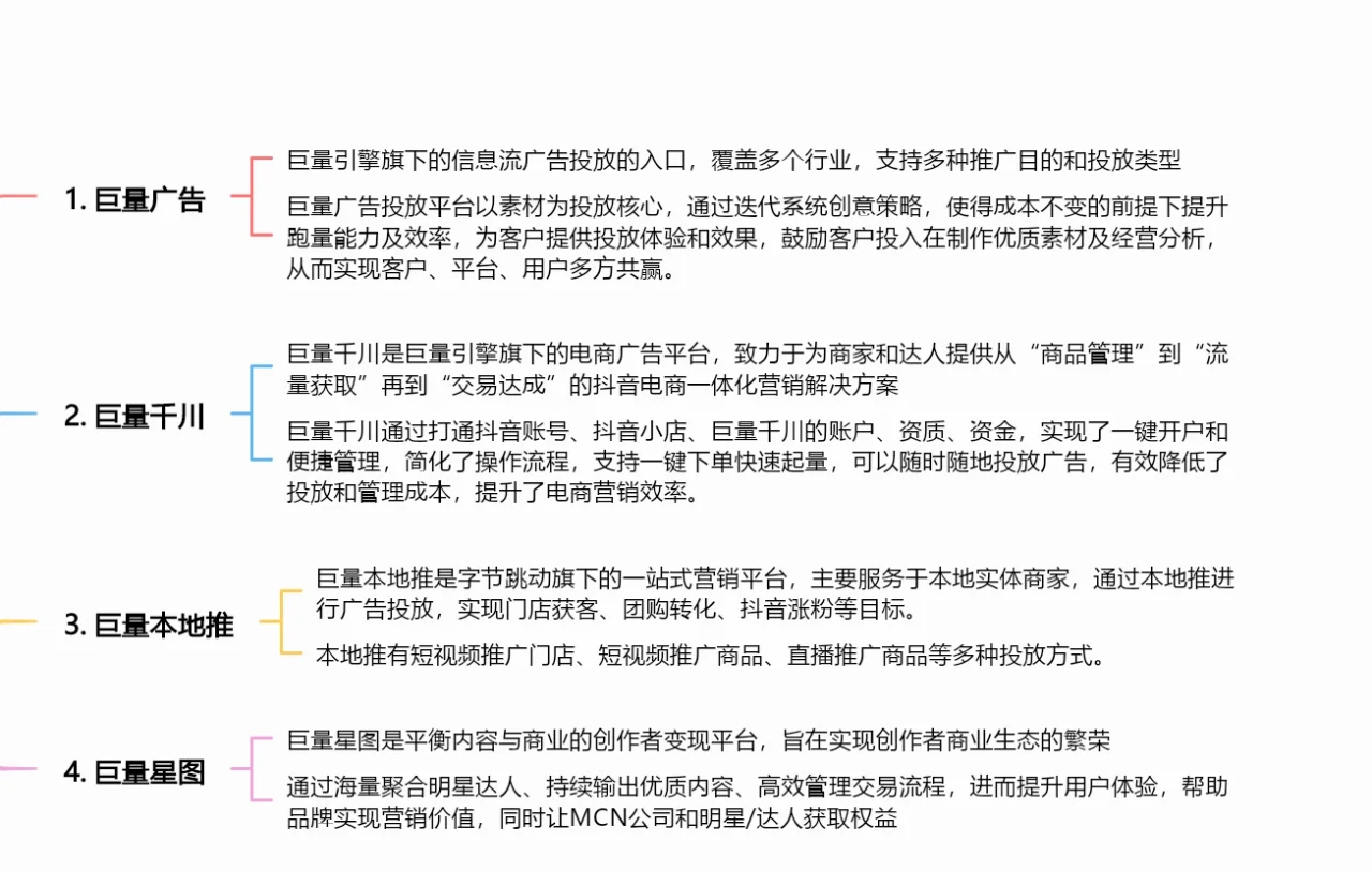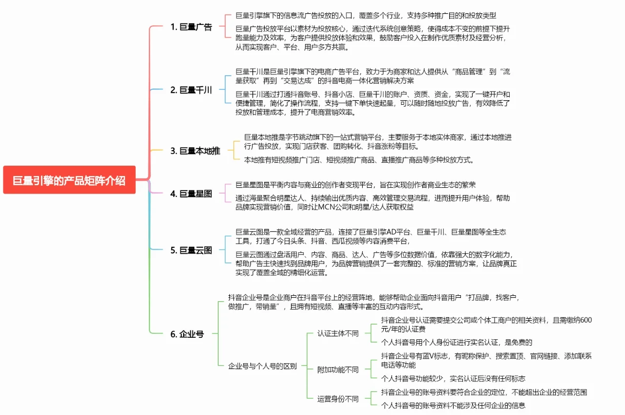 1、 大规模广告 巨人引擎下的信息流广告切入点,覆盖多个行业,支持多种推广目的和广告投放类型 2、 千河巨人 巨量千川是巨量引擎旗下的电商广告平台,致力于为商家和人才提供从“商品管理”到“流量获取”再到“交易完成”的抖音电商一体化营销解决方案 3、 大规模的本地推广 海量本地推送是字节跳动旗下的一站式营销平台,主要服务本地实体商户。通过本地推送,投放广告,实现门店获客、团购转化、抖音粉丝推广等目标。 4、 巨星地图 巨星图是一个平衡内容和业务的创作者货币化平台,旨在实现创作者商业生态系统的繁荣。通过聚集大量名人网红,持续输出优质内容,高效管理交易流程,增强用户体验,帮助品牌实现营销价值,让MCN公司和名人/网红获得权益 5、 海量云图 海量云地图是全球化运营的产物,连接海量引擎广告平台、海量千河、海量星图等全生态工具,连接今日头条、抖音、西瓜视频等内容消费平台 6、 企业帐户 抖音企业ID是企业商户在抖音平台上的业务位置。可以帮助企业给抖音用户“打品牌、找客户、推广、带销量”,拥有短视频、直播等丰富的互动内容形式 企业账户和个人账户之间的区别: 1.不同的身份验证实体 抖音企业号认证需公司或个体工商户提交相关信息,需缴纳600元/年的认证费 个人抖音号码使用个人身份证进行身份验证,免费 2.不同的附加功能 抖音企业ID具有蓝V标识、昵称保护、搜索置顶、官网链接、添加联系电话等功能 个人抖音号的功能很少,实名认证后没有签名 3.不同的运营身份 抖音企业号的账号信息应符合企业定位,不得超出企业经营范围 个人抖音号账号信息不能涉及任何企业信息