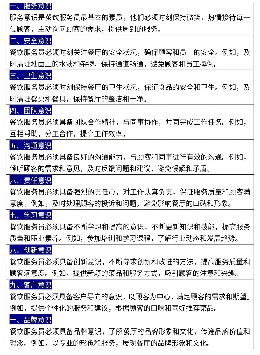 服务意识 优质的服务态度是餐饮员工必备的基本素质。他们需随时保持微笑,热情欢迎每位顾客,积极了解需求并提供周全的服务。 安全意识 餐饮工作人员需时刻注意餐厅的安全,以确保顾客和员工的安全。例如,必须及时清理地面上的水渍和杂物,确保通道畅通,以避免顾客和员工摔倒。 卫生意识 为了确保食品安全和卫生,餐厅员工必须时刻保持工作环境整洁,例如及时清洁餐桌和餐具,保持餐厅整洁干净。 团队意识 餐饮员工需具备团队合作意识,与同事紧密合作,共同完成工作任务。例如,互相支持、分工合作,以提高工作效率。 沟通意识 餐饮工作人员需要有好的沟通能力,在与顾客和同事互动时进行有效沟通。比如,倾听顾客需求和看法,及时回应问题和建议,以避免误解和冲突。 责任感 餐饮员工需要有高度的责任感,在工作中勤奋负责,保证服务质量和客户满意度。比如,要及时处理客户的投诉和问题,避免对餐厅声誉和形象造成负面影响。 学习意识 餐饮员工需要保持不断学习、持续改善的态度,不断充实知识、提升技能,以提高服务和专业素养水平。例如,参加培训和课程学习,关注行业发展动向。 创新意识 餐厅员工需要保持创新意识,不断探索创新和改进之道,以提升服务水平和顾客满意度。举例来说,推出独特菜品和服务方式,吸引顾客的关注和兴趣。 客户意识 餐饮工作人员需具备以客户为中心的思维,全心满足客户的需求和期望。比如,提供量身定制的服务和建议,结合客户口味和喜好推荐菜品。 品牌知名度 餐饮员工需具备品牌意识,熟悉餐厅的品牌形象和文化,传达品牌的价值理念。比方说,展示餐厅的品牌形象和文化时应展现专业形象和提供专业服务。