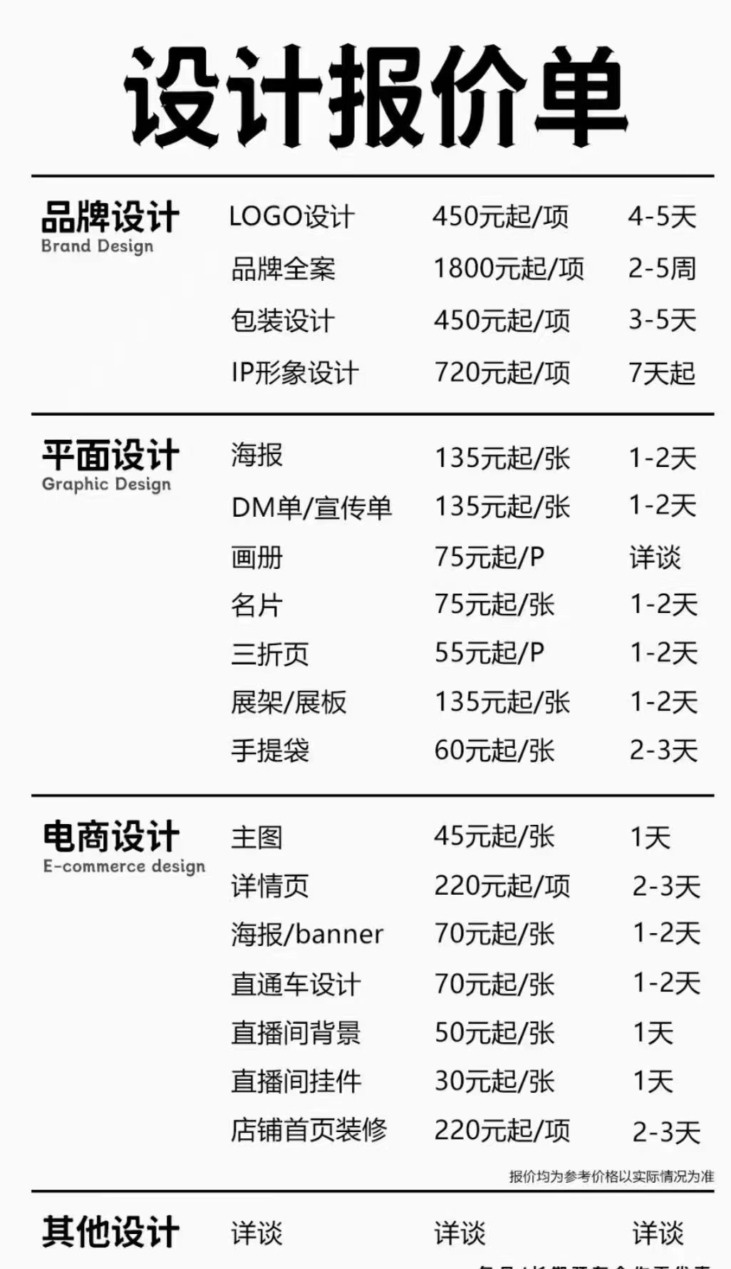 多年的工作经验,从事平面、广告、电商,熟悉各类设计软件,Ps,AI,等,现在大环境其实也不好找工作,利用空闲时间兼职做点副业增加点收入。 电商设计 平面设计 新媒体设计 还有视频剪辑 目前整理了一部分报价单,仅供参考 希望各位老板给个机会,有各种需求尽管砸过来吧。