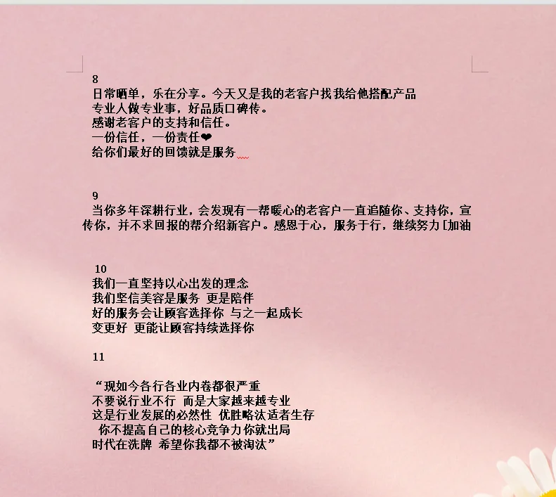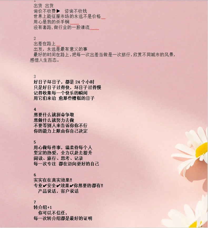 一 运输 能征服世界市场的永远不是价格 心是我的王牌 不耍花招,做行业的清流 二 出差路上 出发总是最有意义的事情 最好的时间是在路上,把每一次出差都当作一次旅行,欣赏不同城市的风景,欣赏生活的多样性。 三 好日子和坏日子都是24小时 好日子过得快,坏日子过得慢 记得收集每一个快乐的时刻 用它们来治愈那些糟糕的日子 四 拼命争取你想要的 努力做你想做的事 不要等别人告诉你你做不到 你的能力极限由你决定 五 用心做事,温柔待人 坚定不移的爱和全心全意的努力来提高自己 阅读、旅行、思考和录音 每次我们集中注意力,我们都在朝着更好的自己迈进 六 逼真和逼真的效果‼ 专业 安全 效应 你有你想要的一切‼ 产品谈话、客户谈话 七 简介+1 你可以不信任, 每一次推荐都是最好的证明 八 每天的订单分享是令人愉快的。今天,又是我的老客户来找我给他配产品了 专业的人做专业的事,传递良好的品质和声誉。 感谢我们的忠实客户对我们的支持和信任。 一个信任,一个责任 我能给你的最好的反馈就是服务 九 当你在这个行业深耕多年,你会发现一群暖心的老客户一直在追随你,支持你,推广你,帮助介绍新客户,而不期待任何回报。感恩在心,服务在行,继续努力[加油] 十 我们始终坚持从心出发的理念 我们坚信美丽不仅是一种服务,也是一种陪伴 良好的服务会让客户选择与您共同成长 做出改变可以更好地让客户不断选择你 十一 如今,各个行业和专业存在着严重的内部竞争 不要说这个行业不好,而是说每个人都变得越来越专业 这是行业发展的必然,优胜劣汰 如果你不提高你的核心竞争力,你就会被淘汰 时代在洗牌,希望你我都不会被淘汰