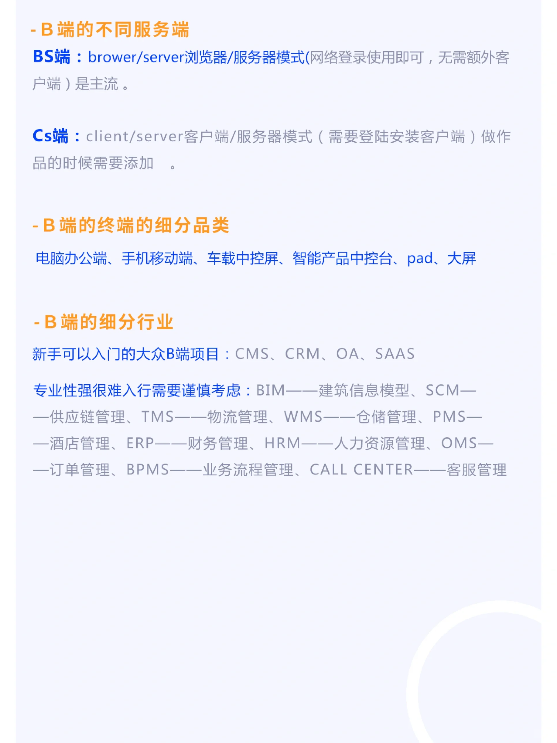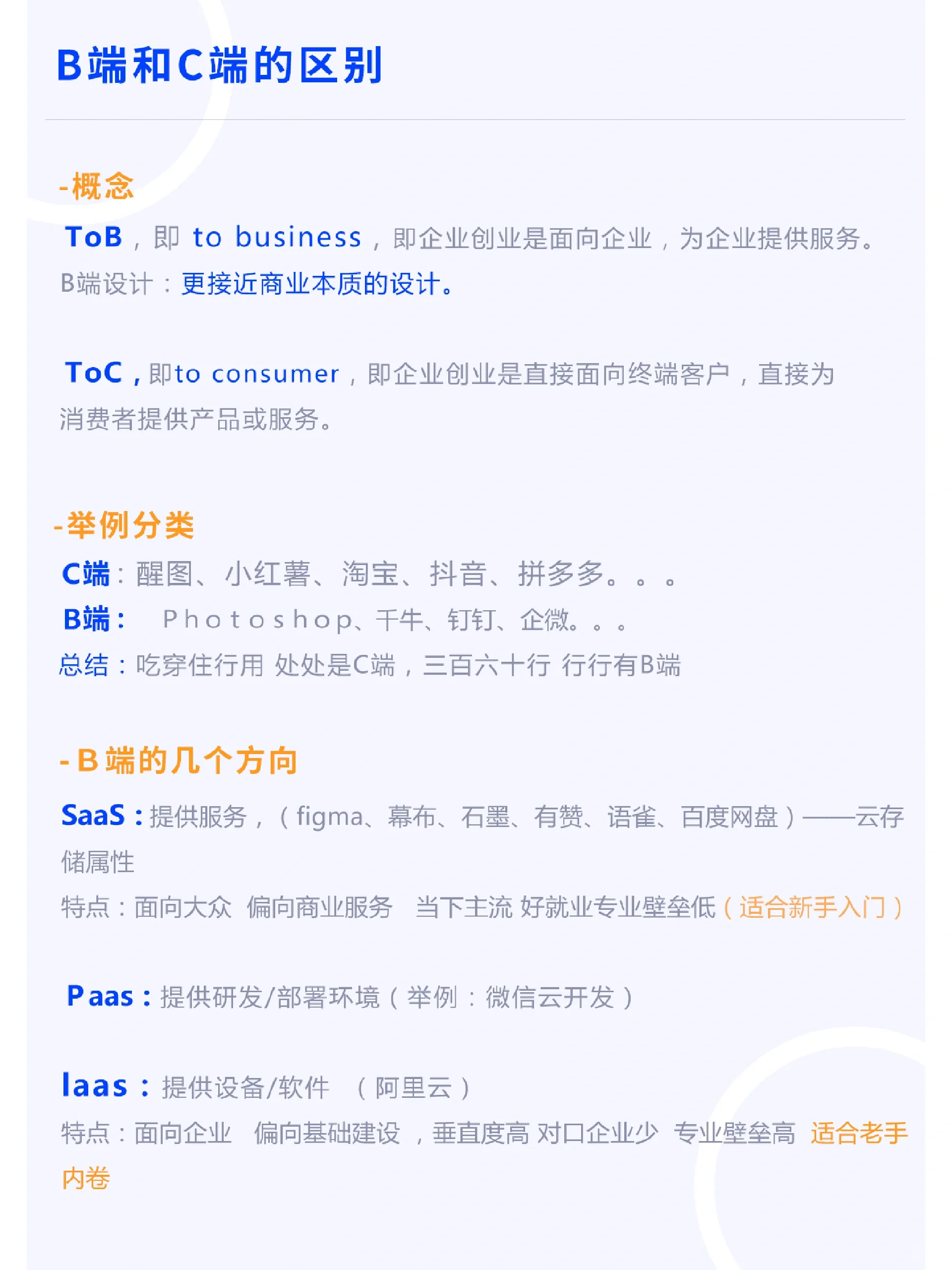 Q: B端UI设计究竟是什么它和C端有什么区别我现在做的事情适合从C端切换到B端吗 本说明对B端从概念到行业方向进行了详细介绍。你可以在未来的面试中详细了解它 概念: ToB,又称to business,是指创业和为企业提供服务的过程。 B端设计:更接近商业本质的设计。 ToC,也称为面向消费者,是指直接以终端客户为目标开展业务,并直接向消费者提供产品或服务的过程。 右R右R B端细分行业 SaaS:提供服务(figma、screen、石墨、有赞、Yuque、百度网盘)-云存储属性 特点:面向公众,偏向商业服务。目前,主流有利于就业,专业门槛较低(适合初学者) Paas:提供研发/部署环境(如微信云开发) laas:提供设备/软件(阿里云) 特点:专注于企业基础设施建设,配套企业垂直度高,专业少,墙高适合有经验的玩家入内