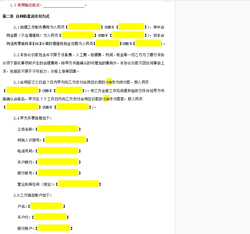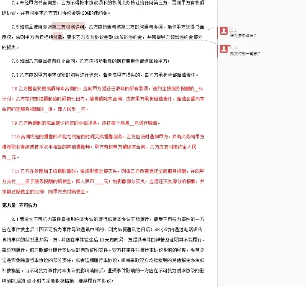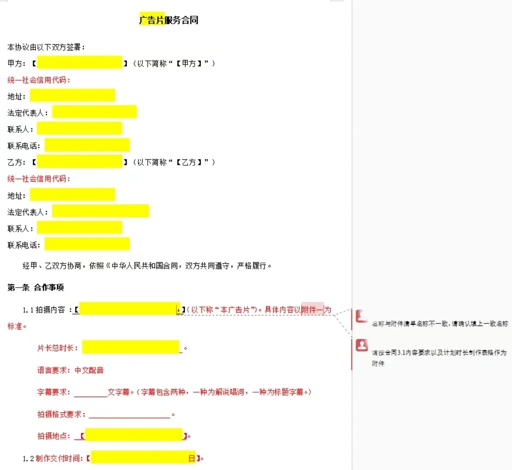 广告服务合同变更汇总表 第一步:审查合同,首先确认你是甲方还是乙方 只有确认自己的立场,才能确定自己代表的是哪一方的利益,以及对方的立场是否强硬。对方是否强势,也可以通过与销售代表的沟通来了解。只有掌握了修改的规模,才能修改具有较强可操作性的条款。 步骤2:查看整个合同并确定合同类型 例如,当我这次修改一份广告服务合同时,我使用合同模板来确定广告服务合同的标准框架,确认审查后的条款是否完整,找出任何漏洞,并澄清条款之间的逻辑。 第3步:完成框架并添加详细内容 作为第一方,仔细确认付款、验收、质量保证和违约责任尤为重要。有时,另一方提供的合同可能收取过高的违约金。我遇到了每天合同总金额1%的罚款,这是每天1%转化率的三倍多。这比高息贷款还要夸张。如果一个人对这些数字不敏感,如果他们的公司未来不及时付款,他们将使自己处于非常被动的状态。 不同类型的合同有不同的侧重点。如果你是初学者,建议像我一样复习模板,以确保整体框架没有错误。 对合同进行多次审查后发现,审查合同的逻辑基本相同。真正的差距在于实际谈判和诉讼过程中总结的经验。合同中的陷阱主要来自商业条款而非法律条款,因此经验尤为重要。 所附合同中的红色字体为补充框架内容