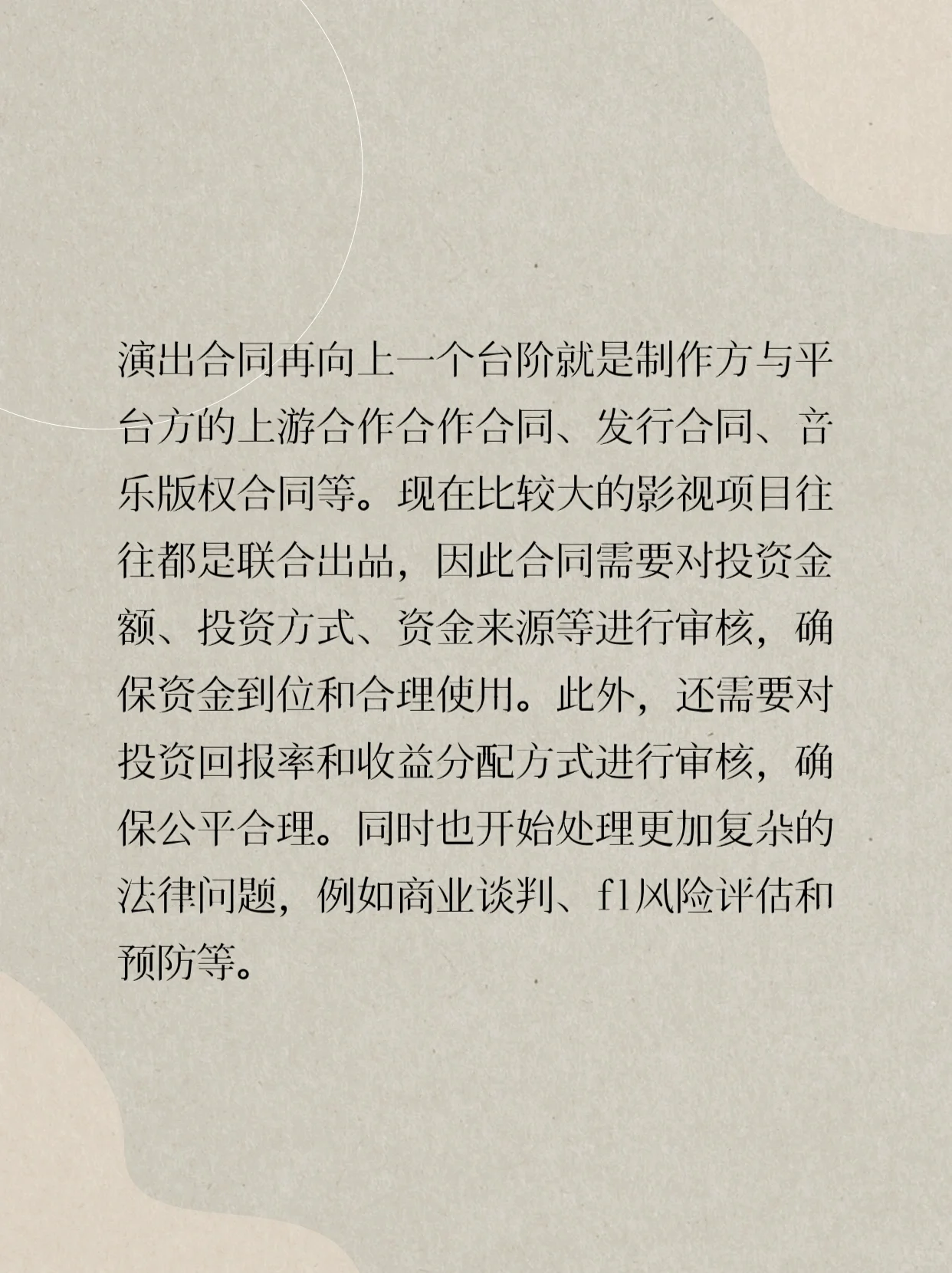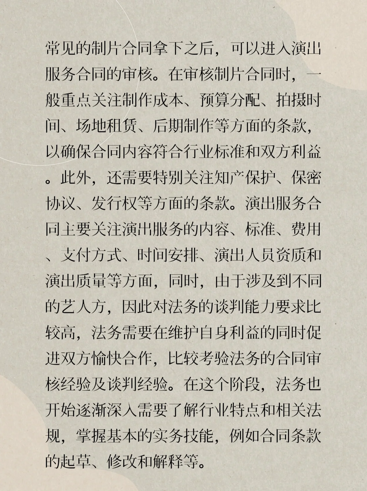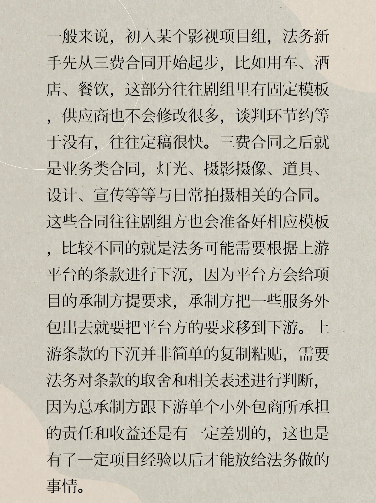 一般来说,法律初学者在加入影视项目团队时,都是从三费合同开始的,比如汽车、酒店、餐饮。这部分通常在制作团队中有一个固定的模板,供应商不会做太多修改。谈判环境不符合成本效益,而且最终草案往往很快就定稿了。在三费合同之后,还有与灯光、摄影、道具、设计、推广等日常拍摄相关的商业合同。 这些合同通常由生产团队用相应的模板编制,但不同的是,法律部门可能需要遵循上游平台的条款进行下沉,因为平台会对项目承包商提出要求。如果承包商将一些服务外包,他们将不得不将平台的要求转移到下游。 上游条款的下沉不仅仅是复制粘贴的问题。它要求法律部门对条款的选择和相关表述做出判断,因为主承包商和单个下游小承包商承担的责任和利益仍存在一定差异。这也是只有在获得一些项目经验后才能分配给法律部门的事情。 在获得共同的生产合同后,可以对履约服务合同进行审查。在审查制作合同时,通常关注制作成本、预算分配、拍摄时间、场地租赁、后期制作等条款,以确保合同内容符合行业标准和双方利益。此外,还需要特别注意知识产权保护、保密协议和分销权等条款。演出服务合同主要集中在演出服务的内容、标准、费用、支付方式、时间安排、表演者资格、演出质量等方面。 同时,由于不同艺术家的介入,法律事务的协商能力相对较高。法律事务需要在维护自身利益的同时促进双方的愉快合作,这考验着法律事务的合同审查和谈判经验。在这一阶段,法律事务也逐渐加深了对行业特点和相关法规的理解,掌握起草、修改和解释合同条款等基本实践技能。 演出合同又向前迈进了一步,包括制作方与平台方之间的上游合作合同、发行合同、音乐版权合同等。 如今,规模较大的影视项目往往涉及联合制作,因此合同需要审查投资金额、投资方式和资金来源,以确保资金到位并合理使用。此外,有必要对投资回报率和收入分配方法进行审查,以确保公平合理。与此同时,更复杂的法律问题也开始得到解决,如商业谈判、FL风险评估和预防。