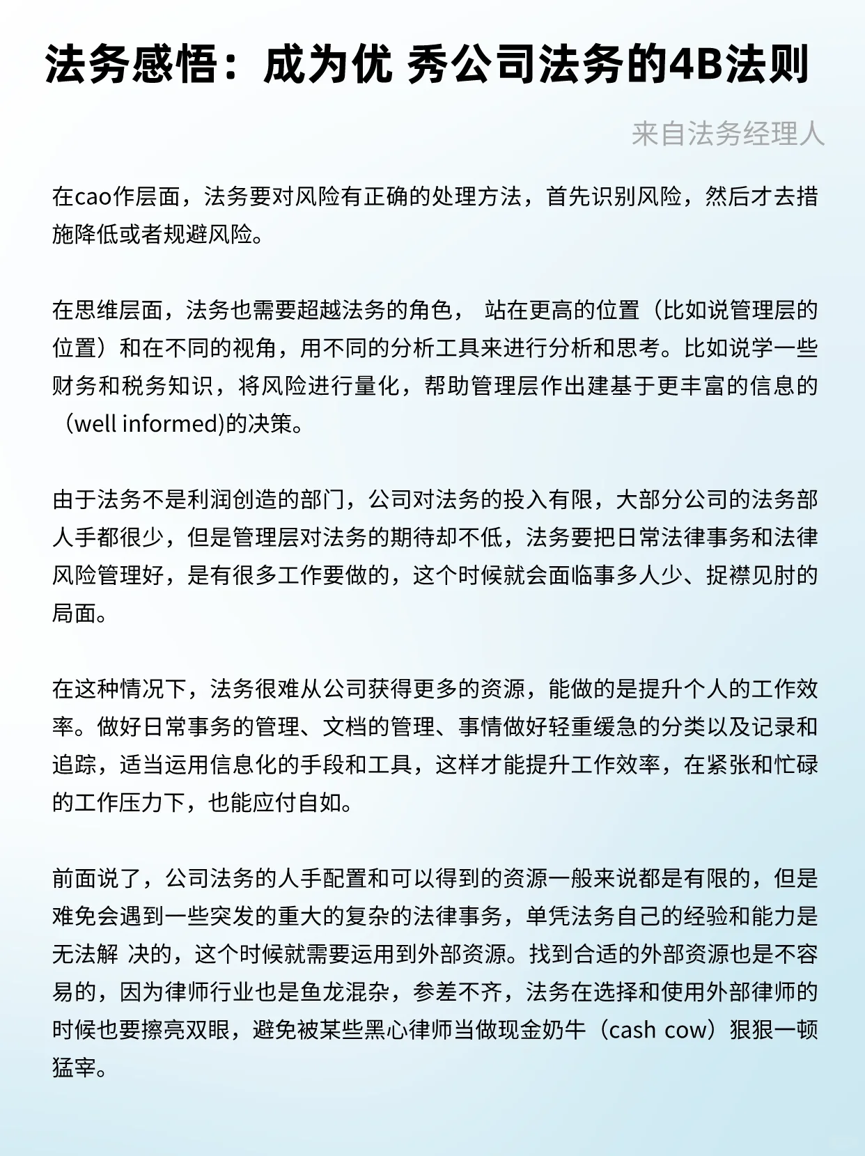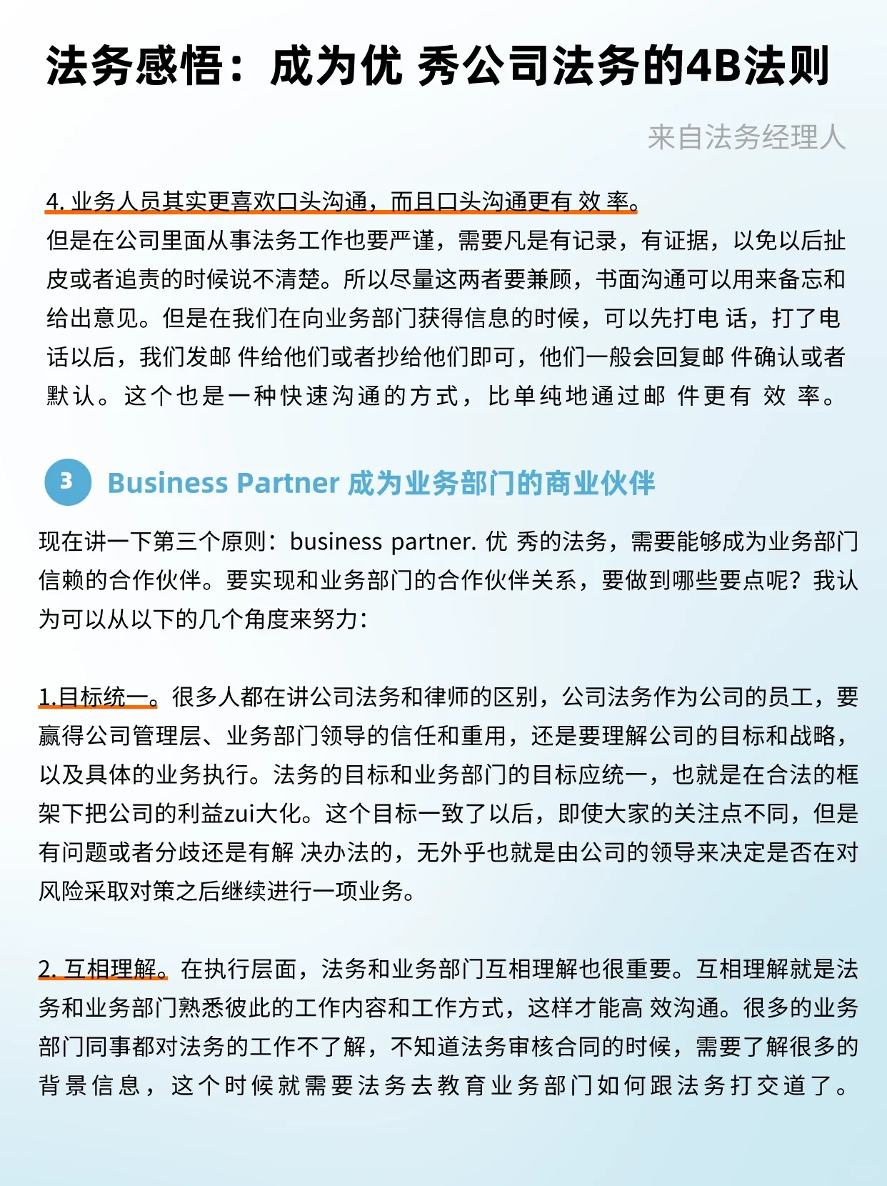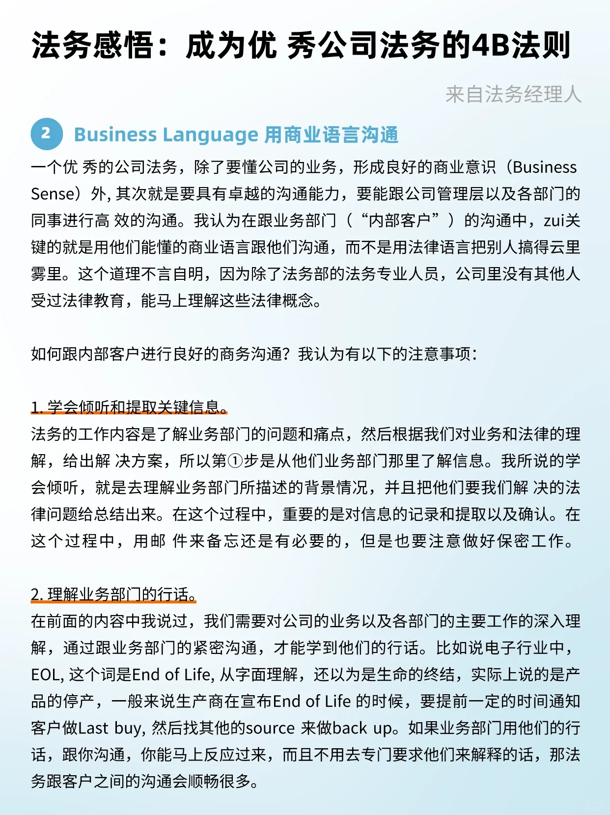 我从事法律工作已有十多年,大部分时间从事公司法律事务。作为一个有思想的人,我总结了我理想中优秀法律工作的特点。我将成为一名优秀法律工作人员的四个要点总结为4B规则: 商业意识商业意识 商务语言 业务合作伙伴 Bevondlegal心态超越了法律思维 本摘要概述了成为一名优秀的公司法律人员甚至优秀的商业律师必须具备的四个基本素质: 商业头脑:具有强烈的商业头脑:优秀的企业法律专业人士能够非常了解他们所服务的公司的商业模式。他们知道公司是如何赚钱的,知道公司在行业和产业链中扮演什么角色,知道公司处于什么样的商业地位;他们可以快速评估和识别公司在实现其预期商业意图时可能面临的法律风险。只有了解这些要点,我们才能为公司内部客户提供有效的法律咨询和意见。 商务语言:用商务语言与客户沟通,仅仅说法语是不够的。如果客户没有学习过法律,他们可能不理解你使用的法律概念。使用一些法律概念来反映你的专业知识是正确的,但让客户理解你的意见很重要。因此,在与客户沟通时,我们应该少用法语,多用他们的行话与他们沟通。这会让他们觉得你知识渊博,自然会增强他们对你的信任。 业务合作伙伴:优秀的法律专业人士应努力成为客户的合作伙伴或团队成员,这意味着他们需要提供更多的前端服务,并与客户更亲近。公司法律部门可以参加业务团队的战略会议。当业务部门正在制定初步计划时,他们可以提前分析可能需要的法律问题,并制定应对措施。需要使用的合同模板应提前制定,以方便业务部门使用。这也可以避免后期执行过程中由于相关法律问题导致计划停滞或延迟 超越法律思维:优秀的企业法律专业人士不仅需要具备法律思维能力,还需要学会从财务和企业管理的角度分析和解决问题,并能够利用外部资源实现公司的商业目标。