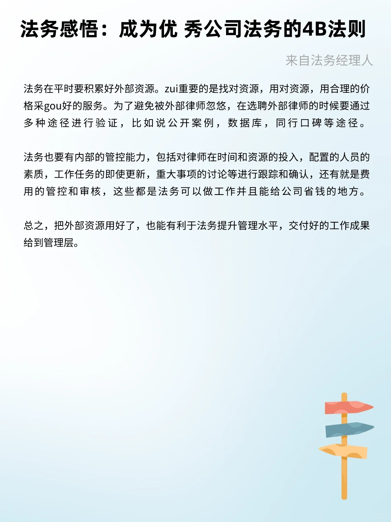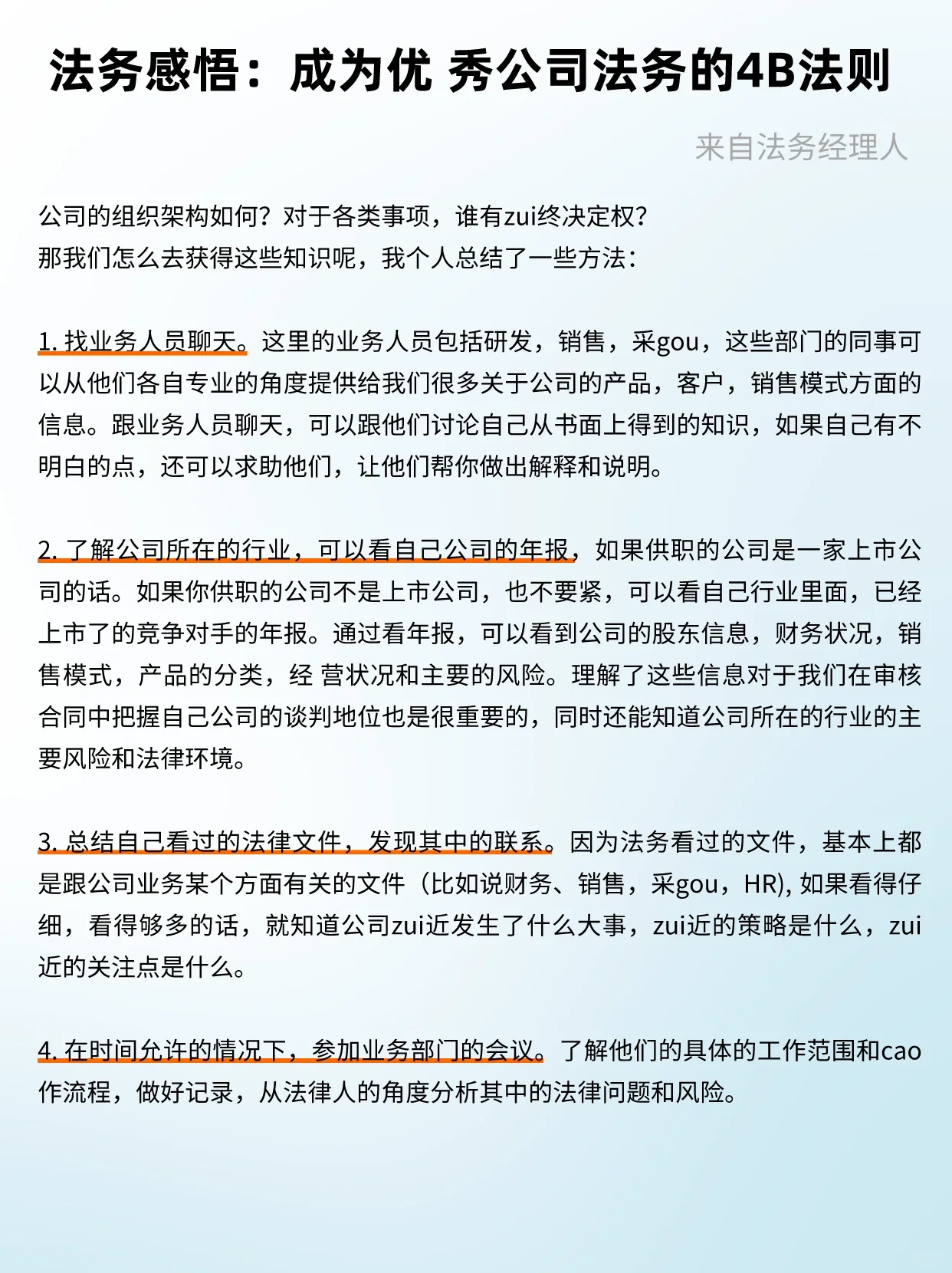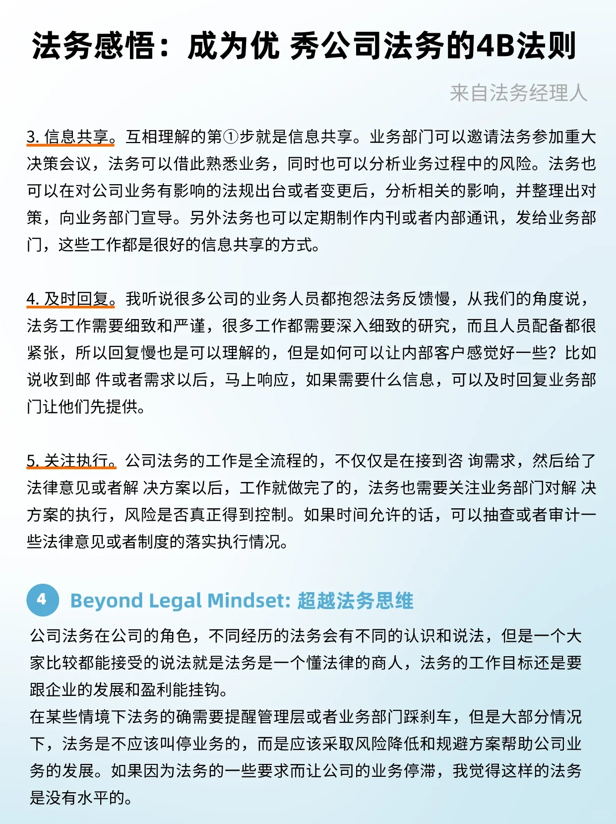 我从事法律工作已有十多年,大部分时间从事公司法律事务。作为一个有思想的人,我总结了我理想中优秀法律工作的特点。我将成为一名优秀法律工作人员的四个要点总结为4B规则: 商业意识商业意识 商务语言 业务合作伙伴 Bevondlegal心态超越了法律思维 本摘要概述了成为一名优秀的公司法律人员甚至优秀的商业律师必须具备的四个基本素质: 商业头脑:具有强烈的商业头脑:优秀的企业法律专业人士能够非常了解他们所服务的公司的商业模式。他们知道公司是如何赚钱的,知道公司在行业和产业链中扮演什么角色,知道公司处于什么样的商业地位;他们可以快速评估和识别公司在实现其预期商业意图时可能面临的法律风险。只有了解这些要点,我们才能为公司内部客户提供有效的法律咨询和意见。 商务语言:用商务语言与客户沟通,仅仅说法语是不够的。如果客户没有学习过法律,他们可能不理解你使用的法律概念。使用一些法律概念来反映你的专业知识是正确的,但让客户理解你的意见很重要。因此,在与客户沟通时,我们应该少用法语,多用他们的行话与他们沟通。这会让他们觉得你知识渊博,自然会增强他们对你的信任。 业务合作伙伴:优秀的法律专业人士应努力成为客户的合作伙伴或团队成员,这意味着他们需要提供更多的前端服务,并与客户更亲近。公司法律部门可以参加业务团队的战略会议。当业务部门正在制定初步计划时,他们可以提前分析可能需要的法律问题,并制定应对措施。需要使用的合同模板应提前制定,以方便业务部门使用。这也可以避免后期执行过程中由于相关法律问题导致计划停滞或延迟 超越法律思维:优秀的企业法律专业人士不仅需要具备法律思维能力,还需要学会从财务和企业管理的角度分析和解决问题,并能够利用外部资源实现公司的商业目标。