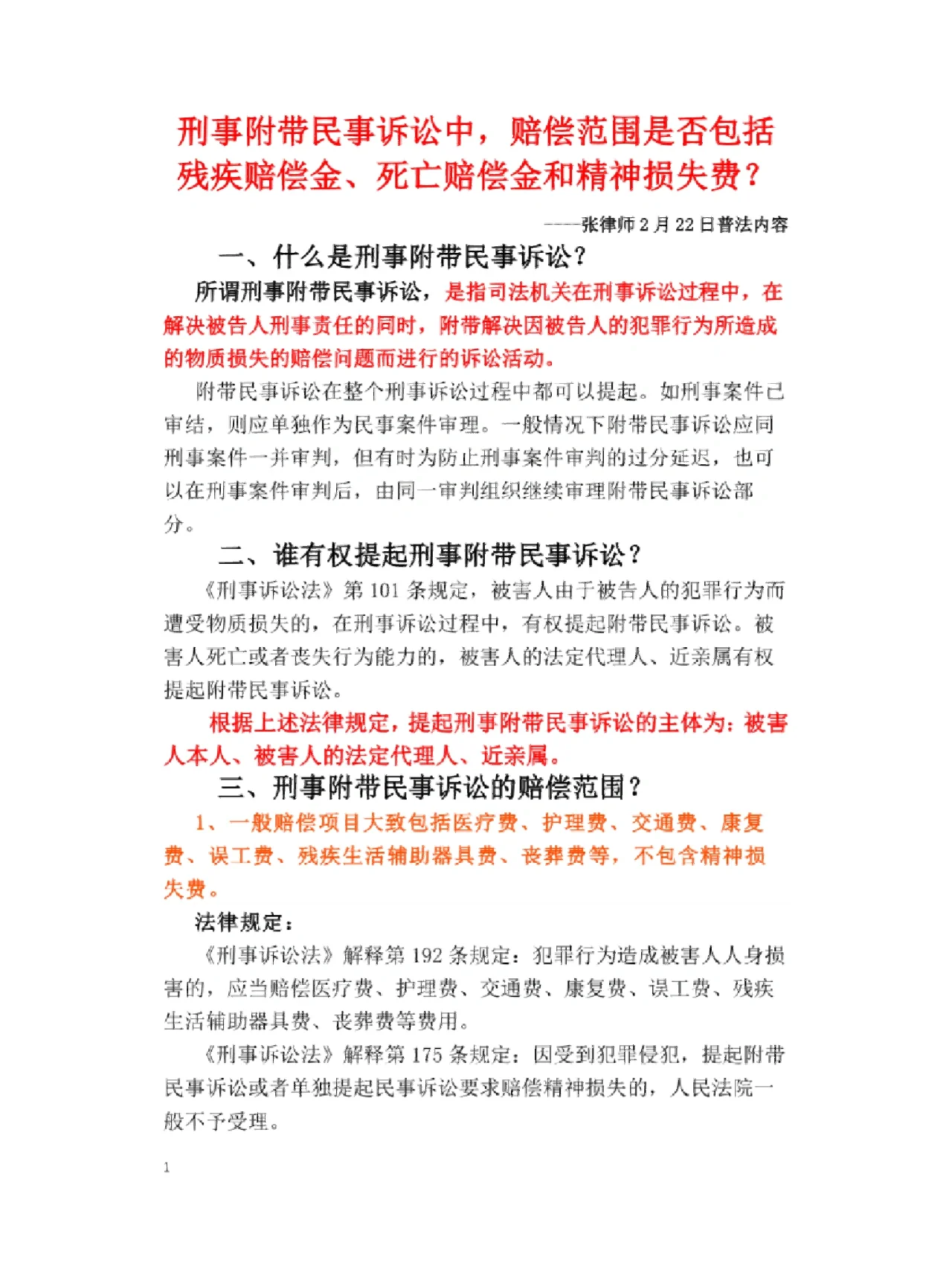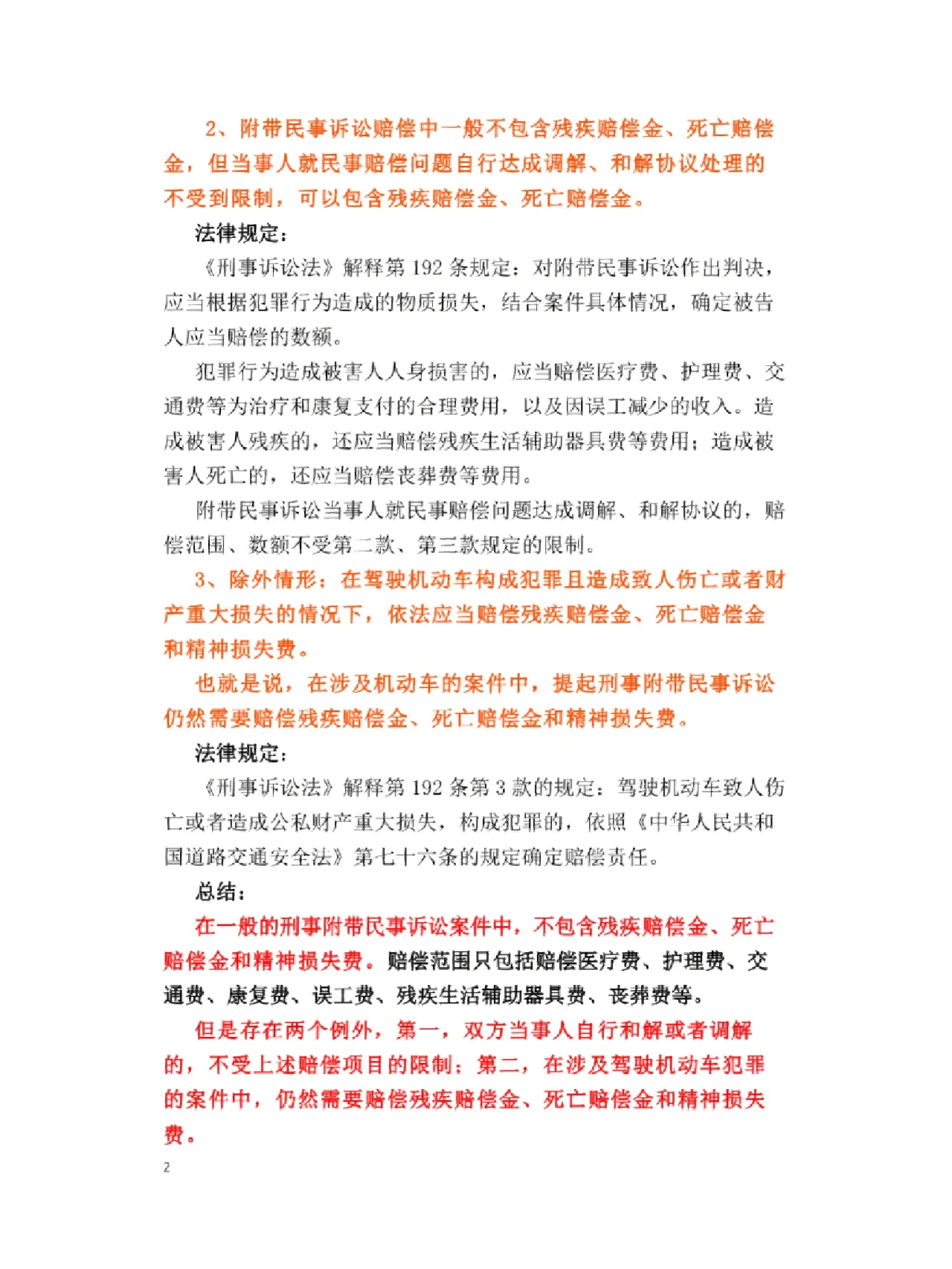 一般刑事附带民事诉讼案件不包括伤残赔偿金、死亡赔偿金和精神损害抚慰金。赔偿范围仅包括医疗费、护理费、交通费、康复费、误工费、残疾生活救助费、丧葬费等。 然而,也有两个例外。第一,如果双方自行和解或调解,不受上述赔偿项目的限制;其次,在涉及机动车驾驶犯罪的案件中,仍然需要赔偿伤残赔偿金、死亡赔偿金和精神损害赔偿金。