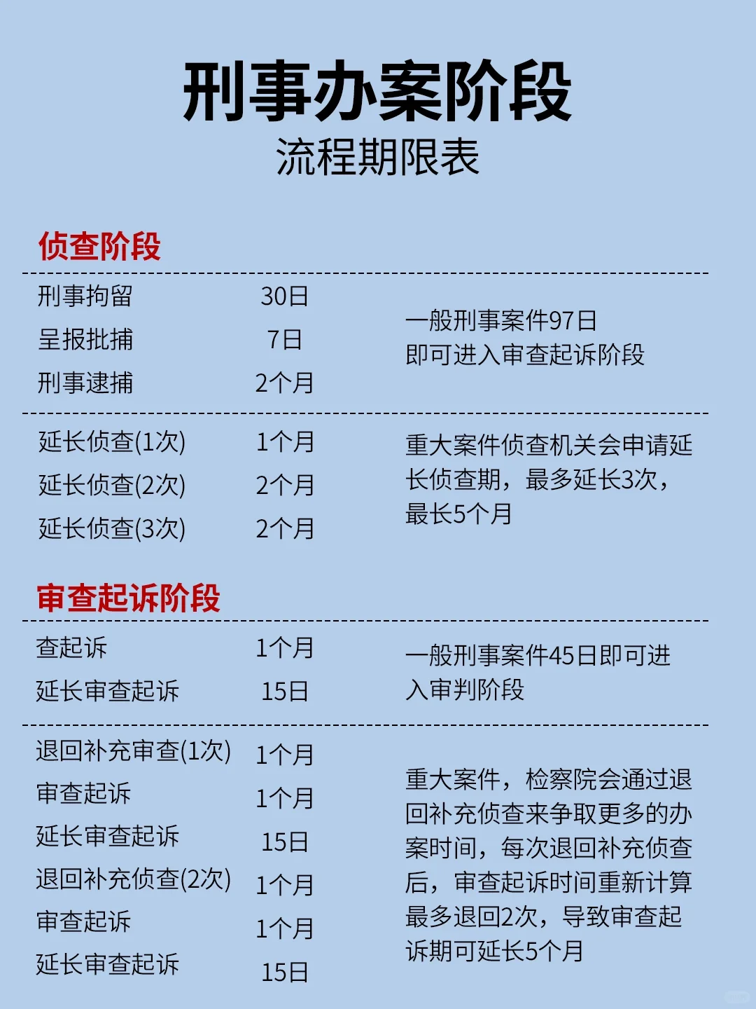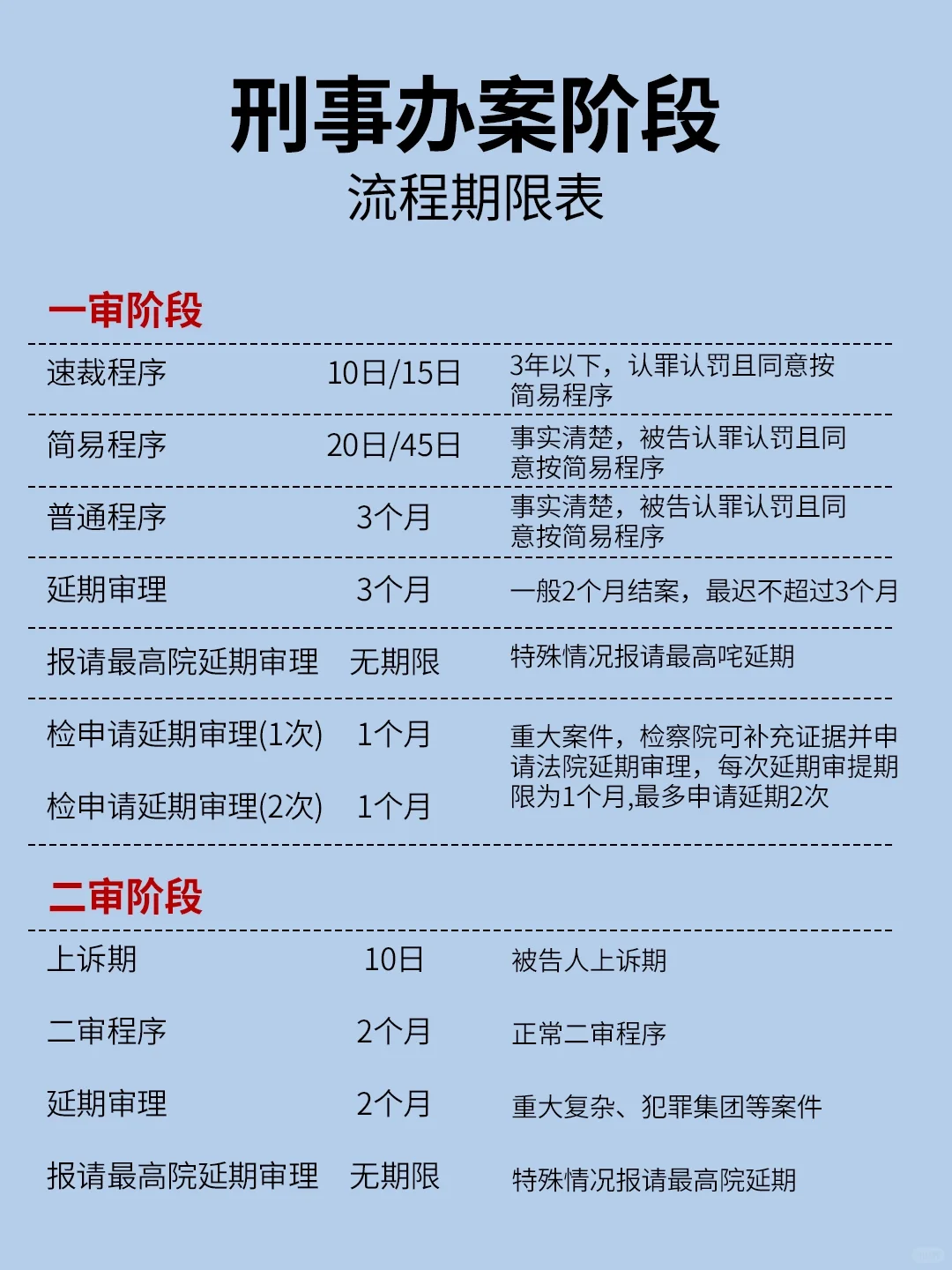 当法律问题过于复杂时,如何处理刑事案件让我们一起看看 我们已经将整个流程图包含在图片中!你可以更方便直观地看到它 侦查阶段:一般情况下,刑事案件可以在97天内进入审查起诉阶段。主要刑事调查机关可申请延长侦察机使用期限,最长可延长三次,最长可达五个月 在审查起诉阶段,刑事案件通常在45天内进入审判阶段。对于重大事件,检察院将通过返回补充调查来争取更多的处理时间。每次返回补充调查后,审查和起诉时间将重新计算,最多两次返回 一审阶段 快速仲裁程序,10-15天,不到三年,认罪并同意遵循简化程序 简易程序,20-45天澄清事实,被告认罪并同意遵循简易程序 常规程序,3个月,事实清楚,被告人认罪认罚,同意遵循简化程序 延迟试验,三个月,通常两个月,但不超过三个月 请求最高法院无限期延长审判,在特殊情况下,请求最高法院延长听证会 二审阶段,包括上诉期、二审程序、审判延期以及向最高法院申请延期审判 法律问题,我们走吧~