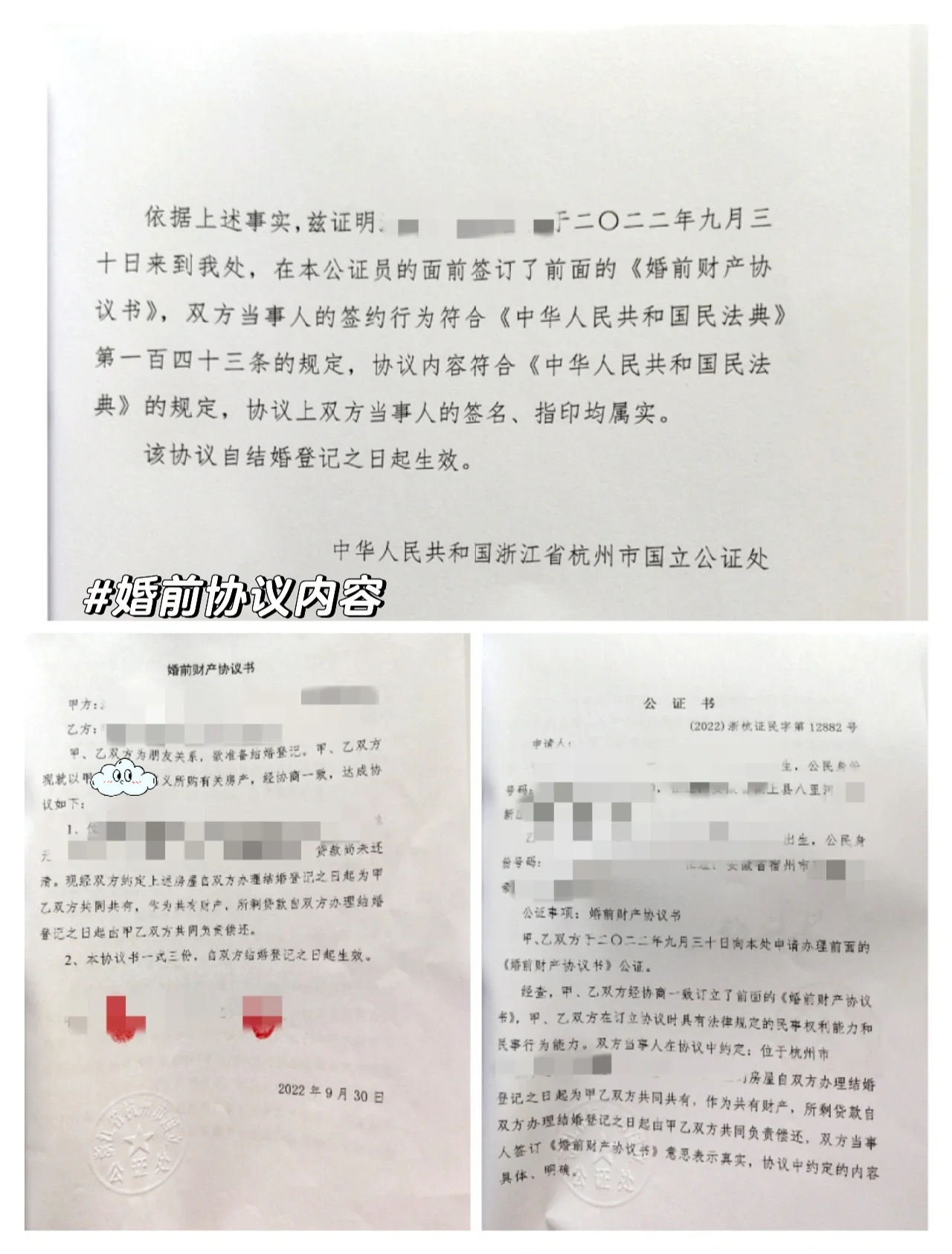 关于财产公证, 这不是一个突然的惊喜或精心准备的浪漫,而是我们一起仔细考虑和做出的决定。 关于我们目前的情况, 没有证书,房子上就不能写我们的名字; 房子有贷款,结婚后由我们共同承担抵押; 首付涉及外债,结婚后我们也很有可能偿还。 起初,我对房地产公证一无所知。无意间听同事说起,后来在网上搜集资料,看到了全国各地的很多实际案例。经过思考,我决定向男朋友解释我的想法,因为他也是第一次听说这件事,所以我没有急于为他做决定。我让他在网上搜索信息以了解更多信息。经过了解,他同意了我的想法。我男朋友向他的父母解释了我们的想法,他们也支持我们的做法。 财产公证过程非常顺利。由于我们在杭州,我们选择了杭州的国家公证处,并提前通过电话进行了预约。申请当天,您需要携带房产证、双方身份证、户口本或其他能够证明您身份的有效文件(驾驶证、护照等)。当您到达现场时,您可以直接向工作人员解释我们的需求,然后开始支付费用(公证费+复印费)、填写个人信息证明材料和处理说明。我们使用的是公证处的通用模板,因此没有添加额外的补充条件。 写在最后, 在这一时期,存在着争论、困惑以及理解和信任。我学会了从不同的角度思考。我相信,无论友情还是爱情,只有双向发展,它才会变得有意义。