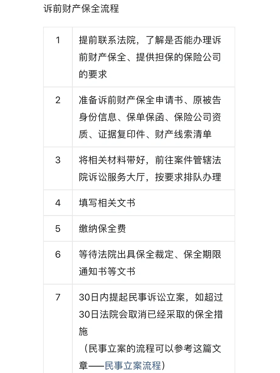 提前与法院联系,询问能够办理诉前财产保全和提供担保的保险公司的要求 准备诉前财产保全申请书、原被告身份信息、保单担保、保险公司资质、证据复印件、财产线索清单 携带相关材料前往案件管辖法院诉讼服务大厅,按要求排队办理 填写相关文件 保全费的支付 等待法院发布保全裁决、保全期通知和其他文件 如果在30天内提起民事诉讼,法院将取消已经采取的保全措施。(民事立案程序可参考第1条——民事立案程序)
