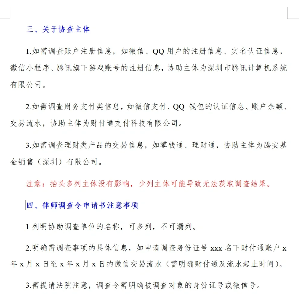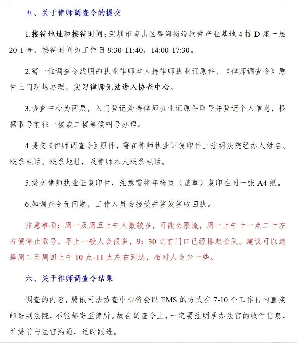 今天我去腾讯司法合作中心提交材料成功 地点:深圳市南山区粤海街道软件产业基地4号楼D座1楼20-1号 这里有几点需要注意: 不要走得太早或太迟。在上午10点到11点之间,以及下午3点到4点之间,这两个时间段的人相对较少。 尽量避开周一和周五的高峰时段。 执业证书复印件需要有年检页。 联合调查的主题应尽可能全面,不得遗漏。 请求必须是具体的。 提前查询法院邮寄地址,填写执业证书复印件空白处。