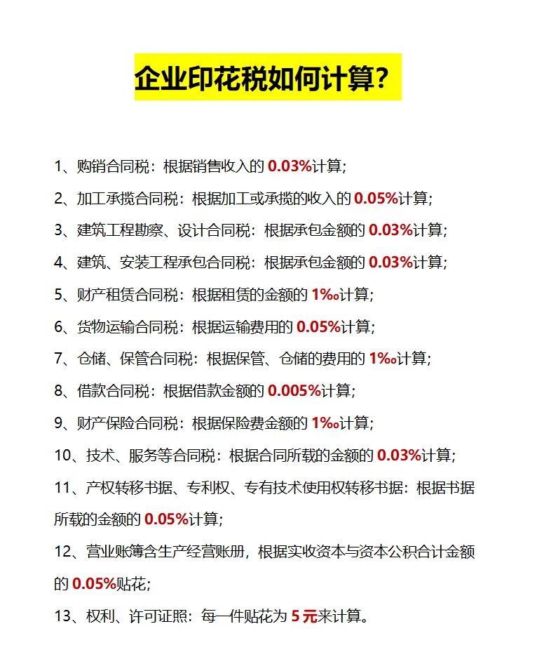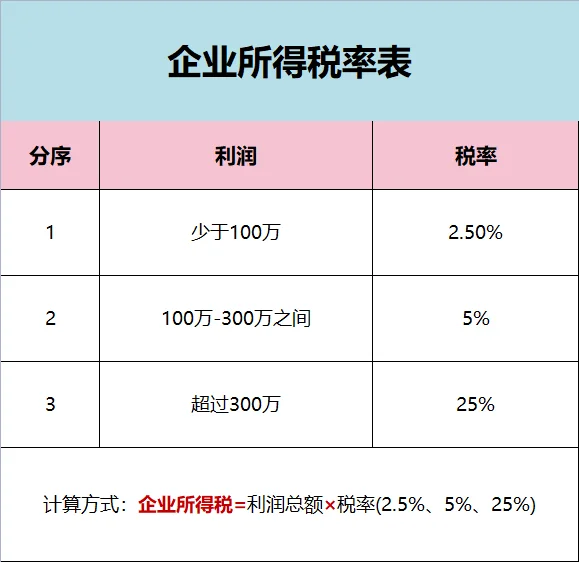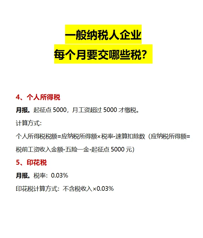 公司每月需要缴纳哪些税款 1、 小型纳税人企业 1.增值税 按季度申报。税率是3%。企业月发票金额≤15万,季度发票金额≤45万,免征增值税。 增值税计算方法:应纳税额=含税销售额÷(1+税率) 应交增值税=不含税收入x 3% 2.附加税 按季度申报。附加税包括城市建设税、教育附加、地方教育附加。城市建设税按已缴纳增值税的7%缴纳,教育附加按已缴纳的增值税的3%缴纳,地方教育附加按所缴增值税的2%缴纳。[吃瓜R] 附加税计算方法:增值税额×税率 3.企业所得税 按季度申报。需要缴纳的税率与企业的利润有关。企业利润100万以下的税率为2.5%,利润100万至300万的税率为5%,利润300万以上的税率为25%。 企业所得税的计算方法:企业所得税=利润总额x税率(2.5%、5%、25%) 4.个人所得税 月度报告。最低税点是5000,只有当月薪超过5000时才纳税。 计算方法: 个人所得税税额=应纳税所得额x税率-快速扣除额(应纳税所得税额=税前工资收入额-五险一金-起征点5000元) 5.印花税 季度报告。税率:0.03% 印花税计算方法:不含税收x 0.03% 2、 一般纳税人企业 1.增值税 月度报告。13%、9%和6%的税率 看看这个行业 增值税计算方法:应纳税额=当期销项税额-当期进项税额=含税销售额÷(1+税率) 2.附加税 月度报告。附加税包括城市建设税、教育费附加和地方教育费附加。 城市建设税按已缴纳的增值税的7%缴纳; 教育费附加按所缴增值税的3%缴纳; 地方教育费附加按所缴增值税的2%执行。 附加税计算方法:增值税额×税率 3.企业所得税 按季度申报。需要缴纳的税率与企业的利润有关。企业利润100万以下的税率为2.5%,利润100万至300万的税率为5%,利润300万以上的税率为25%。 企业所得税的计算方法:企业所得税=利润总额×税率(2.5%、5%、25%) 4.个人所得税 月度报告。最低税点是5000,只有当月薪超过5000时才纳税。 计算方法: 个人所得税税额=应纳税所得额x税率-快速扣除额(应纳税所得税额=税前工资收入额-五险一金-起征点5000元) 5.印花税 月度报告。税率:0.03% 印花税计算方法:不含税收x 0.03%
