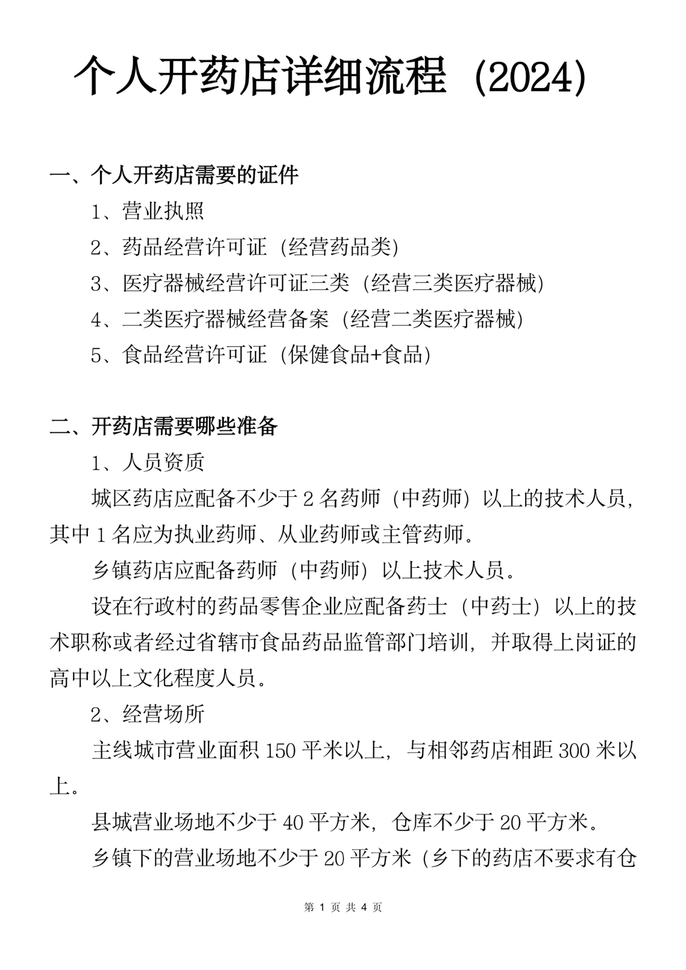 取得执业药师证书后,我可以自己开药店吗如果你不想当工人,我会把这篇文章分享给你! 1、 开设个人药房所需的文件 1.营业执照 2.药品经营许可证(用于销售药品) 3、医疗器械经营许可证第三类(经营第三类医疗器械) 4.第二类医疗器械经营登记(经营第二类医用器械) 5、食品经营许可证(保健食品+食品) 2、 开药店需要做哪些准备工作 1.人员资质 2.经营场所 3、营业执照 4.遵守规章制度 3、 药品经营许可证领取程序 1.申请人应向所在地县级药品监督管理局提交设立申请,并提交以下材料 2.药品监督管理局应当自受理申请之日起30个工作日内,对申请材料进行审查,作出是否同意设立的决定,并书面通知申请人。 3.申请人完成制剂后,应向药品监督管理局提交受理申请,并提交以下材料 4、 具体流程(如图所示)
