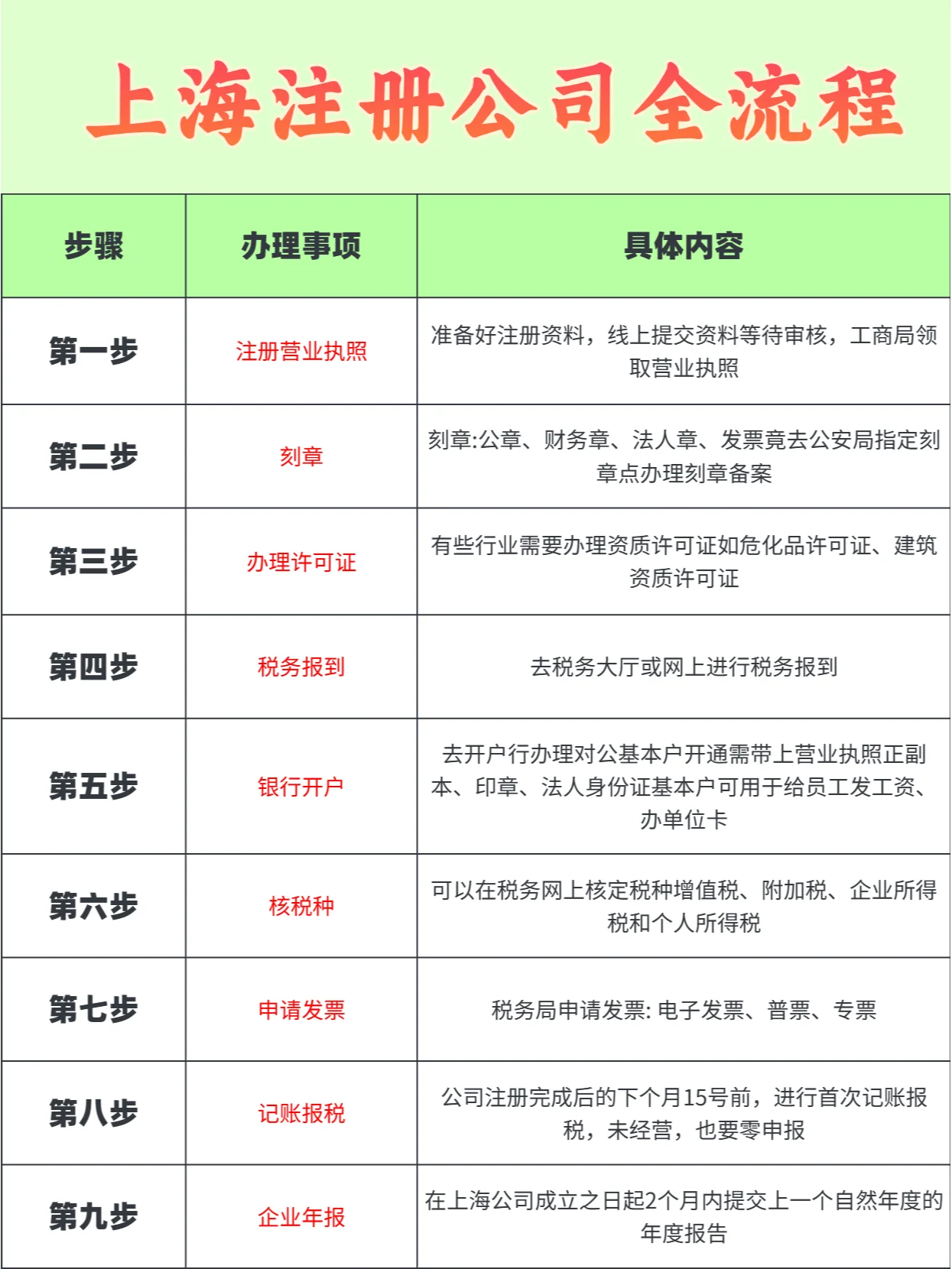 今天,让我和大家分享一下公司注册的全过程。 营业执照登记:首先,您需要准备登记文件,包括公司名称、注册地址、注册资本、经营范围、股东出资比例、高管任命信息、法定代表人、监事和股东的身份信息。首先,在网上核实姓名,然后将登记材料提交给上海市市场监督管理局,等待批准。 印章刻制:接下来,您需要到公安局指定的印章刻制点申请印章刻制登记。您将雕刻四个印章:公章、财务章、法定代表人章和发票章。什么 申请资格许可证:如果您的企业需要资格许可证的预先批准,您需要在注册营业执照之前或之后申请这些许可证。: 税务登记:对于国内公司来说,税务登记通常在颁发许可证时完成,这意味着一旦颁发许可证,您就有了税务登记。另一方面,外国公司要求单独纳税申报,可以选择在线或离线申报方式。 银行法人账户开立:您需要为您的公司开立法人账户。与银行预约,并确保准备好营业执照原件、印章、法定代表人身份证等相关材料。银行工作人员会核实您的公司信息,您可以开立一个公司账户,用于支付工资和处理公司财务。 税务分类:在税务网站上,您需要确定公司需要报告的税务分类,这取决于您的公司类型和业务范围。一般来说,企业需要申报的税种包括增值税、附加税、企业所得税和个人所得税。 申请税务总监和发票:根据公司的业务需求,您可能需要申请税务总监。将相关信息带到税务局填写相关表格,并购买适合您公司的税务控制器。然后,申请发票,以便在公司运营中开具。 会计和税务报告:在注册完成后的下个月15日之前,您需要进行第一次会计和税务申报。即使您没有业务操作,您仍然需要进行零申报。如果你没有按时报税,你可能会面临税务机关的罚款,所以你必须按时记账报税。 企业年度报告:在上海,公司成立后,您需要在成立后两个月内提交上一个日历年的年度报告。无论公司是否在经营,只要成立一年,就必须提交上一年的经营年度报告。 这是公司注册的整个过程,每一步都非常重要。谨慎执行是至关重要的。祝你在创业之旅中一切顺利!