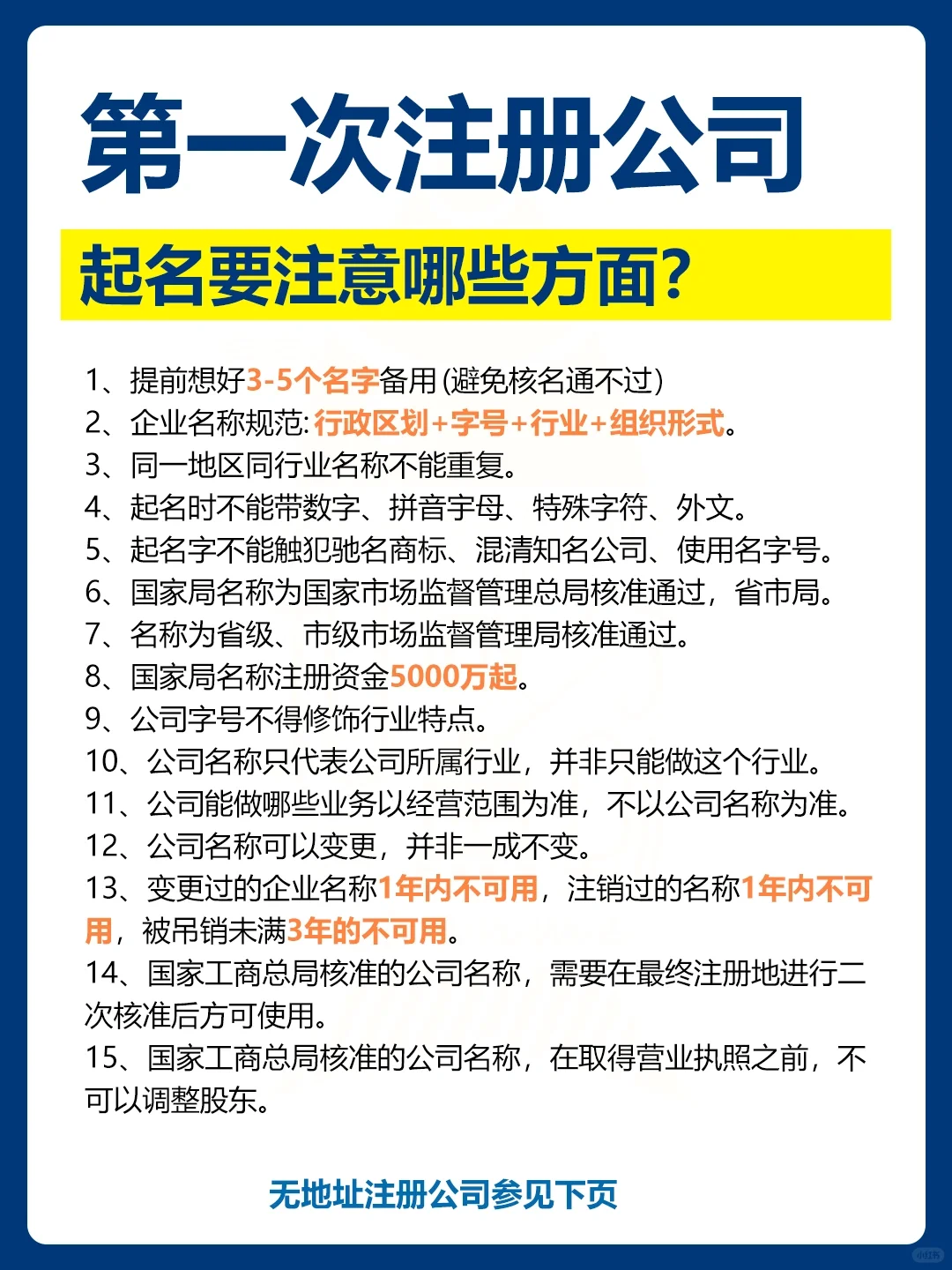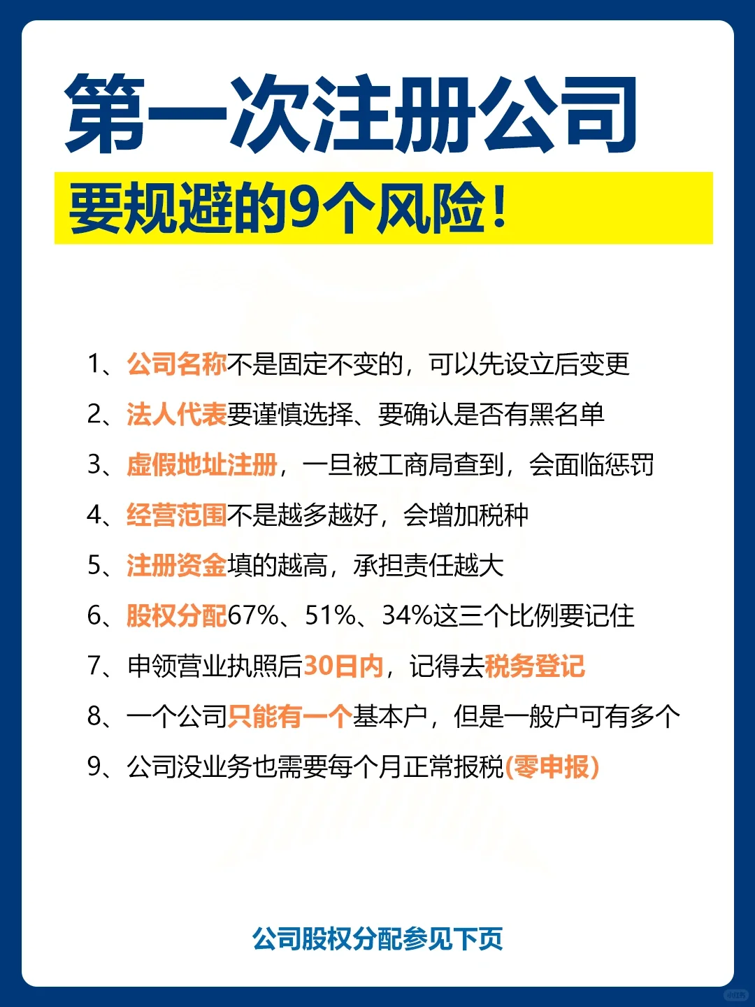 一般来说,公司注册的过程包括:企业名称验证、提交材料、获取许可证和刻制印章,以完成公司注册并开始营业。但对于正在注册公司的初学者来说,了解如何处理注册公司时可能遇到的一些问题也是非常重要的。 例如,注册公司时应注意什么股权比例如何分配命名公司的原则是什么如何注册没有地址的公司 注册公司的步骤分为三个步骤: 步骤1:准备材料---- 公司名称:2-5个备选名称,以避免重复名称 业务范围:在天眼查、洽洽等平台,指代同行 注册资本:指公司未来的经营金额 高管信息:法定代表人、股东、监事身份证及电话 股份分配:投资者应根据其出资额承担相应责任 地址信息:如果没有商业地址,可以委托机构登记 法定代表人照片:法定代表人上身照片,用于刻制印章 步骤2,处理时间---- 企业名称审批:1天 网上提交材料:1天 领取营业执照:1天 刻制公司印章:1天 银行开户:7天 税务机关登记:2天 第3步:费用价格 手续费:免费 雕刻:免费 地址费:如果有可用的地址,则免费。注册地址从800元到1500元不等 银行开户:免费查看。例如,中国工商银行的管理费是300元/年 9用于注册公 重要注意事项: 1.公司名称不固定,可以先设立后变更 2.应仔细挑选法定代表人,并确认是否有黑名单 3.虚假地址登记,一旦被工商局发现,将面临处罚 4.经营范围越多越好,会增加税种 5.注册资本越高,承担的责任越大 6.记住股权分配的三个比例:67%、51%和34% 7.记得在申请营业执照后30天内到税务机关登记 8.一个公司只能有一个基本账户,但一般账户可以有多个 9.即使没有业务,公司也需要每月正常报税(零申报) 注册公司的股权分配: 1.67%(三分之二)绝对控制权:公司的重大决策必须经代表三分之二多表决权的股东批准。 2、51%(过半数)相对控制权:除公司重要事项外,其他应由股东大会决定的事项,一般需要股东大会半数以上股权同意才能实施。 3.34%(三分之一)的重要事项拥有一票否决权 4.提议召开临时股东大会的权利、主持会议的权利、提议召开临时董事会会议的权利和要求解散公司的权利的10%(十分之一) 5.低于10% 股东的基本维权权利 命名公司的注意事项: 1.提前计划3-5个名称进行备份(避免名称验证不通过) 2.企业名称规范:行政区划+商号+行业+组织形式。