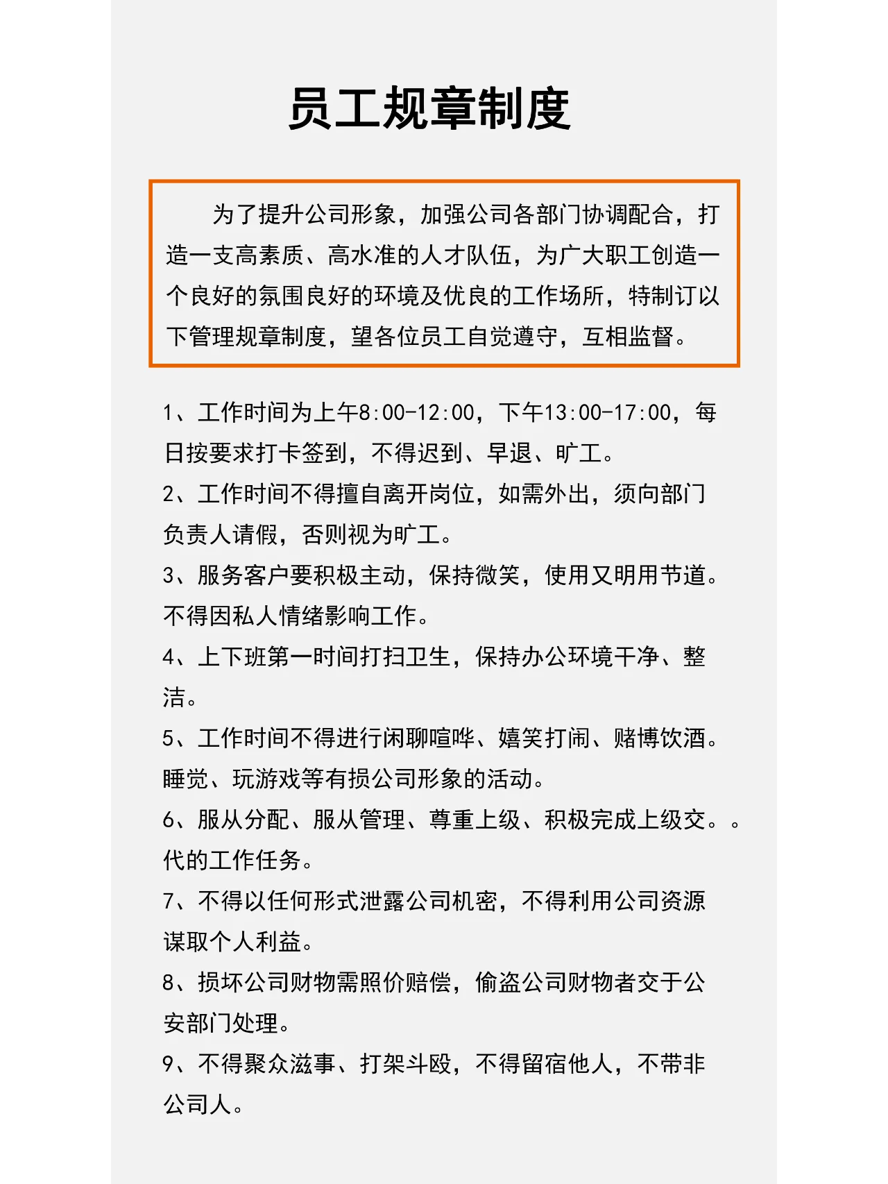 为了提升公司形象,加强各部门之间的协调与合作 建设一支高素质、高水平的人才队伍,为员工创造有利环境 良好的氛围、环境和工作场所,特别设计 管理规章制度已经到位,希望全体员工自觉遵守,互相监督。 1.工作时间为上午8:00至下午12:00,下午1:00至下午5:00,每 每日按要求办理报到、签到,不得迟到、早退、旷工。 2.在工作时间内,不得擅自离开岗位。如果他们需要外出,必须向部门报告 负责人请假,否则视为旷工。 3.服务客户应积极主动,保持微笑,并明智地使用微笑。 个人情绪不得影响工作。 4.上下班通勤时应尽快清理办公环境,保持干净整洁 杰。 5.工作时间禁止聊天、大笑、玩耍、赌博和饮酒。 损害公司形象的活动,如睡觉或玩游戏。 6.服从分配,服从管理,尊重上级,积极完成上级任务。。 代理人的工作任务。 7.不得以任何形式泄露公司秘密,不得利用公司资源 谋取私利。 8、损坏的公司财产按价格赔偿,盗窃公司财产的,向社会公开 安全部门处理。 9.不寻衅滋事,不打架斗殴,不与他人过夜,不带他人 公司人员。