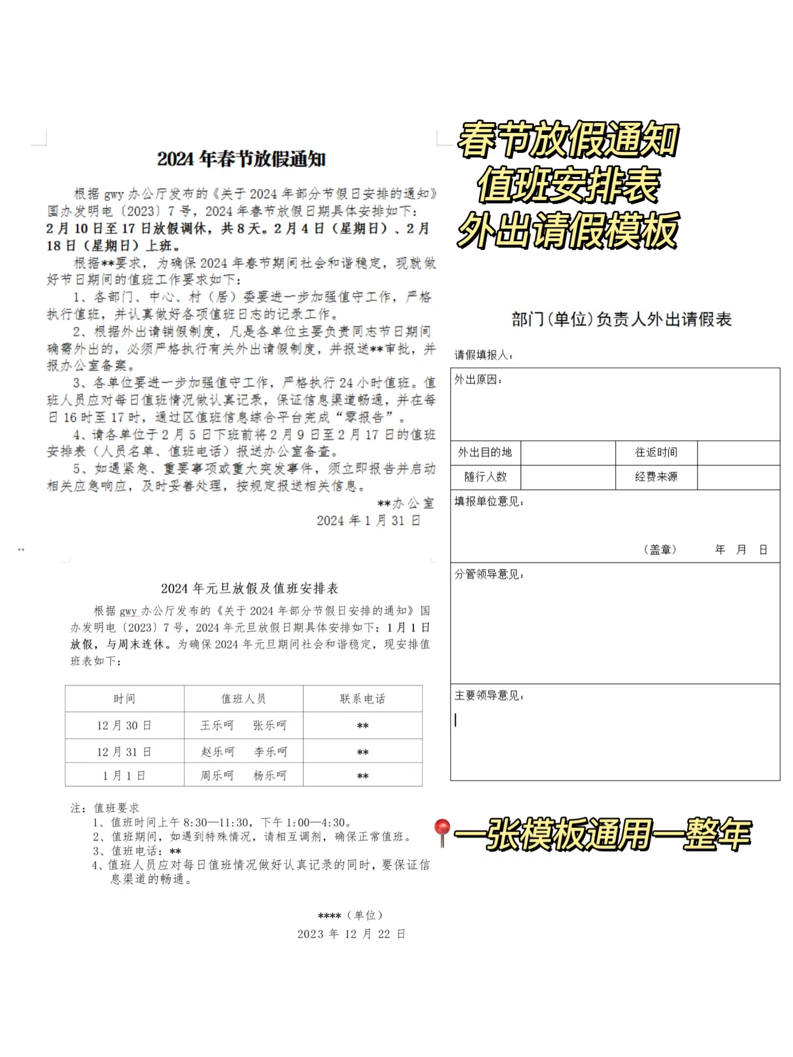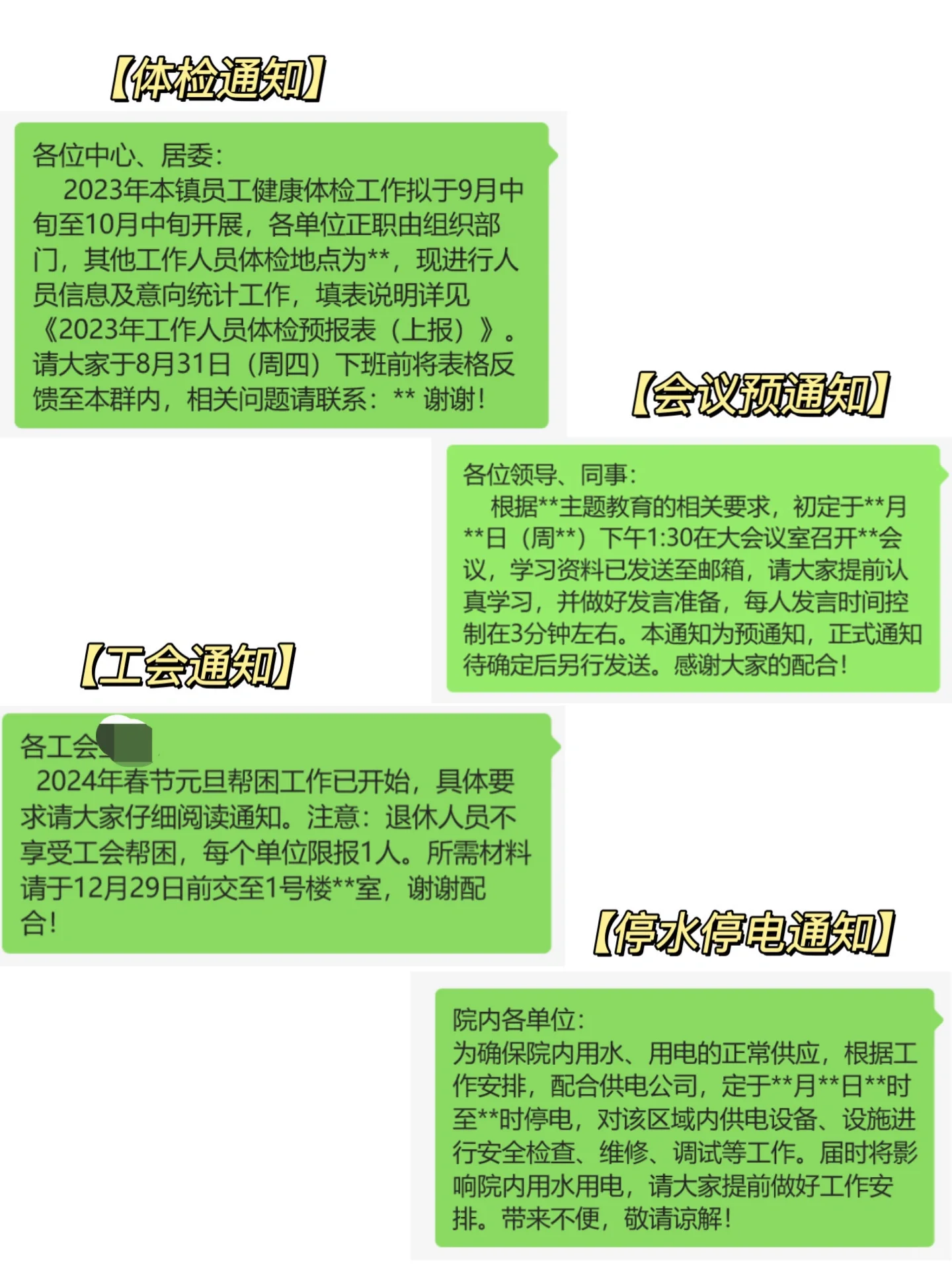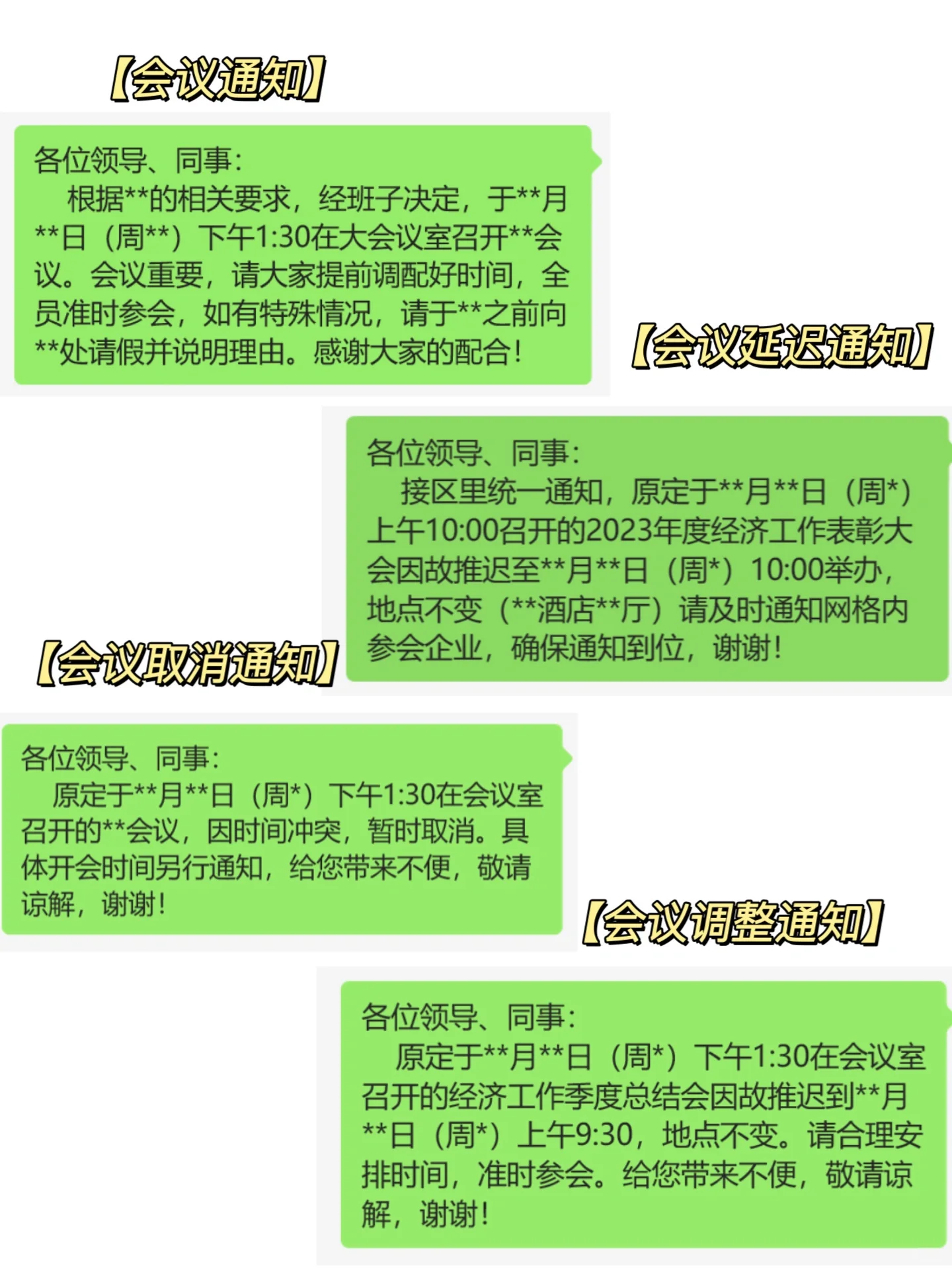 我在办公室工作了将近五年,经常在工作群里发各种通知。 从长远来看,已经积累了许多模板。 假期快到了。乐和特别挑选了常用的通知,整理了12个模板与大家分享。 我希望这对你有帮助~ 有了模板在手,工作很容易。 快给它编码! 会议通知】 尊敬的领导和同事们 根据**的相关要求,经团队决定,**会议将于**月**(**周)下午1:30在会议室召开。这次会议很重要。请提前安排好时间,全体员工将准时出席会议。如遇特殊情况,请在**之前向**请假并说明原因。感谢大家的合作! 会议延期通知 尊敬的领导和同事们 根据该区的统一通知,原定于***(周*)上午10:00举行的2023年经济工作表彰大会因不可预见的情况推迟到***(周)上午10:00召开。场地保持不变(酒店**大厅)。请及时通知网格中的参与公司,以确保通知到位。非常感谢。 会议取消通知 尊敬的领导和同事们 原定于**月**(周*)下午1点30分在会议室举行的会议因时间冲突而暂时取消。具体会议时间另行通知。对于由此给您带来的不便,我们深表歉意,并感谢您的理解。非常感谢。 会议调整通知 尊敬的领导和同事们 原定于***(星期*)下午1时30分在会议室举行的季度经济工作总结会议,由于不可预见的情况而推迟到**(星期**)上午9时30分举行,地点没有变化。请合理安排时间,按时参加会议。带来不便敬请谅解。非常感谢。 分别为【活动通知】、【培训通知】、《反馈接力通知》、【材料领取通知】、“体检通知”、“会前通知”、【工会通知】和“停水停电通知”。 2024年春节放假通知模板请参考附图。 一键通知,看似简单, 但是内容也需要注意细节。 总结以下三点经验,照着写,绝对没错! 明确的目的 常见的开口包括:for。。。,根据…的工作要求等 完整元素 基本通知内容应包括:时间、地点、考勤范围、反馈要求、时间节点等。 简洁明了 语言风格应简洁明了,阅读后不应完全混淆。应避免歧义。