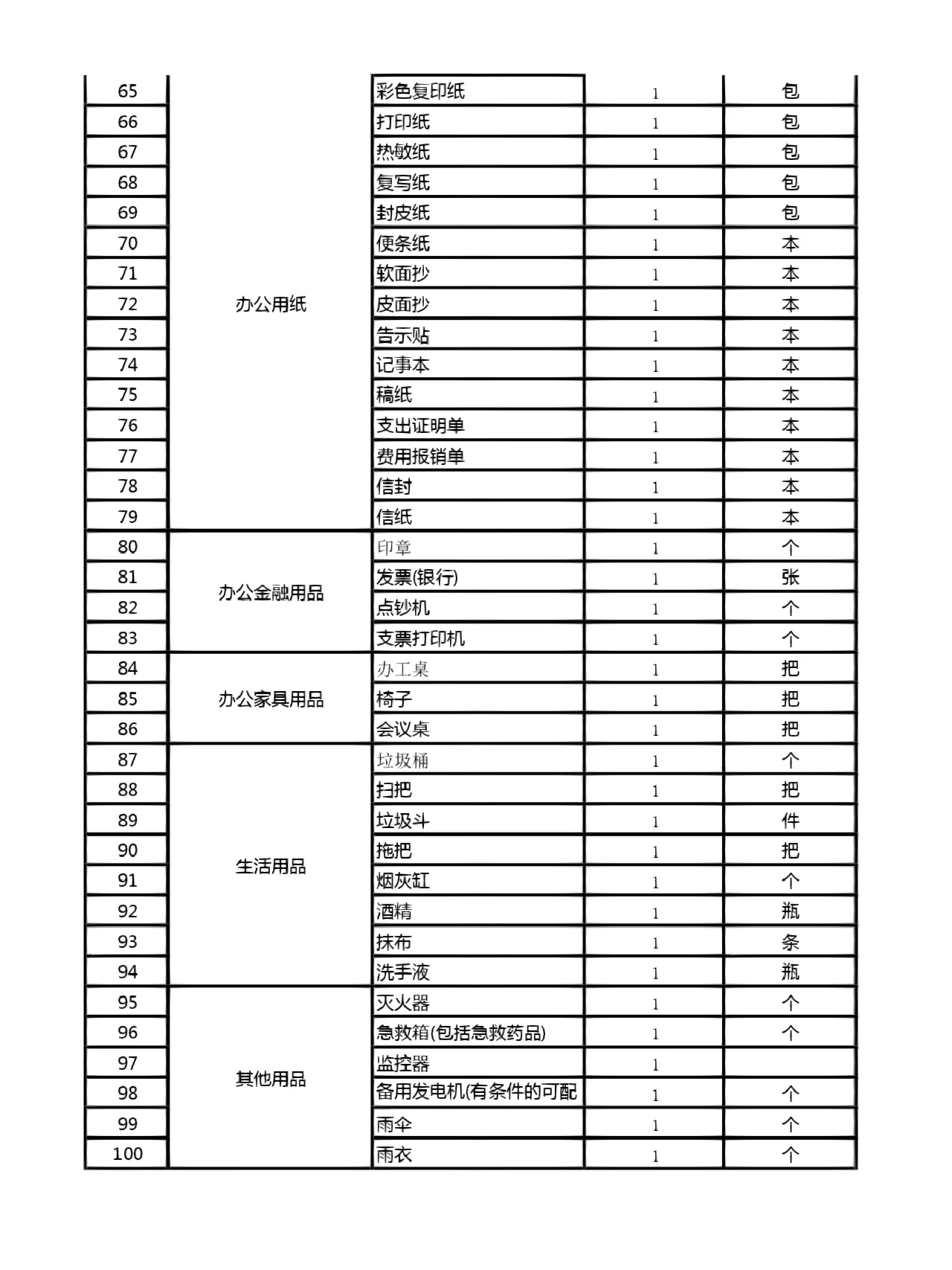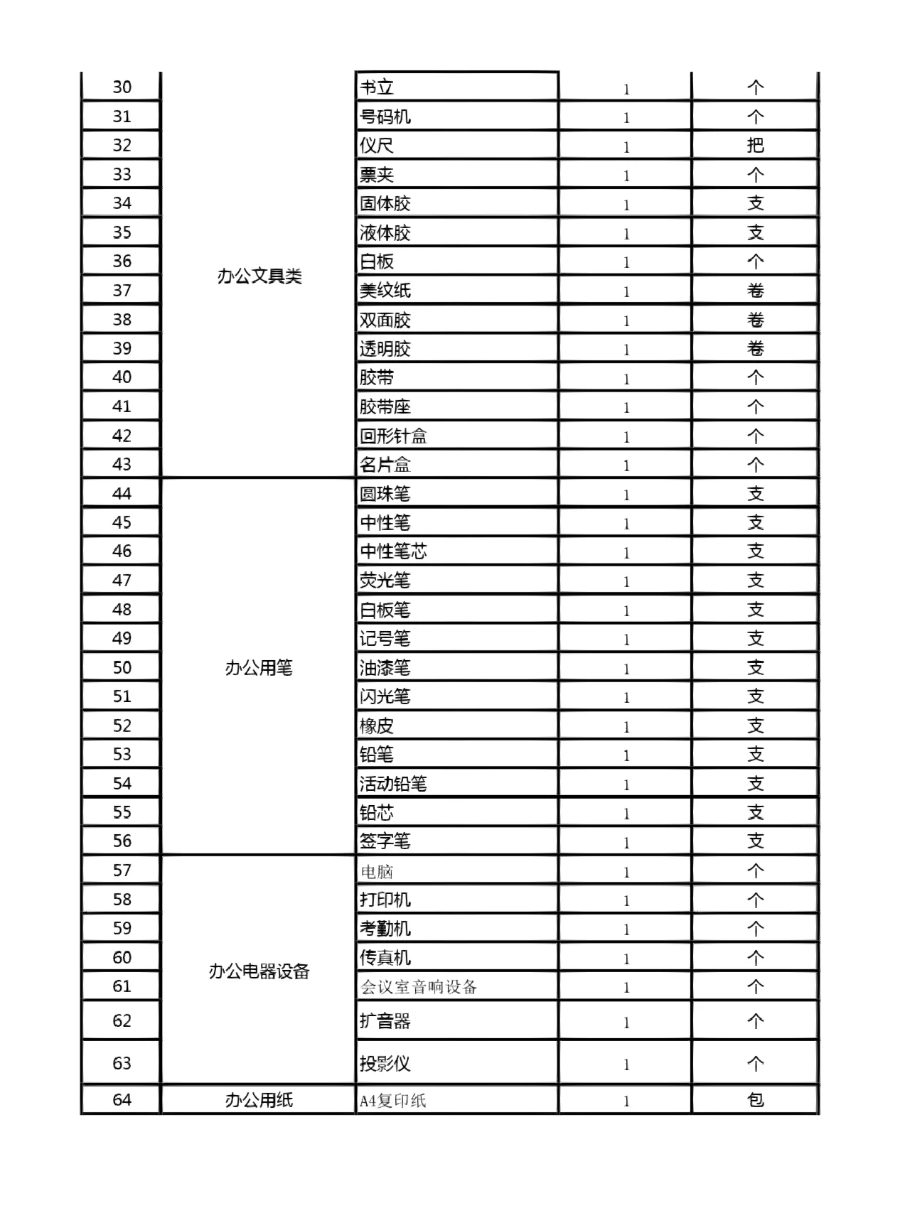尊敬的采购和行政同事们,你们还在为新办公室采购办公用品吗 今天,我将精心整理一份100种新办公用品的清单,适合各种公司和企业的采购需求。快来抄作业吧~ 文具和档案管理 文件夹、资料书、文件集、快速工作文件夹、文件盒、文件袋、物品袋、名片本、光盘保护本、身份证套、板夹、拉杆夹、按钮袋、文件柜 办公文具类 计算器、订书机、打孔机、订书器、回形针、别针、工字钉、夹子、文件架、文件盒、文件柜、剪刀、美工刀、切纸器、笔架、书架、编号机、卷尺、票夹、固体粘合剂、液体粘合剂、复写纸、胶带、胶带夹、回形钉盒、名片盒 办公笔 圆珠笔、中性笔、中性笔芯、荧光笔、白板笔、记号笔、油漆笔、闪光笔、橡皮擦、铅笔、活动铅笔、铅芯、签名笔 办公电气设备类别 电脑、打印机、考勤机、传真机、会议室音频设备、放大器、投影仪等。 办公用纸 A4复印纸、彩色复印纸、打印纸、热敏纸、复写纸、封面纸、便条纸、软拷贝纸、皮革复印纸、通知贴纸、记事本、书写纸、信纸等 办公财务用品 印章、发票(银行)、点钞机、支票打印机等 办公家具用品 办公桌、椅子、会议桌等 生活必需品 垃圾箱、扫帚、垃圾箱、拖把、烟灰缸、洗手液、抹布、洗手液等 其他用品 灭火器、急救包(包括急救药品)、监护仪、备用发电机(条件允许时提供)、雨伞、雨衣等。
