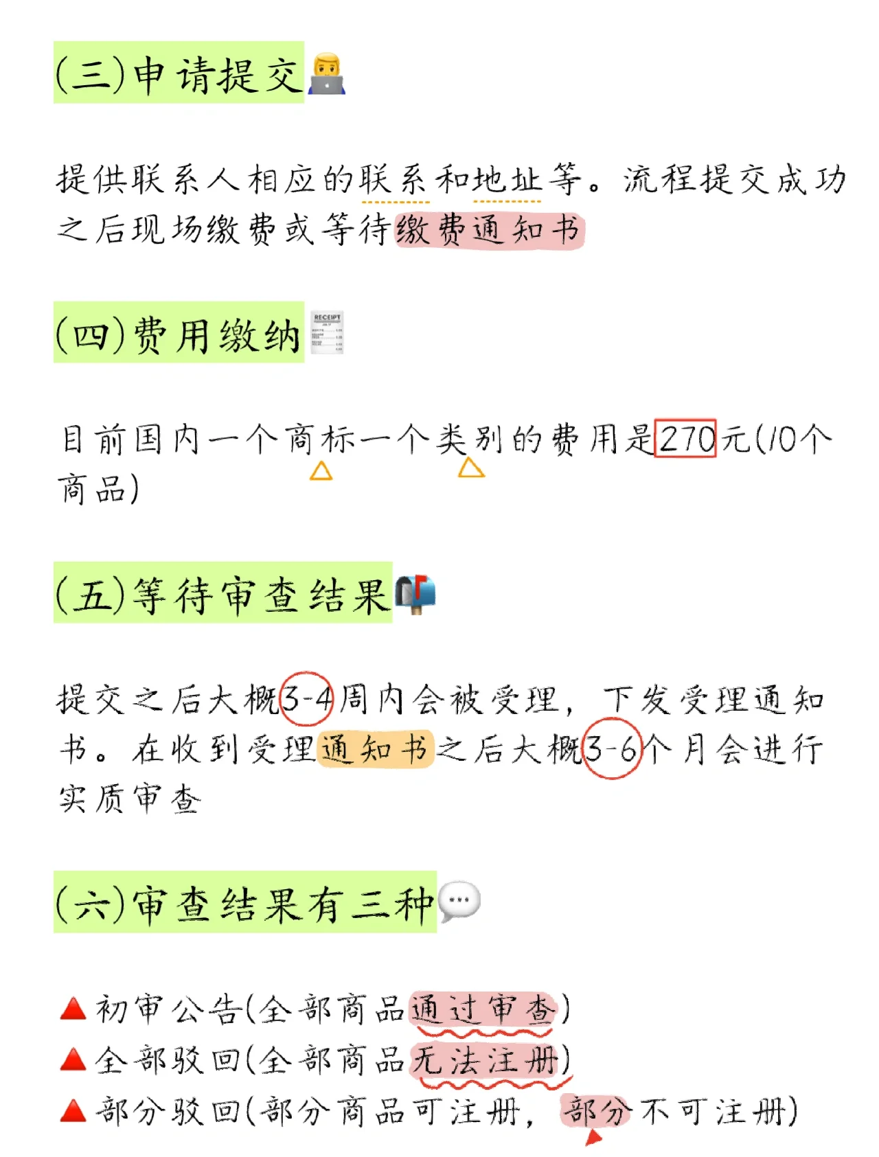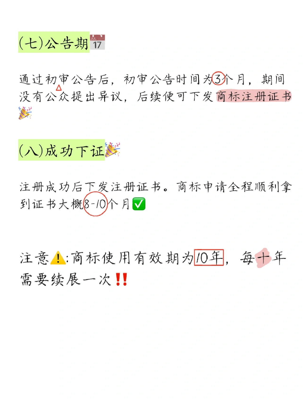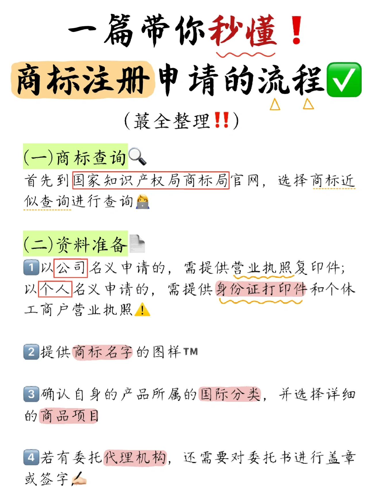 (1) 商标搜索 首先,进入中国国家知识产权局商标局官网,选择商标近似查询 (2) 数据准备 如果以公司名义申请,必须提供营业执照副本; 如果以个人名义申请,必须提供其身份证打印件和个体工商户营业执照 提供商标名称™的设计️ 确认您的产品的国际分类,并选择详细的产品项目 如果有委托代理,则有必要在授权书上盖章或签字 (3) 申请提交 提供相应的联系人和地址。成功提交流程后,进行现场付款或等待付款通知 (4) 费用的支付 目前,中国每个类别一个商标的成本为270元(10种产品) (5) 正在等待审查结果 提交后,它将在大约3-4周内被接受,并将发出接受通知。实质性审查将在收到验收通知后约3-6个月内进行 (6) 审查结果有三种类型 预审公告(所有产品均已通过评审) 所有被拒绝(所有产品都无法注册) 部分拒绝(有些产品可以注册,有些不能注册) (7) 公告期 初审公告通过后,初审公告时间为3个月,期间未提出公众异议,后续可颁发商标注册证书 (8) 是否成功颁发证书 注册成功后,颁发注册证书。商标申请过程顺利,取证耗时约8-10个月 当心: 该商标有效期为10年,每10年需要更新一次‼️
