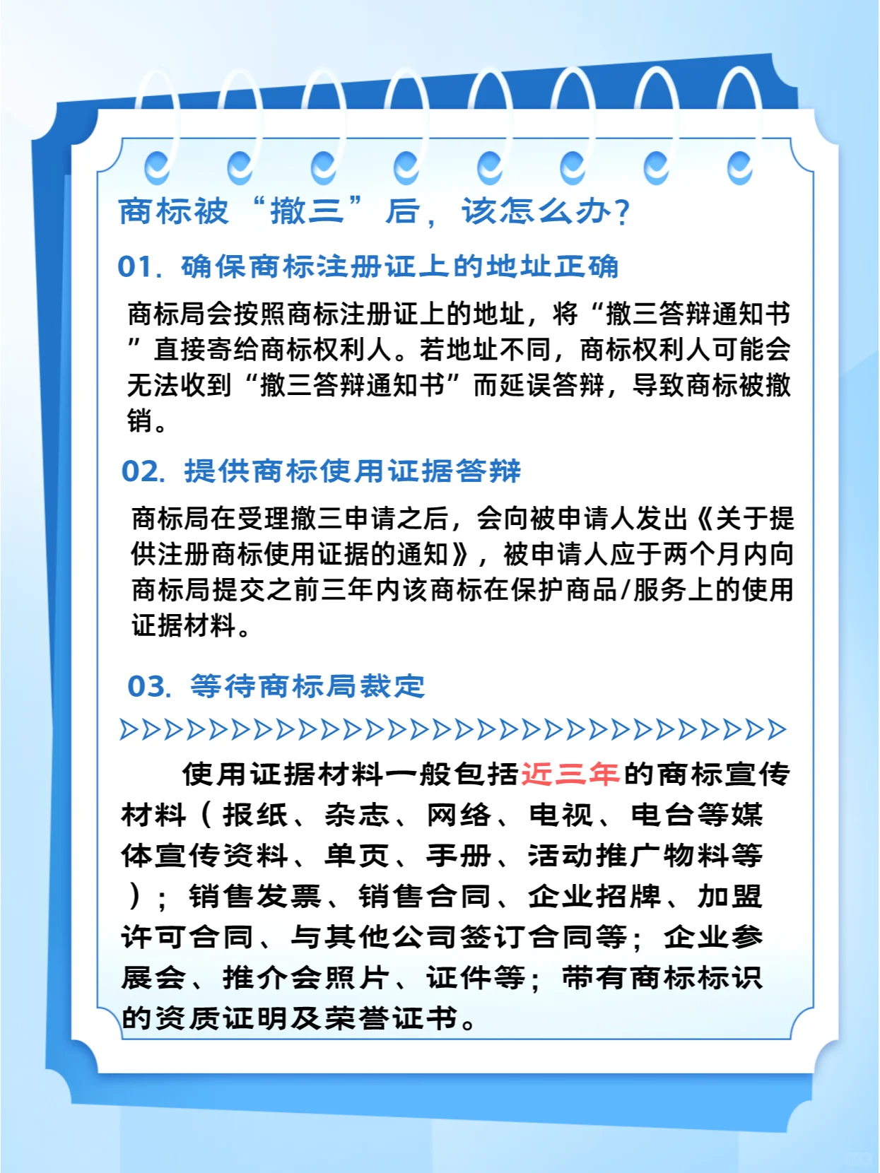正当理由是指不可抗力和干预之外的客观情况,如战争、地震、政府限制等。连续三年不使用是指商标使用处于不间断状态并持续三年以上。 商标被撤销后我该怎么办 1.确保商标注册证书上的地址正确无误。商标局将根据商标注册证上的地址,直接向商标所有人发出“撤回三防通知书”。如果地址不同,商标所有人可能无法收到撤回通知并延迟辩护,导致商标被撤销。 2。提供商标使用的证据进行辩护。商标局受理撤回申请后,将向被申请人发出关于提供使用注册商标证据的通知。被申请人应在两个月内向商标局提交前三年内使用商标保护商品/服务的证据。 3。正在等待商标局的裁决。 附言:证据材料一般包括过去三年的商标宣传材料(报纸、杂志、互联网、电视、广播等媒体宣传材料、单页、手册、活动宣传材料等);销售发票、销售合同、企业标志、特许经营许可合同、与其他公司签订的合同等;企业展览和宣传活动的照片、身份证明文件等;具有商标标识的资质证书和荣誉证书。
