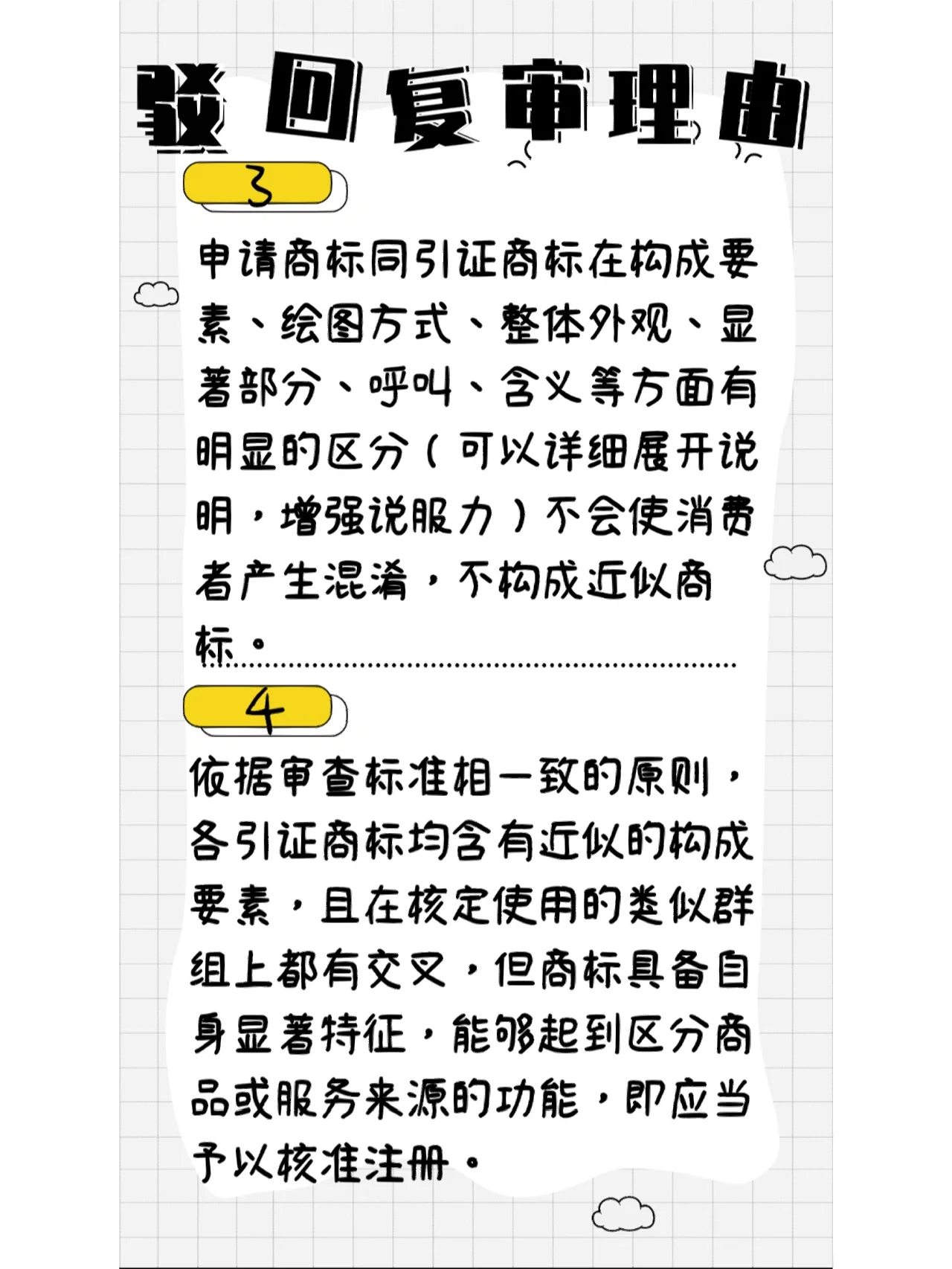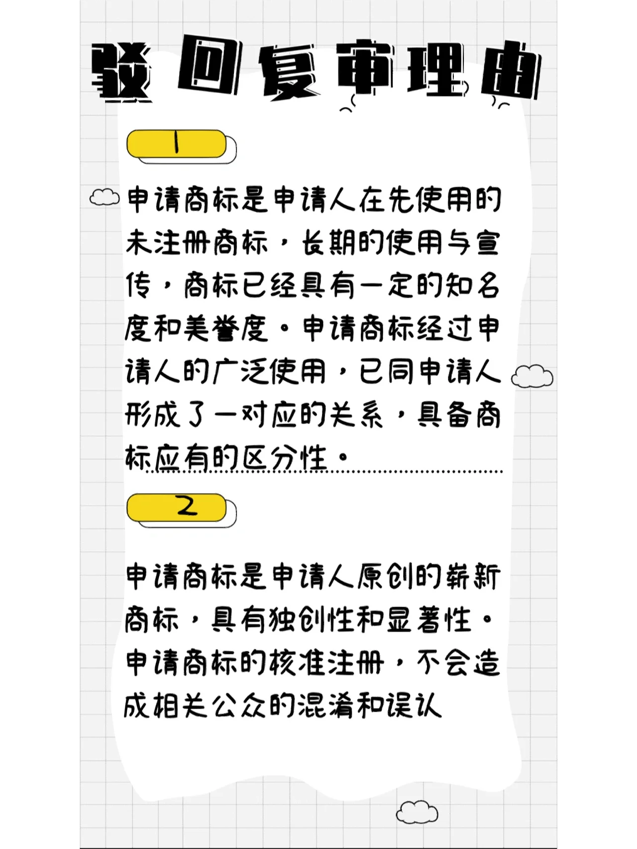 首先,在商标审查阶段,审查员对相关法律法规的理解和主观性决定了商标的结果。当我们进行驳回和回复审查时,有一个由三名或三名以上审查员组成的小组。超过一半的审查人员认为,如果在商标局审查阶段出现任何问题,该商标可以被收回。商标驳回和复审的过程比商标审查的过程更加谨慎,出错的概率相对较低。 那么,我们如何写下拒绝复查的原因,以提高复查的成功率呢以下四个原因必须牢牢记住! 1.申请商标是申请人以前使用过的未注册商标,经过长期使用和推广,该商标已经获得了一定的知名度和美誉度。商标申请已被申请人广泛使用,并与申请人形成相应关系,具有商标应当具有的显著性。 2.申请商标是申请人创造的具有独创性和显著性的全新商标。商标申请的批准和注册不会在相关公众中造成混淆或误认。 3.申请商标与引用商标在构成要素、画法、整体外观、突出部分、称呼、含义等方面有明确区别(可提供详细说明,增强说服力),不会给消费者造成混淆,不构成近似商标。 4.根据审查标准一致的原则,每个被引用商标包含相似的组成元素,并在批准使用的相似组中相交。但是,如果商标有自己的显著特征,并且能够区分商品或服务的来源,则应批准注册。 商标驳回和复审不容忽视。如果你觉得你的商标有被驳回和复审的希望,而且你不自信,你可以来找我!