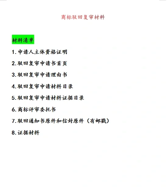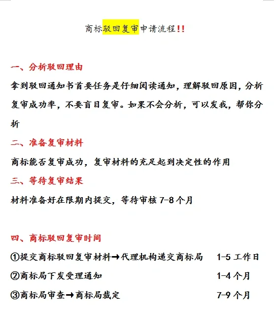 商标驳回审查申请流程!! 1、 分析拒绝的原因 收到拒收通知的首要任务是仔细阅读通知,了解拒收原因,分析复检成功率,避免盲目复检。如果你不知道如何分析,你可以把它发给我,帮助你分析 2、 准备评审材料 商标能否成功复审取决于复审材料的充分性,而复审材料的充足性起着决定性的作用 3、 正在等待审核结果 准备在截止日期内提交的材料,等待7-8个月的审查 4、 商标驳回审查时间 ① 提交商标驳回和复审材料→ 代理机构在1-5个工作日内向商标局提交 ② 商标局发出受理通知1-4个月 ③ 商标局审查→ 商标局裁定7-9个月 商标驳回审查材料 物料清单 1.申请人资格证书 2.复审申请驳回首页 3.驳回复审申请的理由 4.驳回复审申请材料目录 5.驳回复审申请材料的证据清单 6、商标评审授权书 7.拒收通知书正本及信封(盖邮戳) 8、证据材料
