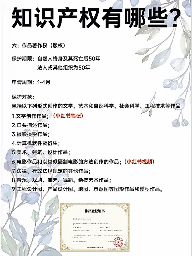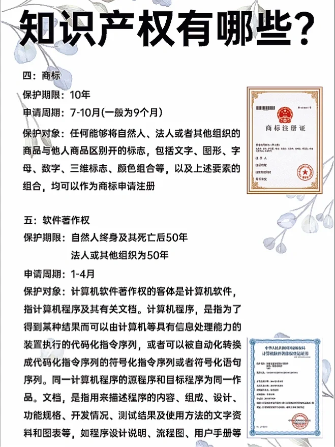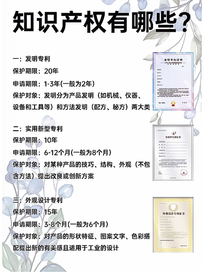 ️ 1.专利 (1) 发明专利:发明专利审查严格,含金量高,分为两类:产品发明(如机器、仪器、设备和工具)和方法发明(制造方法) (2) 实用新型专利:实用新型是指为产品的形状、结构或组合提出的适合实际使用的新技术方案。成本低,开发周期短。 (3) 外观专利:一种视觉新颖性,是公司的无形资产 ️ 2.商标 商标是用于将经营者的品牌或服务与其他经营者的商品或服务区分开来的标志。根据我国《商标法》,经商标局核准注册的商标,包括商品商标、服务商标、集体商标、证明商标等,享有商标专用权,受法律保护。如果它们是驰名商标,它们将获得跨类别商标专用权的法律保护。 ️ 3.软件版权 计算机软件著作权,是指软件开发者或者其他权利人依照有关著作权法的规定对软件作品享有的专有权。分为软件著作权个人登记和企业登记。企业要申请双软件认证或高新技术企业认定,必须确保著作权处于企业注册状态。 ️ 4.集成电路布局设计 它是指集成电路中至少两个有源元件和部分或全部互连电路的三维配置,或上述为制造集成电路而准备的三维配置。集成电路布图设计本质上是平面设计,但它不是工业外观设计,不受专利法保护。从获得专利的过程来看,专利申请的审批时间太长,成本高,不利于技术的推广和应用。 ️ 5.作品版权(版权所有) 文学、艺术和科学作品的作者对其作品享有的权利(包括财产权和人身权)。版权是一种知识产权,包括自然科学、社会科学以及文学、音乐、戏剧、绘画、雕塑、摄影、图像和电影摄影的作品。 ️ 这也包括在小红书或其他平台上发布的任何原创笔记、图片、短视频和其他作品。️