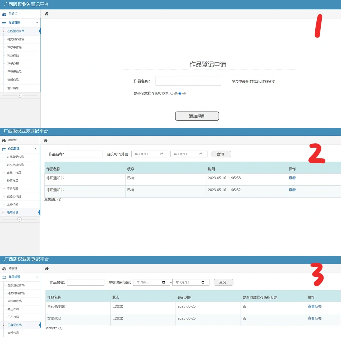 不要认为版权注册很难! 别以为版权登记很麻烦! 其实很简单 以广西的版权登记平台为例,从申请之初到证书颁发,这一过程大约需要两周时间。事实上,这根本不需要那么长时间,只是因为材料的更正导致了几天的延迟。 1.先注册并登录 2.如实填写各种信息,包括作品的创作日期和完成日期、首次发表日期等。 3.上传证明材料。在这里,您需要自己打印纸质材料,签名并按下指纹,然后扫描并上传(您可以使用Apple Memo中的“扫描文档”功能)。请记得在“其他材料”部分上传一些源文件过程的截图。我在这方面做了必要的更正。 4.验证提交 5.等待官方电话确认(可能不是必要步骤) 6.获得认证 是不是很简单!感谢祖国,感谢版权局的工作人员!原创并不容易,你必须保护好自己的作品。