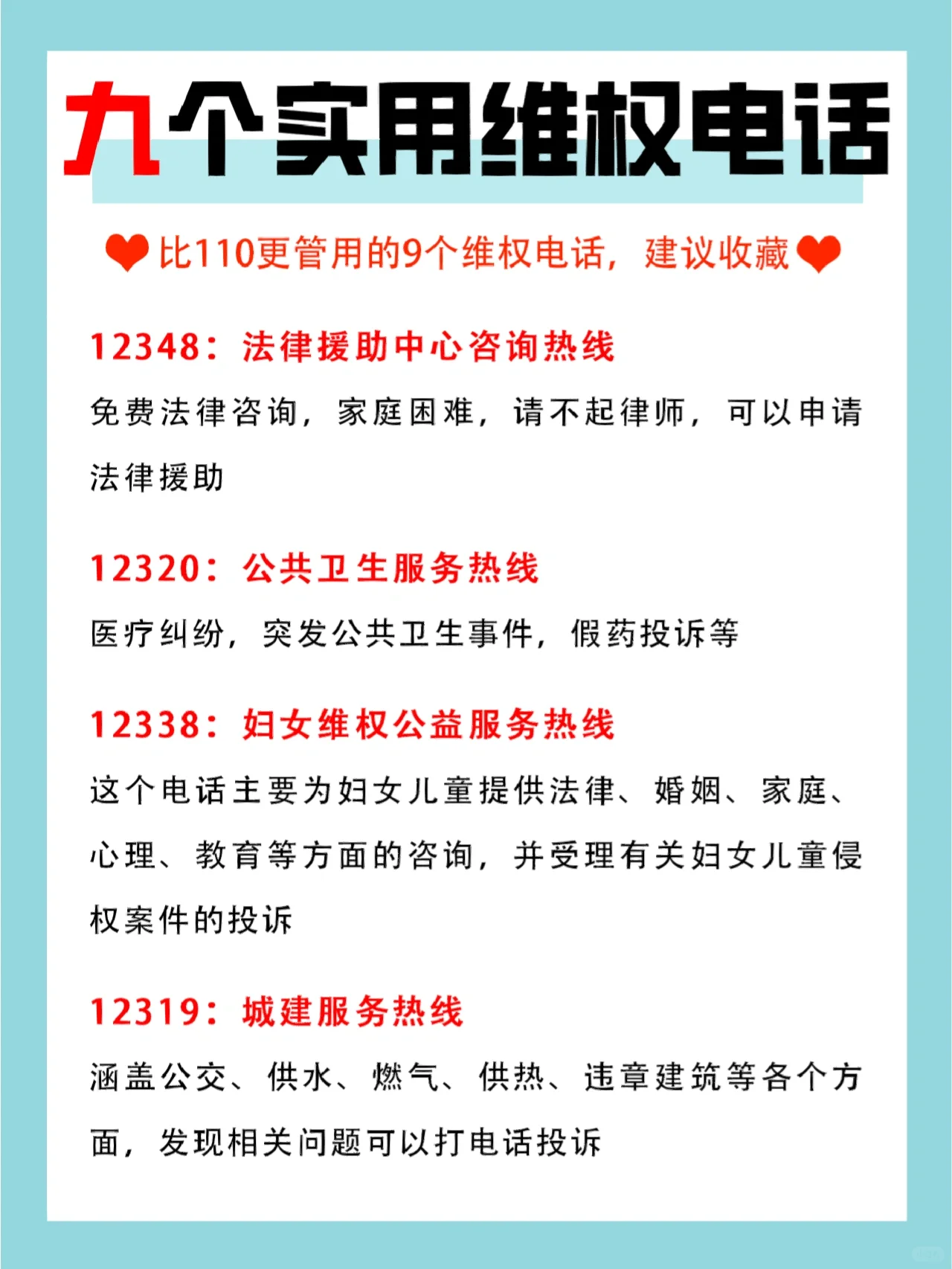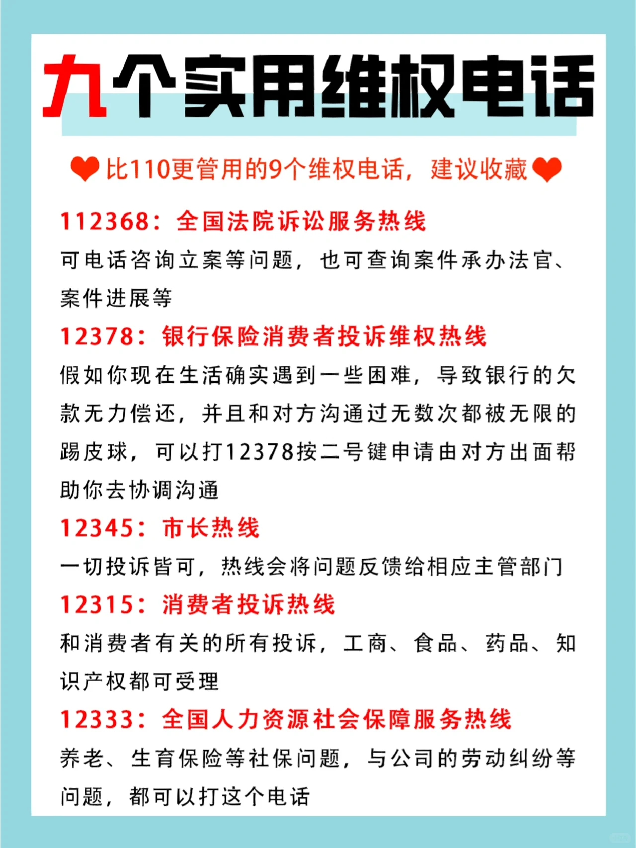 在生活中,我们总是会遇到令人沮丧的事情。我们如何才能直接有效地投诉和维权一定要阅读这9个维权电话号码,作为预防措施,建议保留它们 〰️ 全国法院诉讼服务热线 12378:银行保险消费者投诉维权热线 12345:市长热线 12315:消费者投诉热线 12333:全国人力资源和社会保障服务热线 12348:法律援助中心咨询热线 12320:公共卫生服务热线 12338:妇女维权公共服务热线 12319:城建服务热线