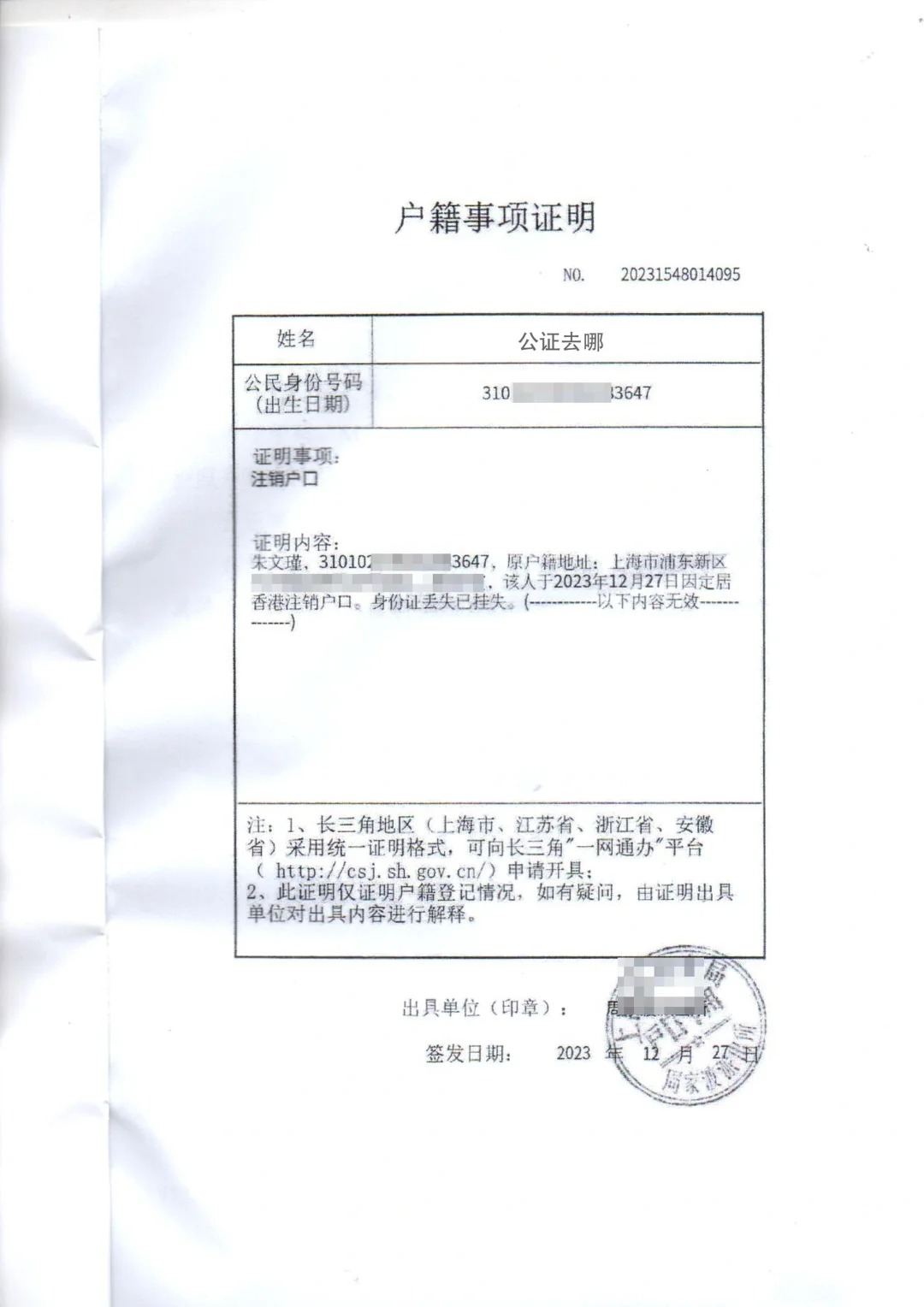 事项说明: 户籍注销证明公证是指公证机构根据公证当事人的申请,对其已注销户籍这一法律事实予以证明的活动。 注意事项: 户籍注销证明:只能派出所或者公安机构出具,其他机构出具的户籍注销证明无效。 材料准备: 申请人的身份证原件; 申请人的户口簿原件,集体户籍的申请人提供《常住人口登记卡》本人页原件及经过户籍所在单位 盖章的首页复印件; 原户籍所在地开具的户籍注销证明; 如非本人办理,还应提供授权委托书、代理人的身份证件; 如果您所提供的证据材料不足以证明所申办公证事项时,请根据公证员的要求补充证明材料。 注意:结合各地政策调整,公证机构要求的材料会有所差别,详情请咨询当地公证机构。 在线申请流程: 发起:根据您的需求选择对应公证事项。 审核:根据公证事项的不同,您可能需要提供不同的个人信息与证据材料,提交后我们将会对您的申请进行审核。审核期间,公证处可能要求您补充额外的证据材料。 受理:在线提交订单并直接使用支付宝、微信等支付工具支付公证费用。支付后,申办将直接进入受理状态,您只需等待系统通知即可。 领取:默认发顺丰到付给您,海外可以代发国际快递。