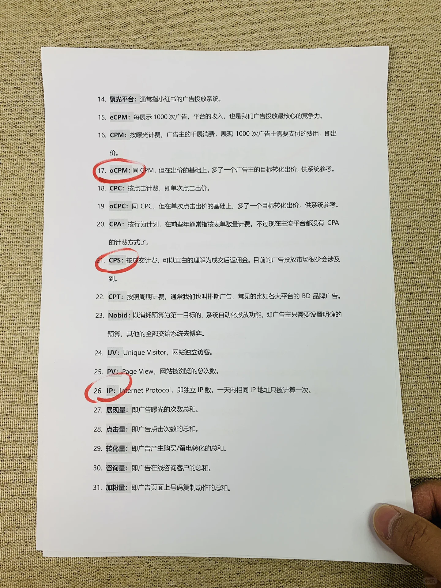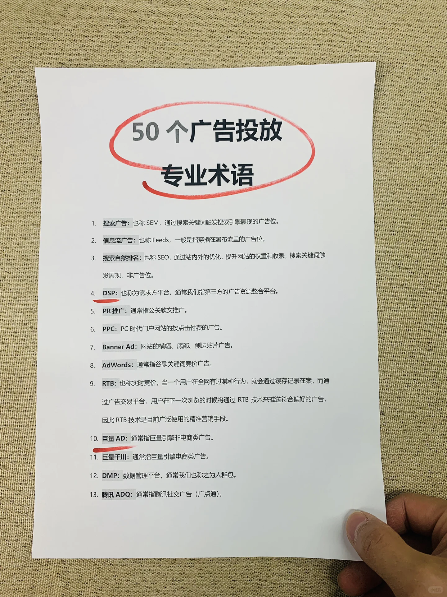 [列表R]1。搜索广告:也称SEM,通过搜索关键词触发搜索引擎显示广告位。 [列表R]2。信息流广告:又称Feeds,一般指散布在瀑布流中的广告空间。 [列表R]3。自然搜索排名:也称为SEO,通过网站内外的优化来提高网站的权重和包容性。搜索关键词触发显示,而不是广告位。 [列表R]4。DSP:也被称为需求侧平台,我们通常指的是第三方广告资源整合平台。 [列表R]5。公关推广:通常指公关软文的推广。 [加一个R]6。PPC:在PC时代的门户网站上点击付费广告。 [加一个R]7。横幅广告:网站上的横幅、底部和侧面补丁广告。 广告词:通常指谷歌关键词竞价广告。 [加一个R]9。RTB:也称为实时竞价,当用户在整个网络上有某种行为时,会通过缓存进行记录,并通过广告交易平台,用户下次浏览时会使用RTB技术推送与其偏好相匹配的广告。因此,RTB技术目前被广泛用作精准营销工具。 [加一个R]10。海量广告:通常指海量引擎的非电商广告。 [斜视R]11。海量千川:通常指海量引擎的电商广告。 [斜视R]12。DMP:数据管理平台,通常称为群组包。 [斜视R]13。腾讯ADQ:通常指腾讯社交广告(广点通)。 [斜视R]14。聚光灯平台:通常指小红书的广告投放系统。 [斜视R]15。eCPM:每显示1000个广告,平台的收入也是我们在广告投放方面的核心竞争优势。 太多了,我已经整理好了完整的版本[失望的R]