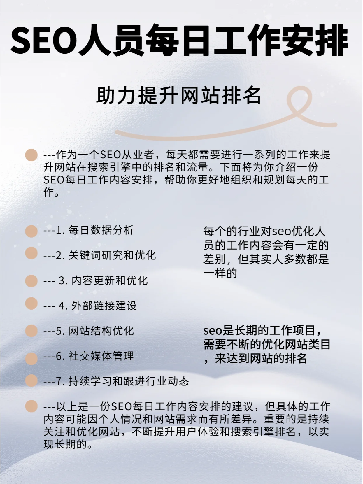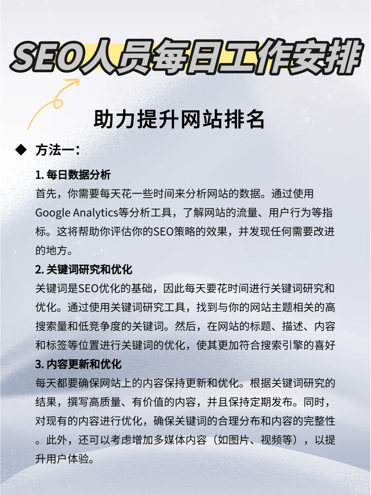 ---作为一名SEO从业者,我每天都需要做一系列的工作来提高网站在搜索引擎中的排名和流量。下面,我们将介绍每日SEO工作时间表,帮助您更好地组织和计划日常工作。进一步提高网站排名 ---1日常数据分析 ---2关键词研究与优化 ---3内容更新和优化 ---4外链施工 ---5网站结构优化 ---6社交媒体管理 ---7不断学习和跟进行业趋势 ---以上是SEO日常工作安排的建议,但具体工作内容可能会因个人情况和网站需求而异。重要的是要持续监控和优化网站,不断提高用户体验和搜索引擎排名,才能取得长期成功。通过安排SEO专业人士的日常工作内容,网站排名可以更快地提高