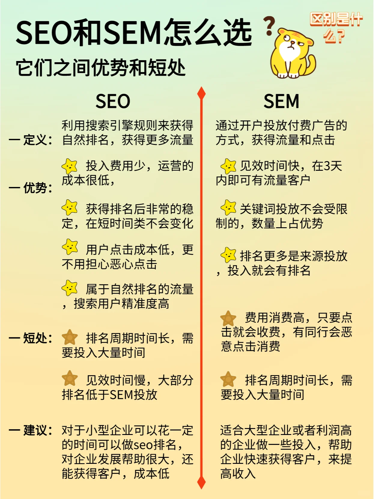 如何选择SEO和SEM 它们之间有什么区别和联系 SEO和SEM定义:使用搜索引擎规则获得自然排名并获得更多流量。SEM是一种通过开户和投放付费广告来获得流量和点击量的方法 SEO和SEM的优缺点,如何选择: SEO的优点:投资成本低,运营成本低,排名非常稳定,短时间内不会改变等级。用户点击成本低,不必担心恶心的点击。属于自然排名的流量对用户的搜索精度很高。 SEM的优点:响应时间快,可以在3天内产生流量。对客户关键词的放置没有限制,而且在数量上有优势。排名更多的是来源投资,投资会有排名。 SEO的缺点:排名周期长,需要大量的时间投入,有效时间慢。大多数排名都低于SEM广告的排名。 SEM的缺点:成本消耗高,只要点击就会被收费,一些同行会恶意点击消费。排名周期很长,需要大量的时间投入。有些公司在早期阶段发展不起。 建议:在SEO方面,小企业可以花一定的时间做SEO排名,这对他们的发展很有帮助,也可以吸引客户。在低成本的情况下,他们可以不断尝试。SEM适合大型企业或高利润企业进行一些投资,帮助他们快速获得流量和潜在用户,以增加收入。但中小型企业也可以适当投资一部分,进行尝试。