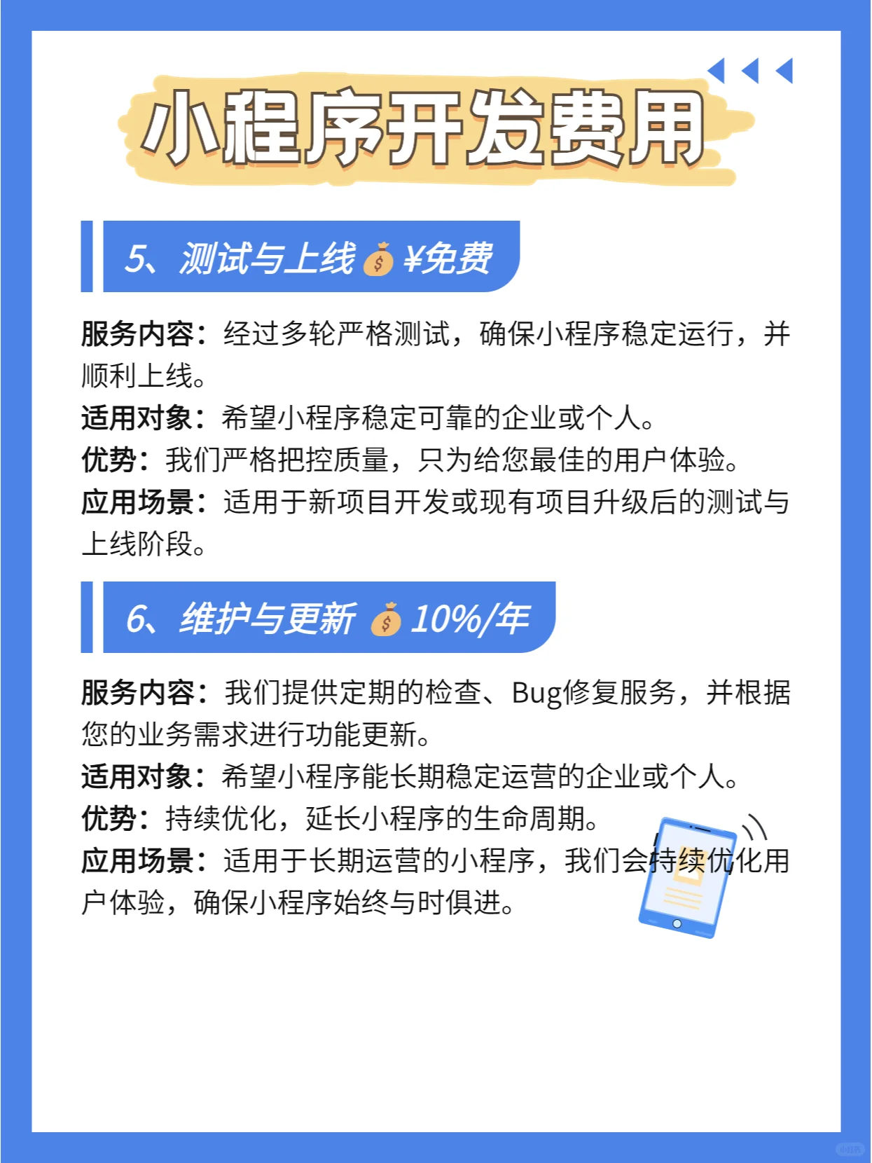 认证费 迷你程序的身份验证至关重要,因为它涉及到用户是否可以正常启动和搜索迷你程序。认证费用主要分为微信认证和支付宝认证。 微信认证费:300元,个人和企业均可进行认证。个人认证需要提供身份信息,企业认证需要提供营业执照和组织机构代码证书等。 域名费 给迷你程序起个好名字很重要,但你也需要注册一个专用域名。 注册费:大约在50到100元之间,你可以选择后缀,如.com,。cn,。net等。 服务器 运行迷你程序的后端需要强大的服务器支持,选择一台好的服务器至关重要。 购买成本:根据您需要的配置(如CPU、内存、硬盘容量等),大约在1000到3000元之间。 程序开发 开发成本是小程序开发中最大的支出,主要涉及前端、后端和服务器租赁。 开发成本:大约在5000到20000元之间。这需要专业的开发人员根据设计师的设计草案来开发所需的迷你程序功能。 以上是小程序开发的基本成本。当然,这只是基本成本,不包括推广和后期维护等其他费用。我希望这对你有帮助。如果你还有其他问题,随时可以问