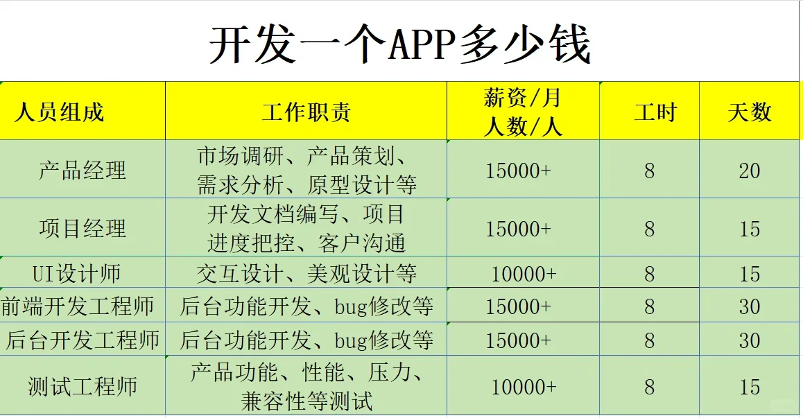 开发应用程序的成本因各种因素而异,具体成本取决于应用程序的类型、功能的复杂性、精致设计的水平及其满足的用户需求。 开发该应用程序的具体成本如下: 【拔草R】【拔草R】功能需求分析和设计成本:在开发应用程序之前,需要进行需求分析和需求设计,以确定所需的功能和用户界面。这份工作的费用通常在1万到5万元之间。 开发成本:应用程序的开发成本通常取决于开发公司或开发者的收费标准,以及所需的功能和设计。一般来说,开发一个简单的应用程序大约需要10万至20万元,而开发一个复杂的应用程序可能需要30万至50万元。 【Weeding R】【Weeding R】测试成本:开发完成后,还需要进行全面测试,以确保应用程序的稳定性和性能。检测费用通常在1万至3万元之间。 [Straw R][Straw R]发布和推广成本:发布和推广应用程序需要营销和广告,这也是开发成本的一部分。出版和推广的费用通常在10万到20万元之间。 总体而言,开发一个简单的应用程序大约需要一个月的时间,一般成本从8万到10万元不等,而复杂的应用程序则需要更多的时间,从数万元不等。具体要求应根据详细要求确定。 重要的是要选择一个合格且有能力的开发团队,最好是一家实体公司,以防止出现陷阱。