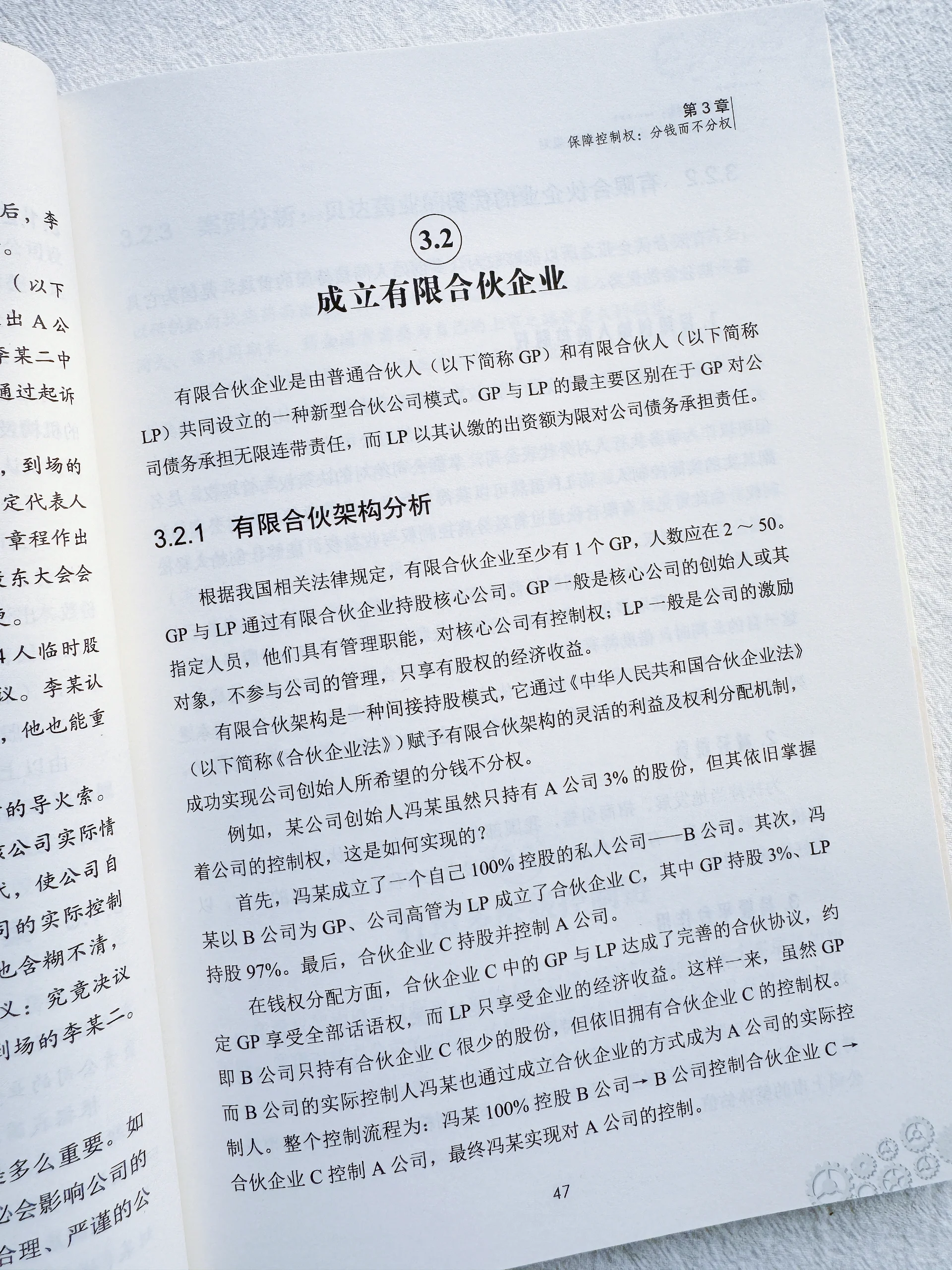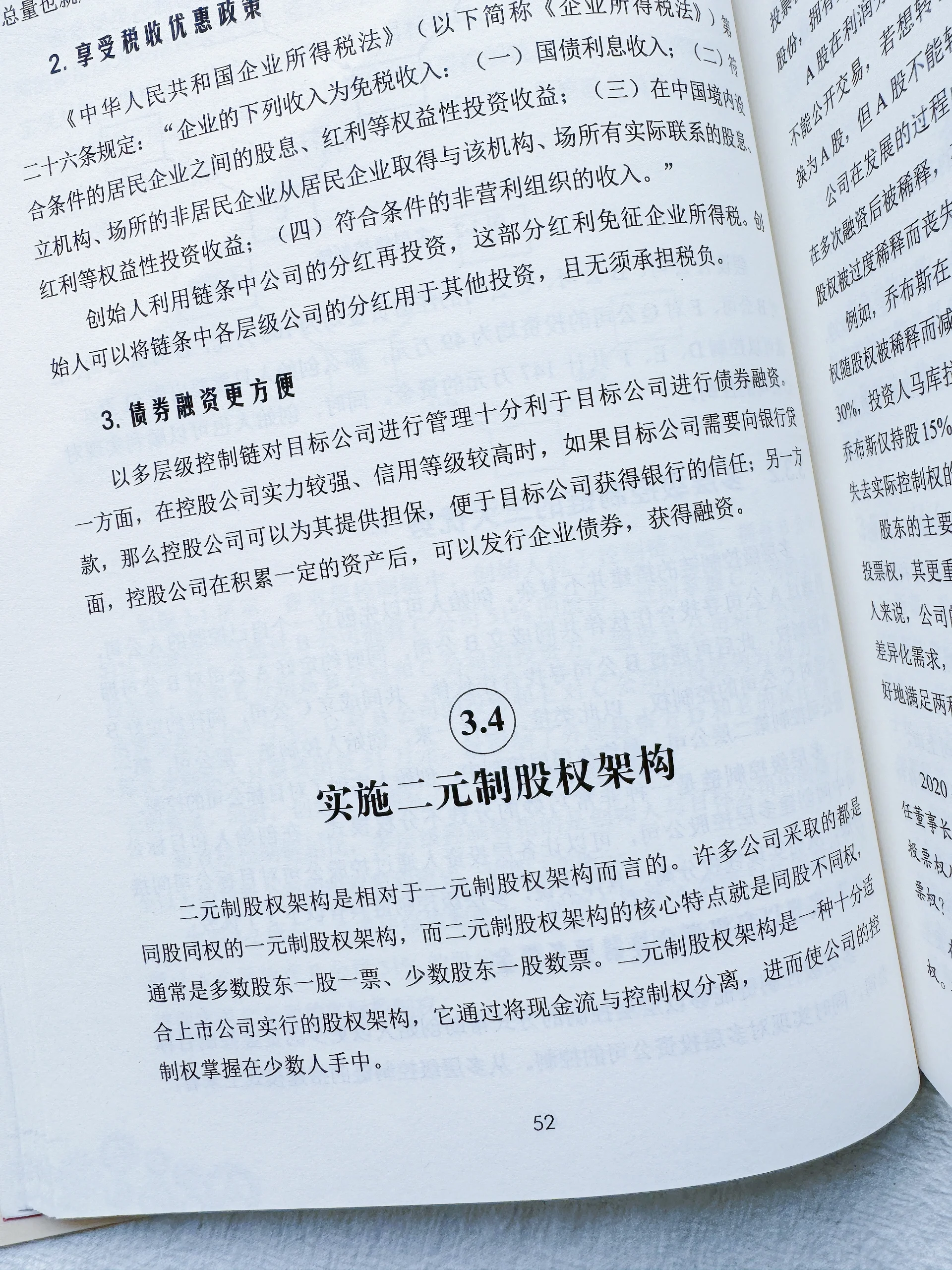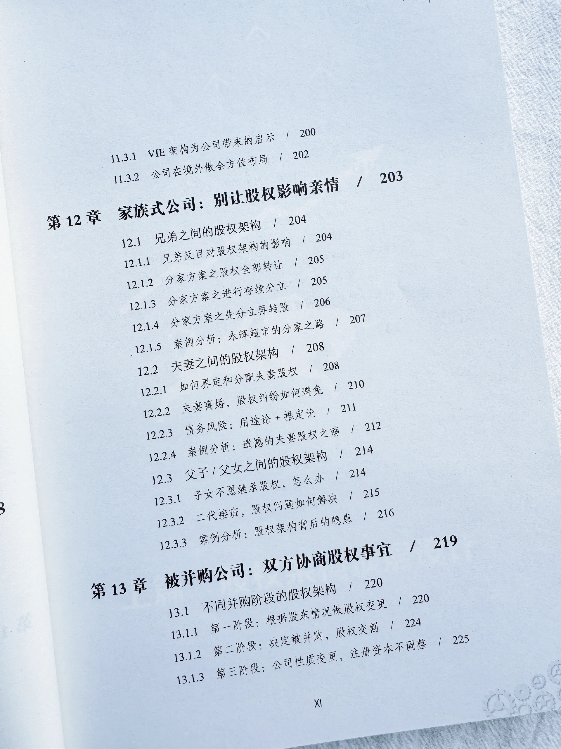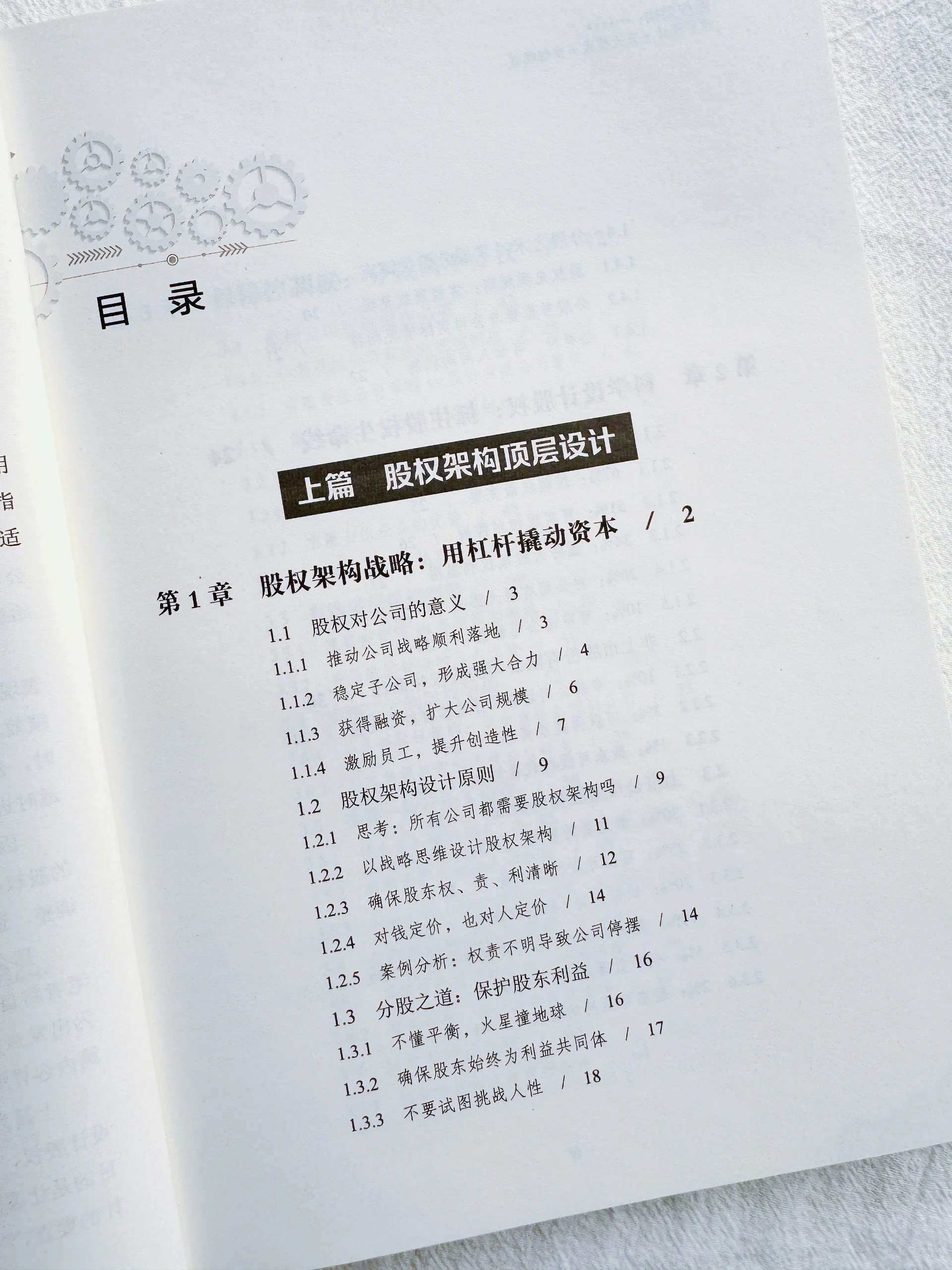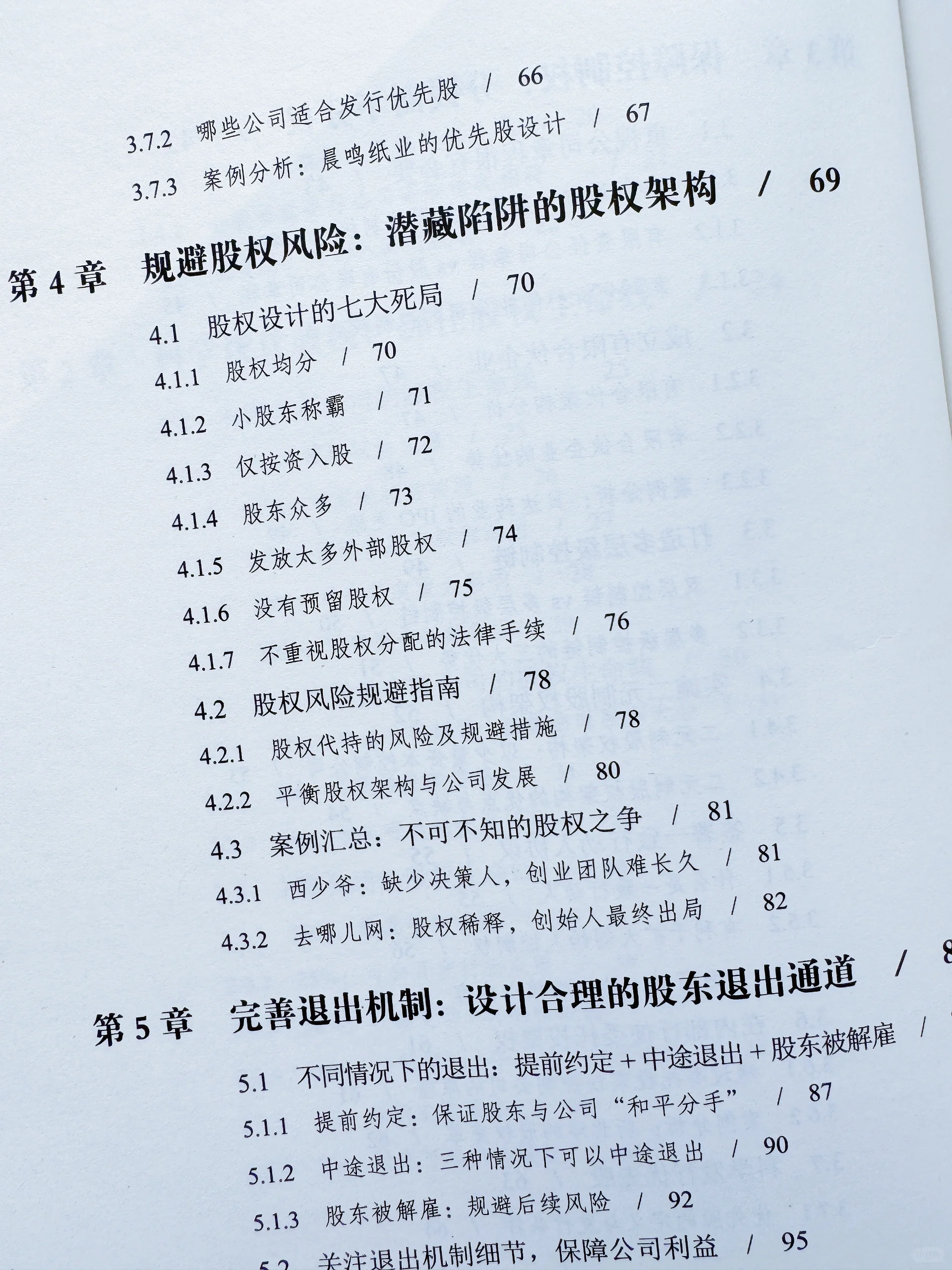 近年来,因忽视股权结构导致的股权纠纷案件频发,导致创业团队解散,公司发展受挫公司股权结构不合理的风险有哪些风险有多大 员工和老板都应该学习和掌握股权和股权结构设计的基本原则和方法,这样他们至少可以清楚地了解自己在公司的地位、权利以及如何避免相关风险 如果你是企业家、企业家、股权经理,或者对股权结构设计感兴趣,我建议你读这本书《股权结构:顶层设计+五种模式+重组规划》,一本可以帮助你管理公司和设计股权的宝库工具书 本书聚焦股权结构,将股权结构分解为三个部分:股权结构顶层设计、股权结构模型解码和股权结构重组规划。目的是帮助读者从理解股权结构开始,逐步设计股权结构,避免常见的风险和陷阱 第一部分:股权结构顶层设计 阐述了股权结构战略,基于股权生命线科学设计股权,分散确保控制权,从多个方面规避股权风险,使我们认识到股权结构对公司运营的重要性,理解了股权结构设计的要点‼ 第二部分:股权结构模型的解码 分析了五种主要的股权结构模式:自然人股权结构、有限合伙股权结构、控股股权结构、混合股权结构和子公司股权结构。本文还结合了许多知名企业的实践案例,内容非常丰富 第二部分:股权重组方案 解释了潜在上市公司、家族企业和被收购公司股权重组的注意事项和方法,并结合了许多经典案例 根据公司类型和发展阶段,企业家可以从这本书中找到合适的股权结构设计方法,以合理的股权结构促进公司的健康发展,而不必再担心股权设计问题 我相信读完这本书,你一定会有所收获,事业也会一帆风顺