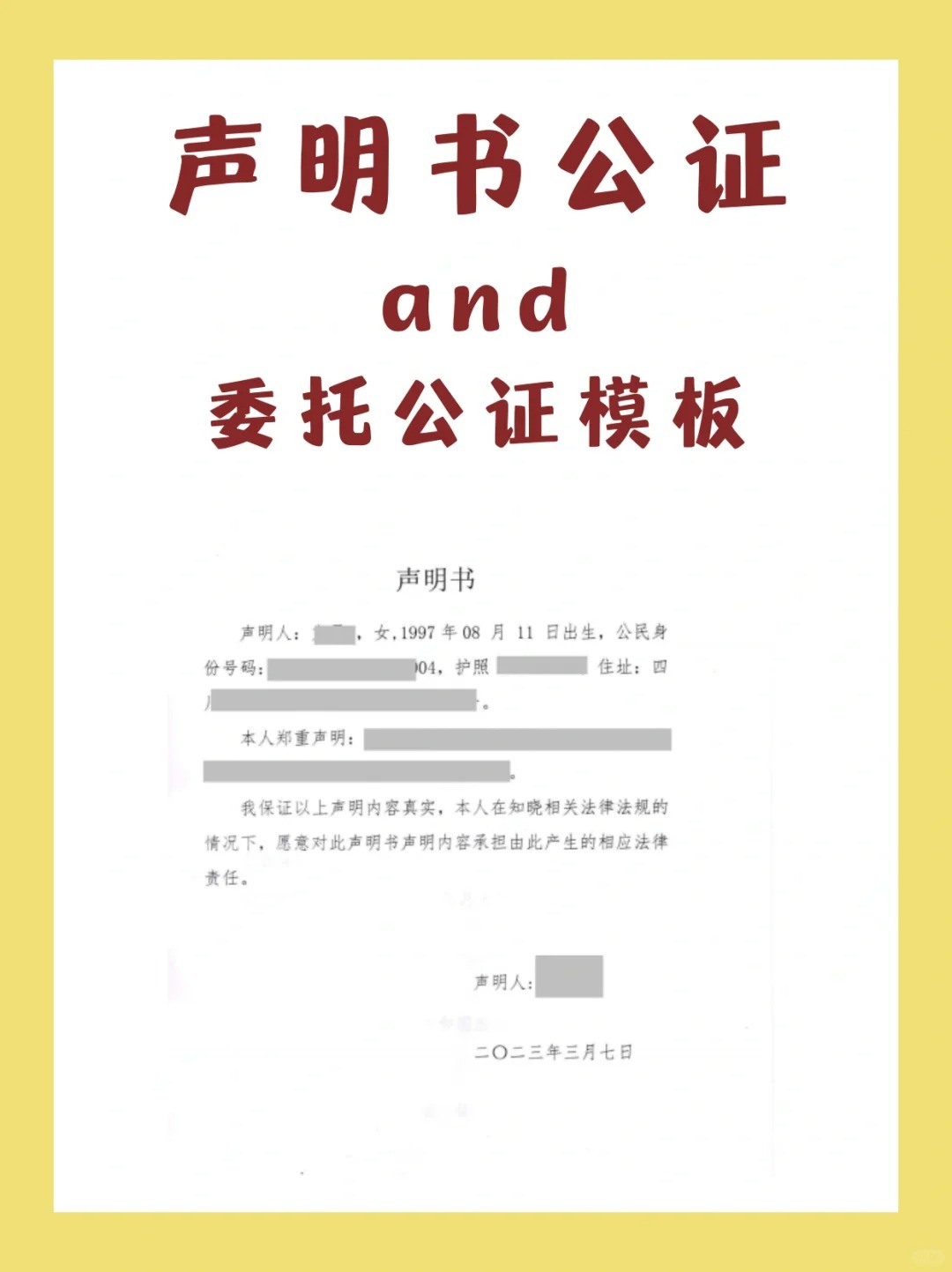 常见的声明有: 1、继承人继承活动中放弃对被继承人遗产的继承权的单方意思表示的声明。 2、未成年人的法定代理人在处分未成年人的财产时所作的保护未成年人利益的声明。 3、当事人做出的对于自己未婚/未再婚状况所做的声明。一般用于按揭买房屋,房管部门、BANK会要求当事人签署“未婚/未再婚声明”,对声明内容的真实性负责。 4、改名声明。到派出机关更改姓名时,派出机关一般会要求当事人出具一份改名声明公证书,内容为当事人自愿更改自己的姓名,对更改姓名产生的法律和经济责任自行承担。 5、委托人终止对受托人的授权所作出的终止委托声明。 委托书应具备以下内容: 1. 委托人与受托人的基本情况(姓名、性别、出生日期、现在住址); 2. 委托人与受托人的关系; 3. 委托的原因; 4. 委托的权限(委托权限要明确、具体); 5. 委托期限; 6. 受托人有无转委托权; 7. 其他应明确的内容。 需要代办的可以找我。