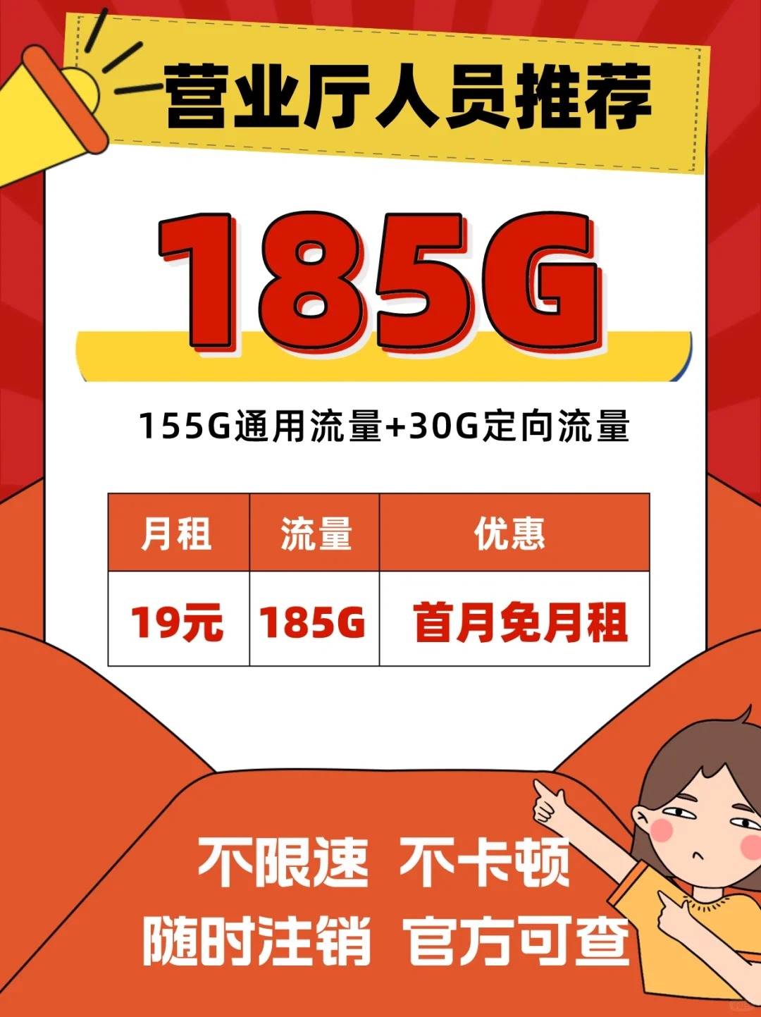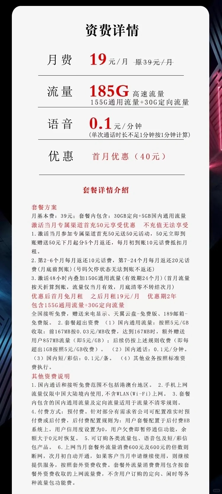 想省钱省事更省心的宝子,看这里! 靠谱电信神卡,低月租大流量!新年回归! 19元=155G通用+30G定向 长期套餐 185G高速流量不限速 接打电话 发短信 正规号卡 官方APP可查 资费详情 【月费】:19元/月 【流量】:每月185GB流量(155g通用流量+30g定向流量) 定向流量适用于抖音等APP使用,适用APP范围可能有变化,以中国电信官方公布为准 【通话】:0.1元分钟,接听免费 需要办理的宝子私我办理 我是省话费的专业人士,长期服务几万个宝子!不仅有超值手机卡推荐,还有实用省钱小技巧分享,让你的话费降低50-80%!