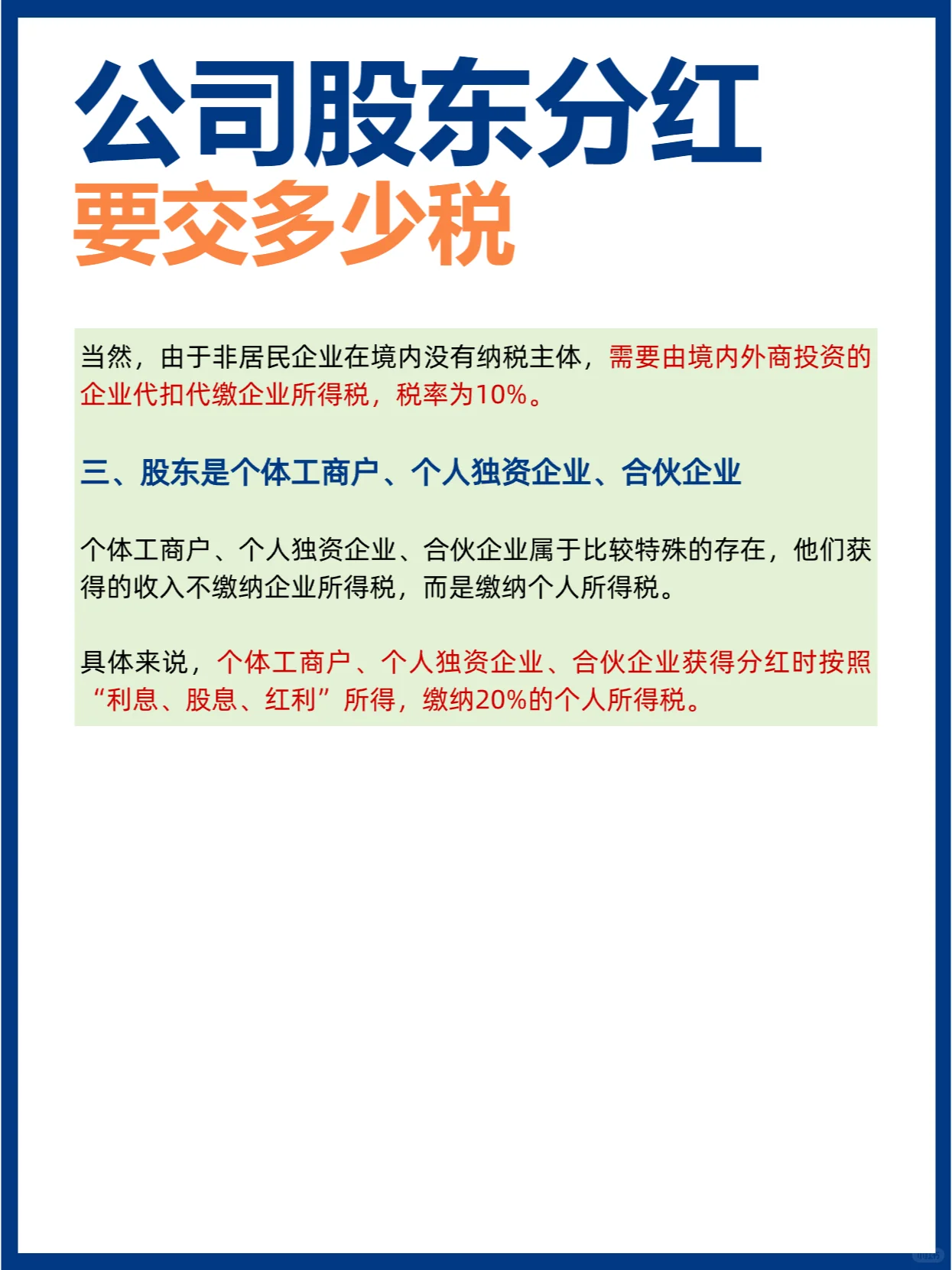 1、 股东是自然人 1.作为自然人,从非上市公司获得股息的股东需要根据其利息、股息和奖金收入缴纳20%的个人所得税。需要注意的是,自然人从其投资的个体工商户、独资企业、合伙企业领取股息时,不需按“利息、股息、红利收入”缴纳20%的个人所得税,而需按“营业收入”缴纳个人所得税。 2、股东作为自然人,在接受上市公司分红时,有三种情形需要缴纳个人所得税: 持有上市公司股票不足一个月的股东,应当按照其利息、股息、红利所得缴纳20%的个人所得税; 股东持有股票一个月以上不满一年的,按照其利息、股息、红利所得减征50%的个人所得税,即缴纳10%的个人所得税额; 股东持有上市公司股票超过一年的,免征个人所得税。然而,这只是免税,而不是免税本身。 3、股东为外国个人,从在华投资的外资企业领取股息时免征个人所得税。同样,在中国投资股票的外国个人可以免除其股息的个人所得税。 2、 股东是企业 当股东是企业时,他们不需要投资于公司来代扣代缴税款,而是公司在收到股息后自行计算和缴纳企业所得税。 1.居民企业从非上市公司领取股息时,免征企业所得税。需要注意的是,在这里,居民企业之间的直接投资可以免征企业所得税。 2.居民企业从上市公司获得股息时,需要在两种情况下进行讨论:居民企业持有上市公司股份超过一年的,免征企业所得税;居民企业持有上市公司股票不足一年的,应当按照适合企业的税率缴纳企业所得税。 3.在讨论非居民企业和居民企业的股息时,有必要将其分为两种情况:非居民企业获得的股息是居民企业在2008年1月1日之前形成的未分配利润,在这种情况下,股息可以免征企业所得税。非居民企业取得的股息是居民企业在2008年1月1日以后形成的未分配利润,非居民企业依法缴纳企业所得税。 当然,由于非居民企业在境内没有纳税主体,需要由境内外商投资企业代扣代缴企业所得税,税率为10%。 3、 股东是个体企业、独资企业和合伙企业 个体企业、独资企业和合伙企业是相对特殊的实体,它们的收入不缴纳企业所得税,而是缴纳个人所得税。具体而言,个体工商户、独资企业和合伙企业在领取股息时,应就其“利息、股息和奖金”收入缴纳20%的个人所得税。