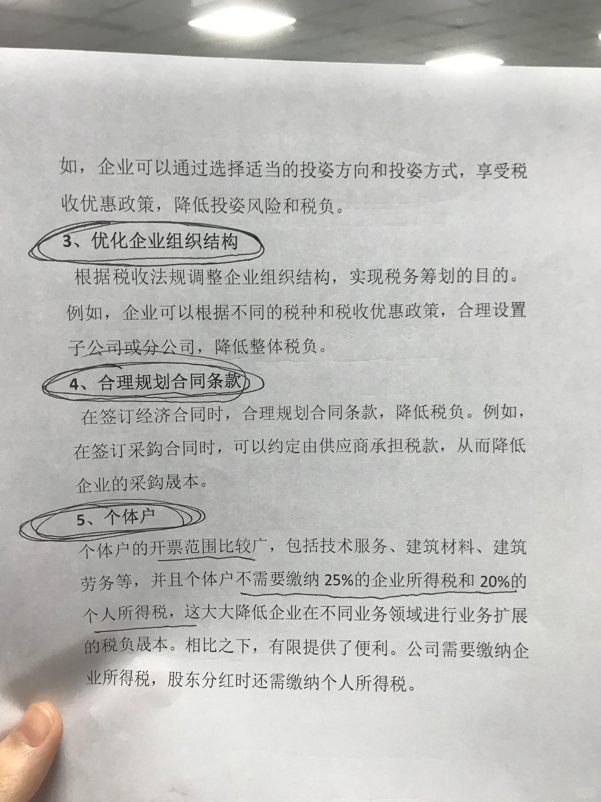预先计划:只有预先计划才称为税务计划,而事后计划可能导致逃税。税务规划必须在业务运营发生之前进行。 如实申报:绝不碰虚开发票!尊重基于投票的税收和基于数字的税收。 四流合一:发票流、资金流、合同流、货物物流要统一对应。这是税务部门判断是否存在逃税行为的重要依据,不一致可能导致税务检查。 业务真实性:不从事空壳公司虚假陈述、更改发票、会计核算或“拆分”牟利。 合理的商业合作:识别法律依据,合法合规地规划,而不是在灰色地带钻空子。 以下是常见的税收融资方式: 1.合理利用税收优惠政策 关闭并充分利用税收优惠来减轻企业税收负担。例如,《企业所得税法》规定,对符合条件的小微企业,减按20%的税率征收企业所得税;对国家鼓励的高新技术企业,减按15%的税率征收企业所得税。 2.合理安排资金运作 通过合理安排资金运作,降低资金成本,减轻企业税负。例如,公司可以通过选择适当的投资方向和方法,享受税收优惠,降低投资风险和税收负担。 3、优化企业组织结构 根据税收法规调整企业组织结构,以达到税收筹划的目的。例如,企业可以根据不同的税种和税收优惠政策合理设立子公司或分支机构,以减轻整体税负。 4.合理规划合同条款 签订经济合同时,合理规划合同条款,减轻税负。例如,在签订采购合同时,可以约定由供应商承担税款,从而降低企业的采购成本。 5.个体工商户 个体工商户的开票范围相对较广,包括技术服务、建筑材料、建筑服务等,且个体工商户无需缴纳25%的企业所得税和20%的个人所得税,大大降低了企业在不同经营领域扩张的税负。相比之下,有限提供了便利。公司需要缴纳企业所得税,股东在分配股息时也需要缴纳个人所得税。