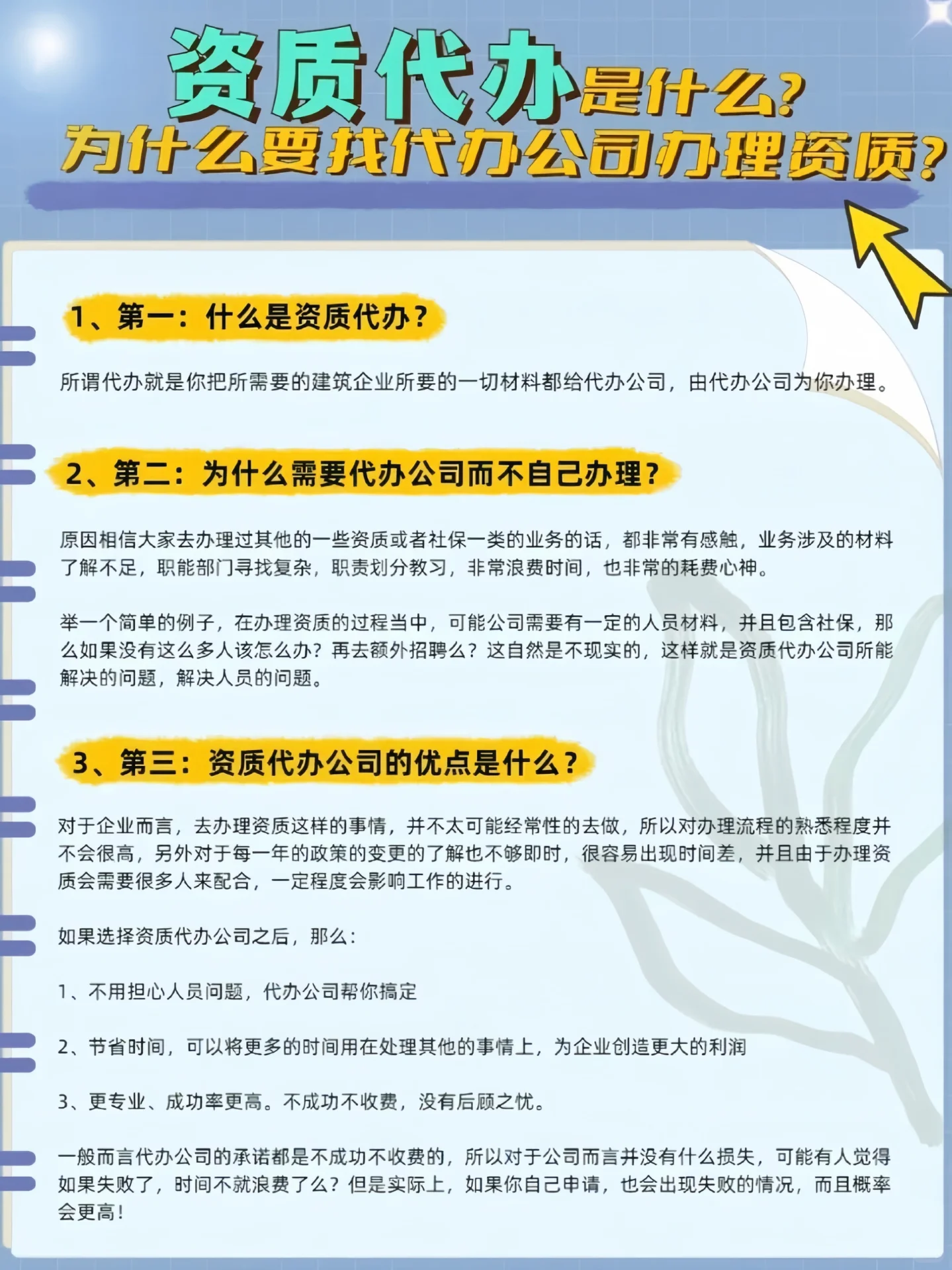 什么是资格认证机构为什么我们需要找一家资质机构 1:什么是资格认证机构 所谓代办,就是把施工企业需要的材料全部交给代办公司,由代办公司代为办理。 2:为什么我们需要一个代理公司,而不是自己处理 我相信,如果你以前申请过其他资格或社会保障服务,你会有深刻的理解。业务中涉及的材料没有得到很好的理解,职能部门搜索起来很复杂,职责也被划分和教导。这是浪费时间,也是浪费精力。 例如,在申请资格的过程中,公司可能需要有一定的人事材料,包括社会保障。那么,如果没有那么多人呢你打算招聘更多的员工吗这自然是不现实的,这是资质代理公司能够解决和解决人员问题的问题。 3:资质机构的优势是什么 对于企业来说,不可能定期办理资质,因此对申请流程的熟悉度不是很高。此外,每年对政策变化的了解不够及时,很容易导致时间差异。此外,由于许多人在申请资格时需要合作,这在一定程度上会影响工作的进度。 如果您选择资质机构,则: ① 不要担心人事问题,代理机构会帮你处理的 ② 节省时间可以将更多的时间用于其他任务,为企业创造更大的利润 ③ 更专业,成功率更高。失败不收费,不用担心。 一般来说,代理公司的承诺是不成功的,而且是免费的,所以公司没有损失。有些人可能会认为,如果他们失败了,那将是一种浪费但在现实中,如果你自己申请,也会出现失败的情况,而且概率会更高!