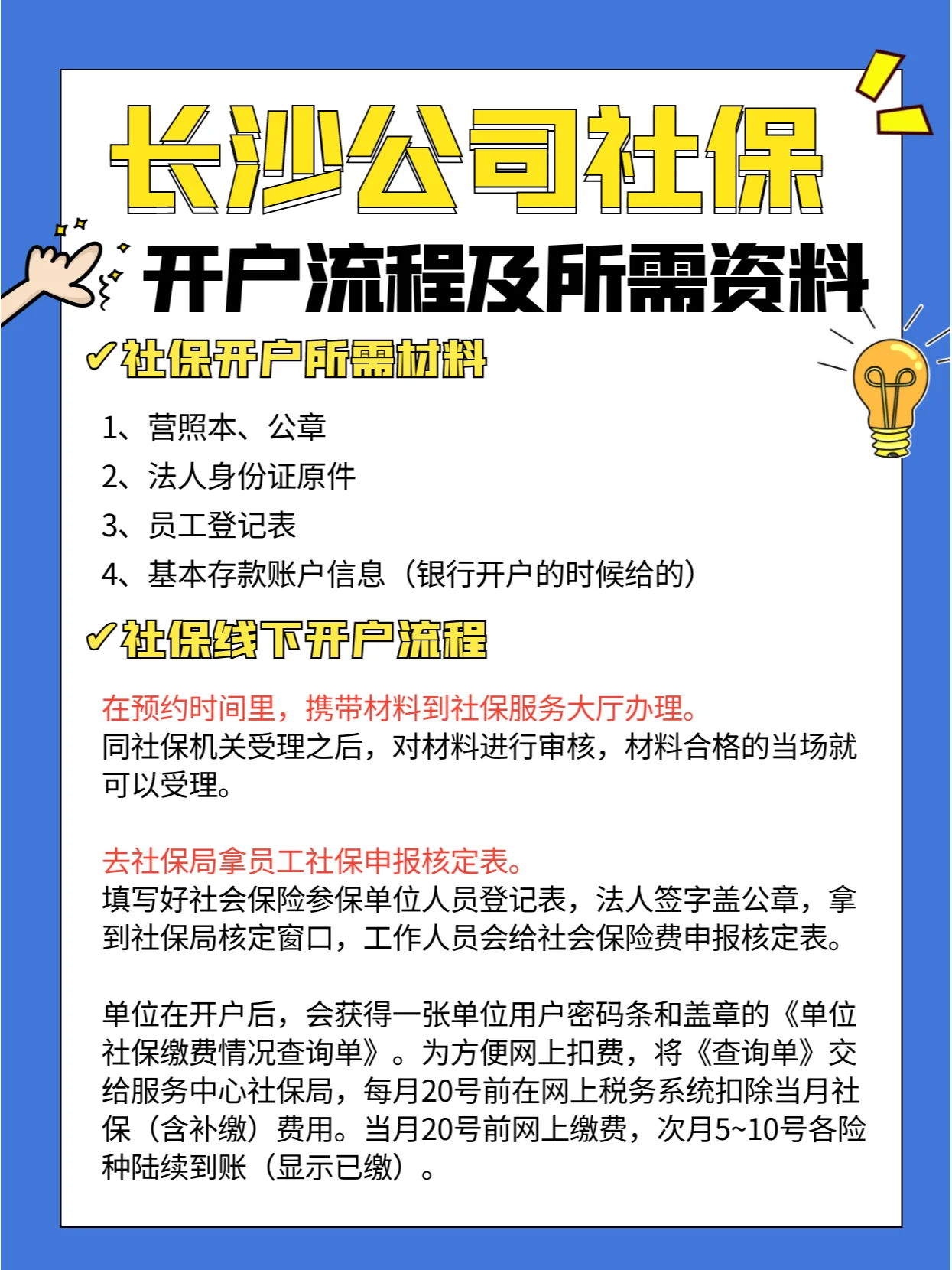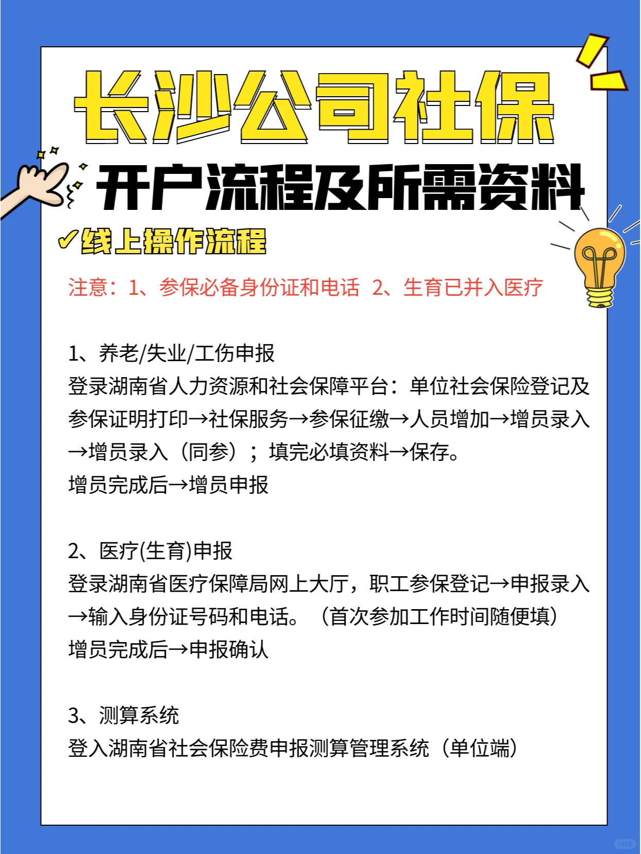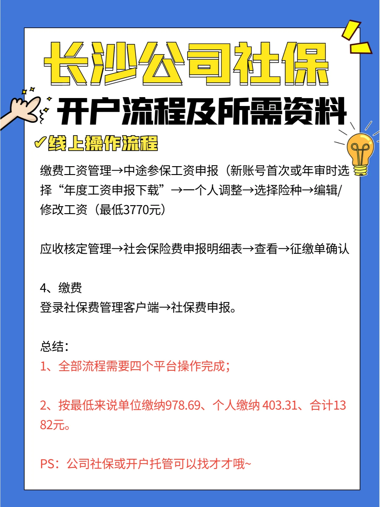 开立社会保障账户所需材料 : 1.营业执照及公章 2.法人身份证原件 3.员工登记表 4.基本存款账户信息(开立银行账户时提供) 社保离线开户流程 在预约时间内,将材料带到社保服务大厅办理。 社保经办机构受理后,对材料进行审核,符合标准的可当场受理。 到社保局领取员工社保申报验证表。 填写社会保险参保单位人员登记表,由法定代表人签字并加盖公章,带到社会保险局核定窗口。工作人员将提供社会保险费申报验证表。 开户后,单位将收到一个用户密码和一份盖章的“单位社保缴费情况查询表”。为方便网上扣款,向服务中心社保局提交《查询表》,每月20日前在网上税务系统中扣除每月社保(含补缴)费用。网上支付应在当月20日前进行,所有类型的保险应在当月5日至次月10日(显示为已支付)陆续贷记。 在线操作流程 注意:1。参加保险的基本身份证和电话号码 2.生育能力已纳入医疗保健 退休/失业/工伤申报 登录湖南省人力资源和社会保障平台:单位社会保险登记和参保证明打印->社保服务->保险征缴->人员增加->报名录入->报名录入(同参考);填写所需信息→ 拯救 招聘完成后→ 招聘申请 医疗(产妇)申报 登录湖南省医疗保障局网上大厅,办理参保登记→ 申报和录入→ 输入身份证号码和电话号码。(随机填写第一个工作时间) 人员添加完成后→ 申报确认 计算系统 登录湖南省社会保险费申报计算管理系统(单位端) 支付工资管理→ 中途保险薪资申报(首次开户或年审选择“年薪申报下载”)→ 个人调整→ 选择保险类型→ 编辑/修改工资(最低3770元) 应收账款核销管理→ 社会保险费申报明细表→ 看法→ 收款单确认 缴费:登录社保费管理客户端→ 社保费申报。 总结 1.整个过程需要完成四个平台操作; 2.最低由单位支付978.69元,个人支付403.31元,合计1382元。