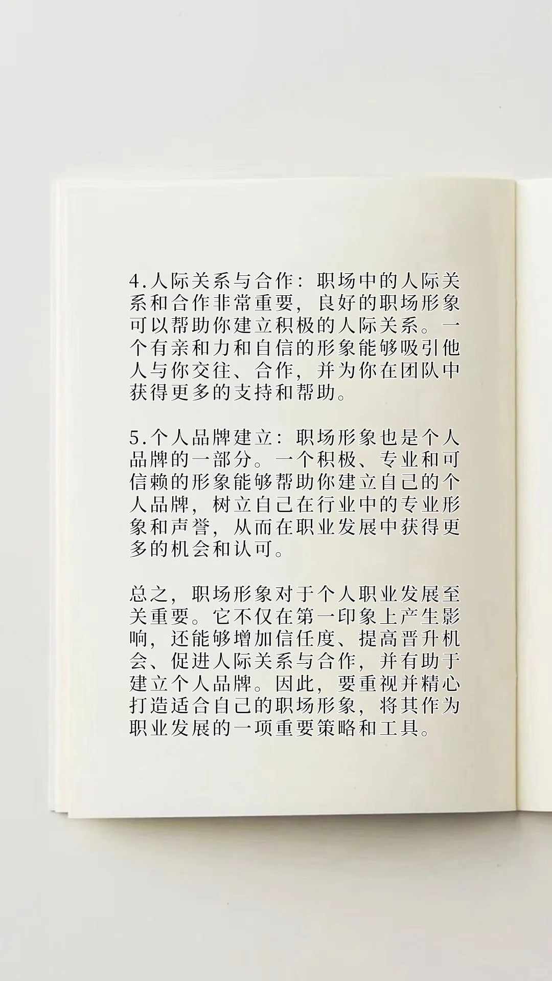 工作场所形象对个人职业发展非常重要,因为它可能会产生以下影响: 1.第一印象:职场形象是别人对你的第一印象,第一印象往往会在人们的脑海中留下深刻的印象。干净、专业、自信的形象可以给你留下良好的第一印象,并为你赢得更多的机会。 2.职业信任:一个合适的职场形象可以增加他人对你的信任。通过展示你的职业形象,其他人更有可能相信你有能力完成工作任务,更愿意与你合作并委派责任。 3.晋升机会:在职场上,个人的职业发展和晋升往往需要得到公司和上级的认可。良好的职场形象可以增强你的竞争力,使你更有可能获得晋升机会。因为在职场中,形象不仅代表外在的美,也代表你的专业能力、能力和态度。 4、人际关系与合作:人际关系和合作在职场中非常重要,良好的职场形象可以帮助你建立积极的人际关系。友好自信的形象可以吸引其他人与你互动和合作,并在团队中为你提供更多的支持和帮助。 5.个人品牌建设:职场形象也是个人品牌建设的一部分。一个积极、专业、值得信赖的形象可以帮助你树立个人品牌,在行业中树立专业形象和声誉,并在职业发展中获得更多机会和认可。 简而言之,职场形象对个人职业发展至关重要。它不仅能影响第一印象,还能增加信任,增加晋升机会,促进人际关系和合作,并有助于建立个人品牌。因此,重视并精心塑造合适的职场形象是职业发展的重要战略和工具,这一点很重要。