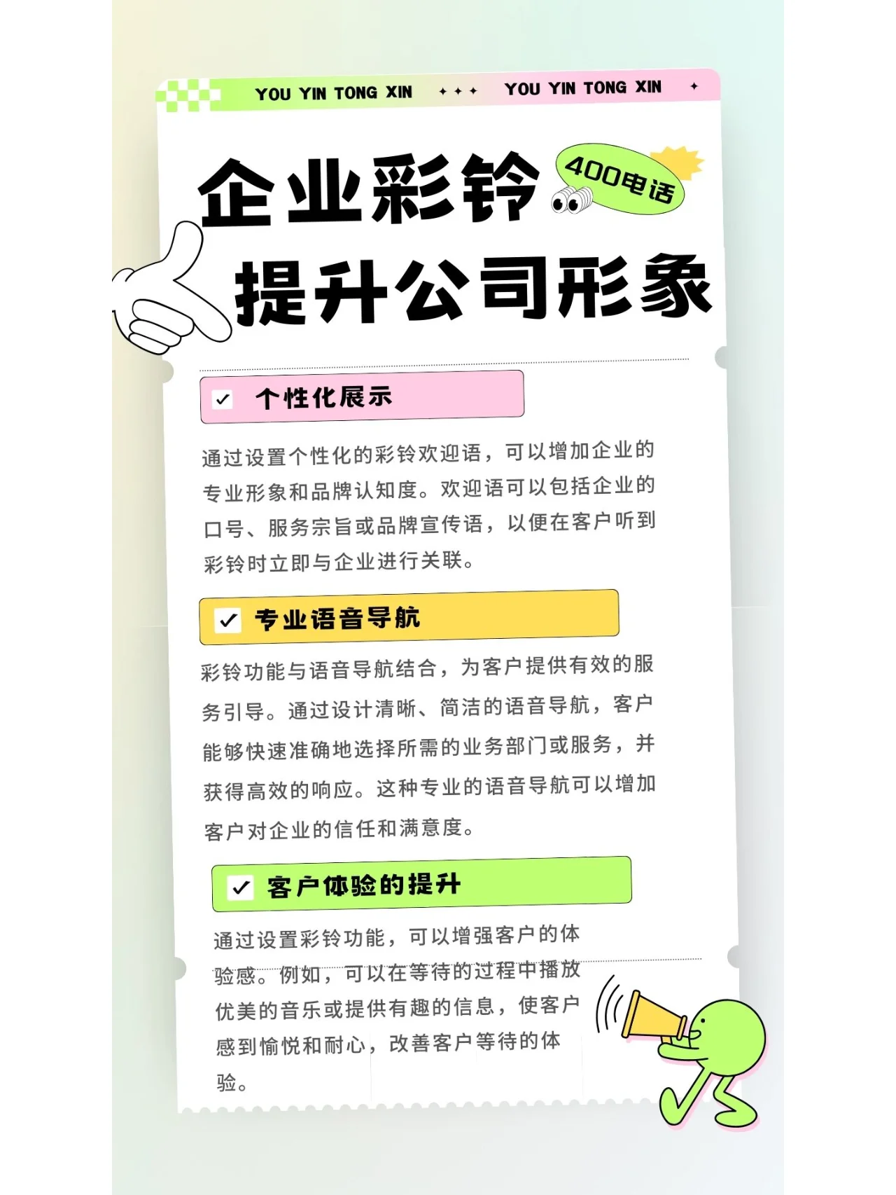 通过设置个性化的铃声欢迎信息,可以提高公司的专业形象和品牌知名度。欢迎信息可以包括公司的口号、服务目的或品牌口号,以便在客户听到铃声时立即与公司联系。 铃声功能与语音导航相结合,为客户提供有效的服务指导。通过设计清晰简洁的语音导航,客户可以快速准确地选择所需的业务部门或服务,并获得高效的响应。这种专业的语音导航可以增加客户对企业的信任和满意度。 通过设置铃声功能,可以增强客户的体验。例如,在等待时可以播放优美的音乐或有趣的信息,让客户感到快乐和耐心,提高他们的等待体验。