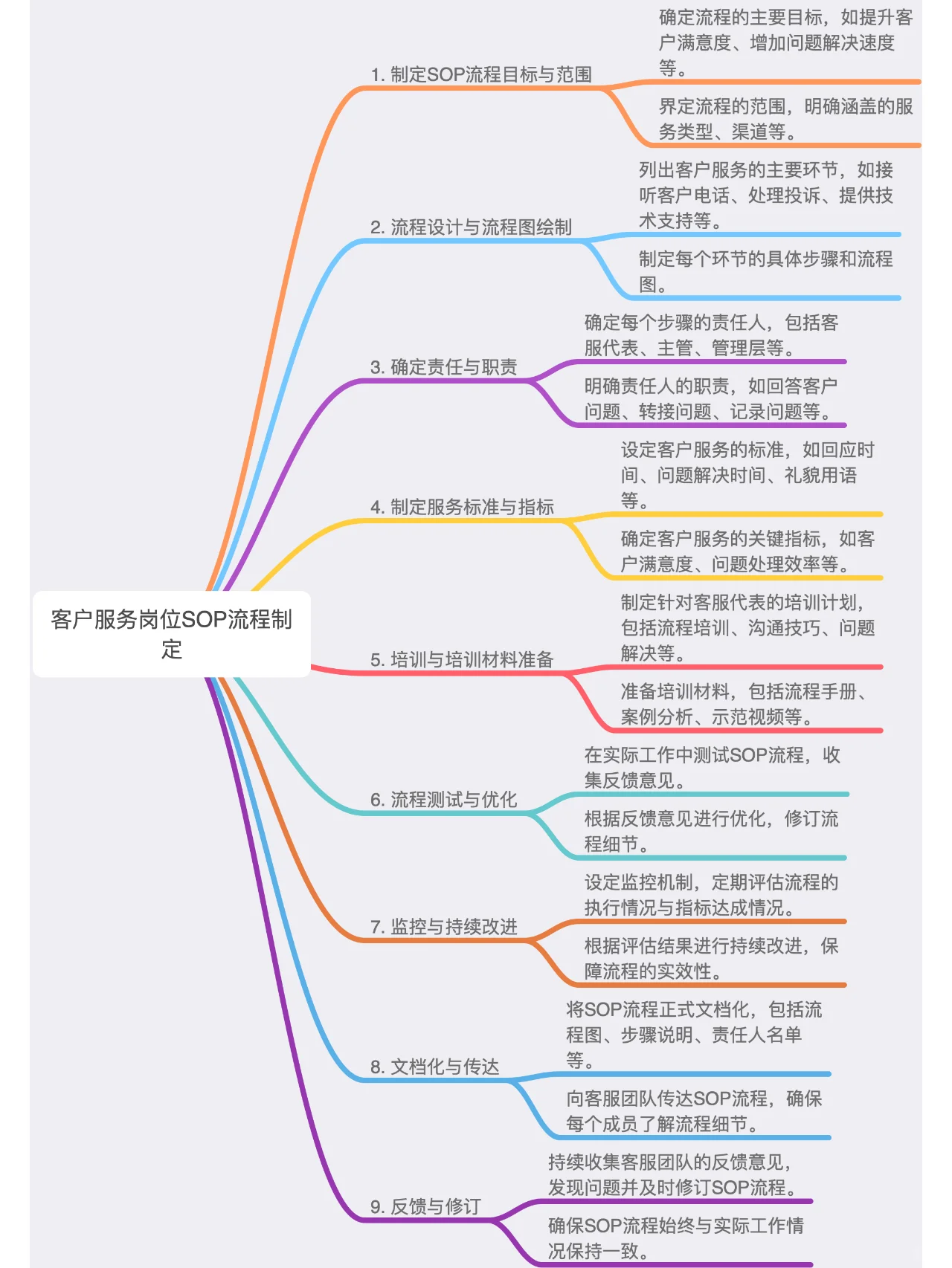 今天,我想和大家谈谈如何在客服岗位上建立高效的SOP流程!随着公司业务的发展,建立SOP流程变得尤为重要,以确保每个客户都能享受到一致和高质量的服务。别担心,跟着我一步一个脚印,让您的客服团队成为服务明星! 1.设定目标和范围 首先,明确制定SOP的目标很重要吗是为了提高客户满意度还是加快解决问题的速度接下来,定义SOP涵盖的范围并确定服务类型、渠道等。这一步骤是制定SOP的基石,必须仔细考虑! 2.设计过程及流程图 不同的服务流程需要不同的步骤,如接听电话、处理投诉、提供技术支持等。将这些步骤细化为清晰的步骤,并用流程图直观地呈现出来,将使流程更易于理解和执行 3.明确分工和职责 每个步骤都需要一个负责人,可能是客户服务代表、主管或管理层。明确责任人的责任、如何回答客户问题、如何转移问题等,有助于确保每一步都得到妥善处理。 4.制定服务标准和指标 为了确保一致性,制定明确的服务标准至关重要。反应时间、解决问题的时间、礼貌用语等都可以作为标准。同时,制定关键指标,如客户满意度和解决问题的效率,可以帮助评估流程的有效性。 5.培训和持续改进 制定SOP后,制定培训计划,准备培训材料,确保每位客服代表理解并掌握SOP。在实际工作中,持续监控流程的执行情况,收集反馈,根据反馈进行优化和改进,并确保流程始终保持高效。 无论是小团队还是大企业,全面的客户服务SOP流程都能给客户带来更好的体验,也能提高团队效率。现在就开始开发您的SOP,让您的客服团队成为用户心中的VIP!